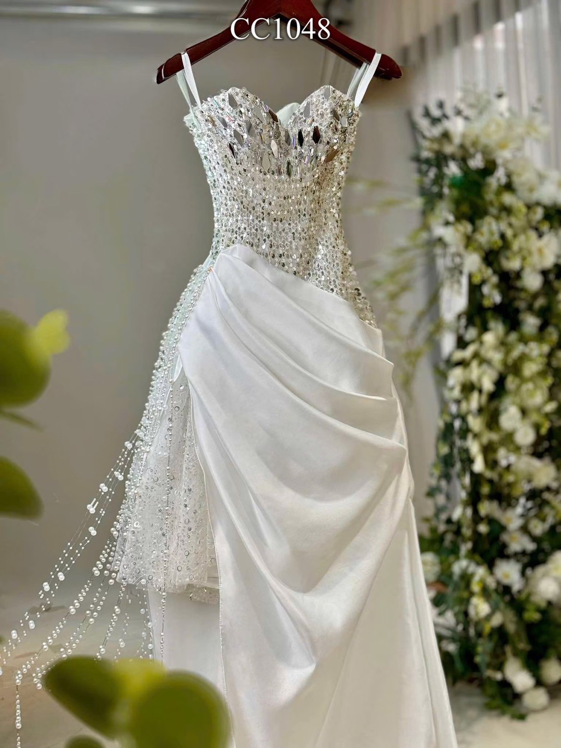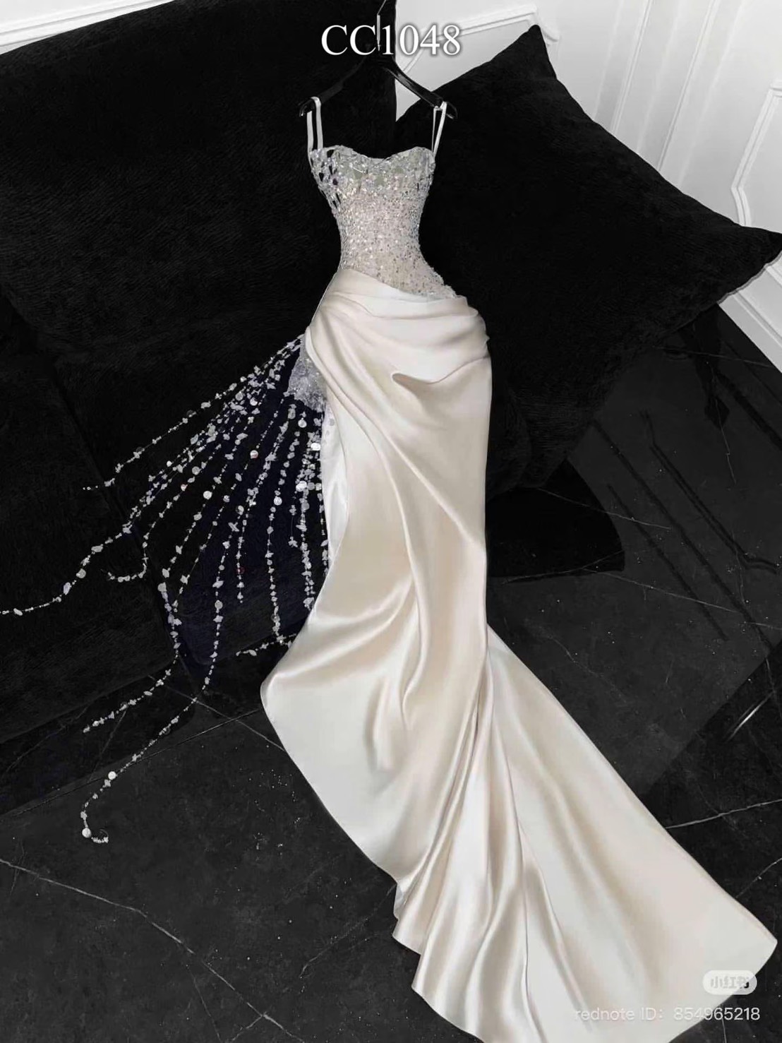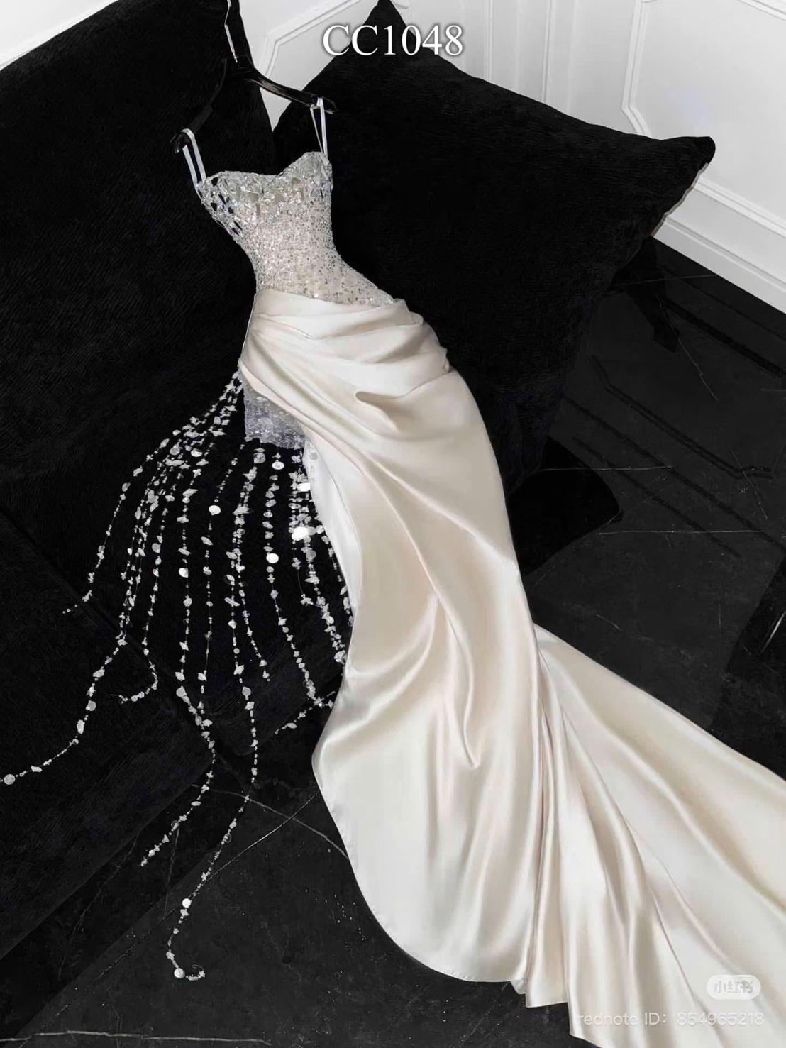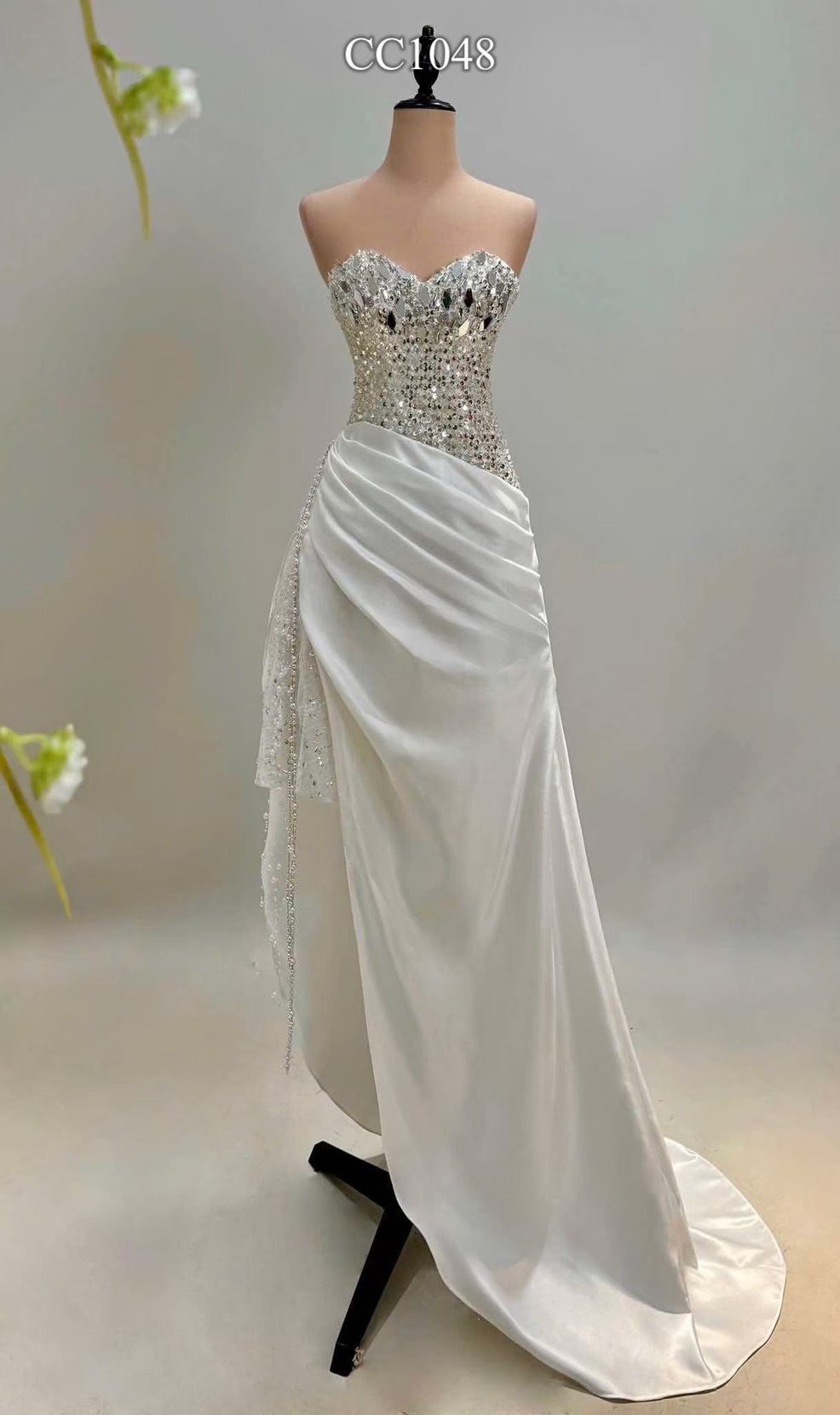 ชุดราตรียาว เกาะอก แต่งเพชร+กลิตเตอร์ สีขาว 3008 Size M