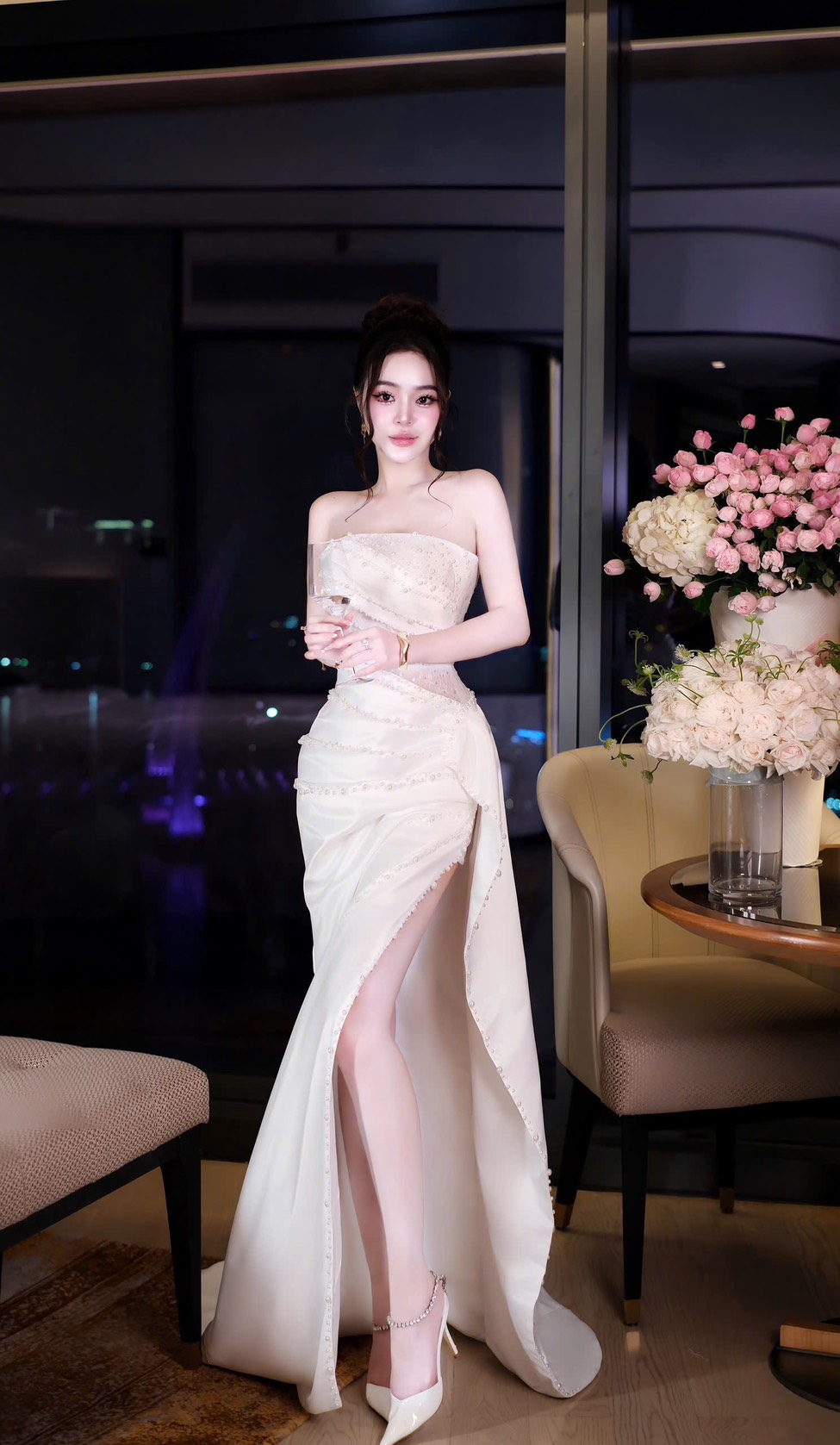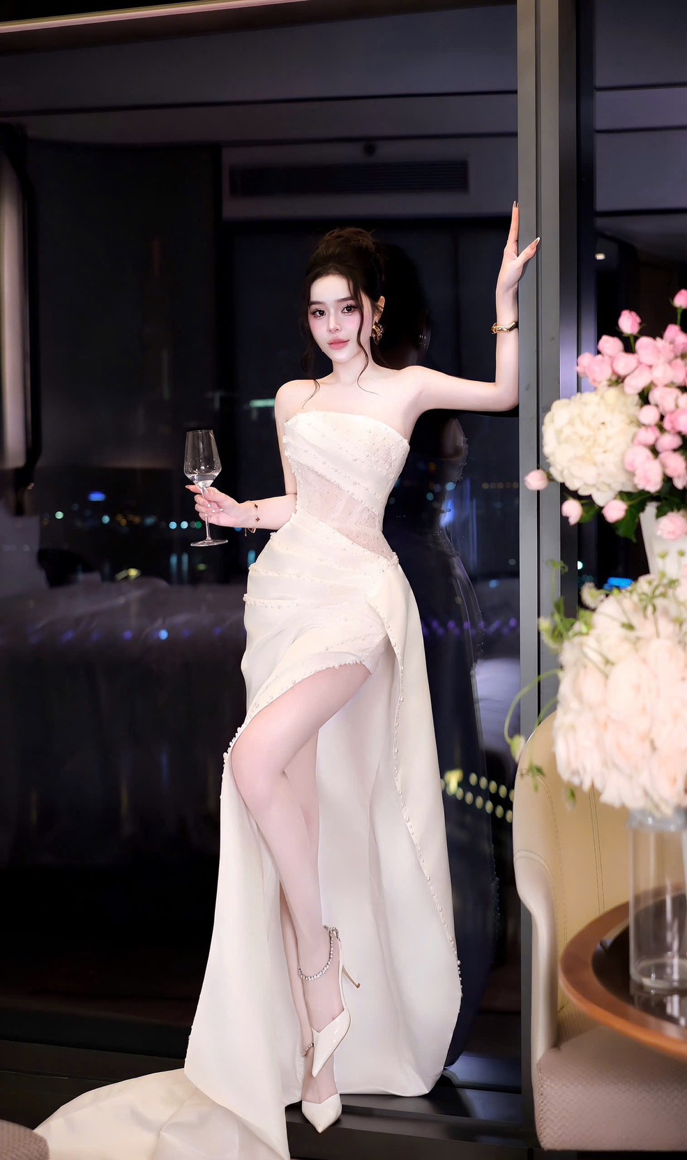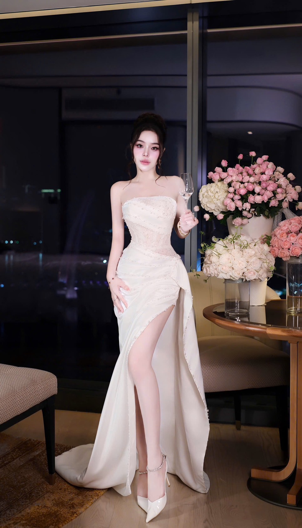 ชุดราตรียาว เกาะอก แต่งเพชร หางยาว สีขาว 3002 Size S