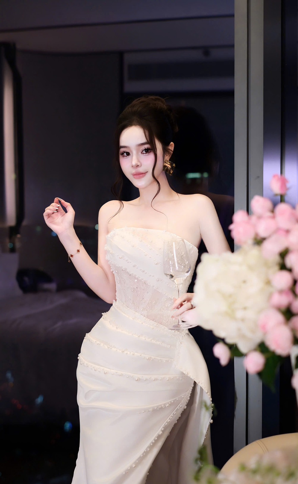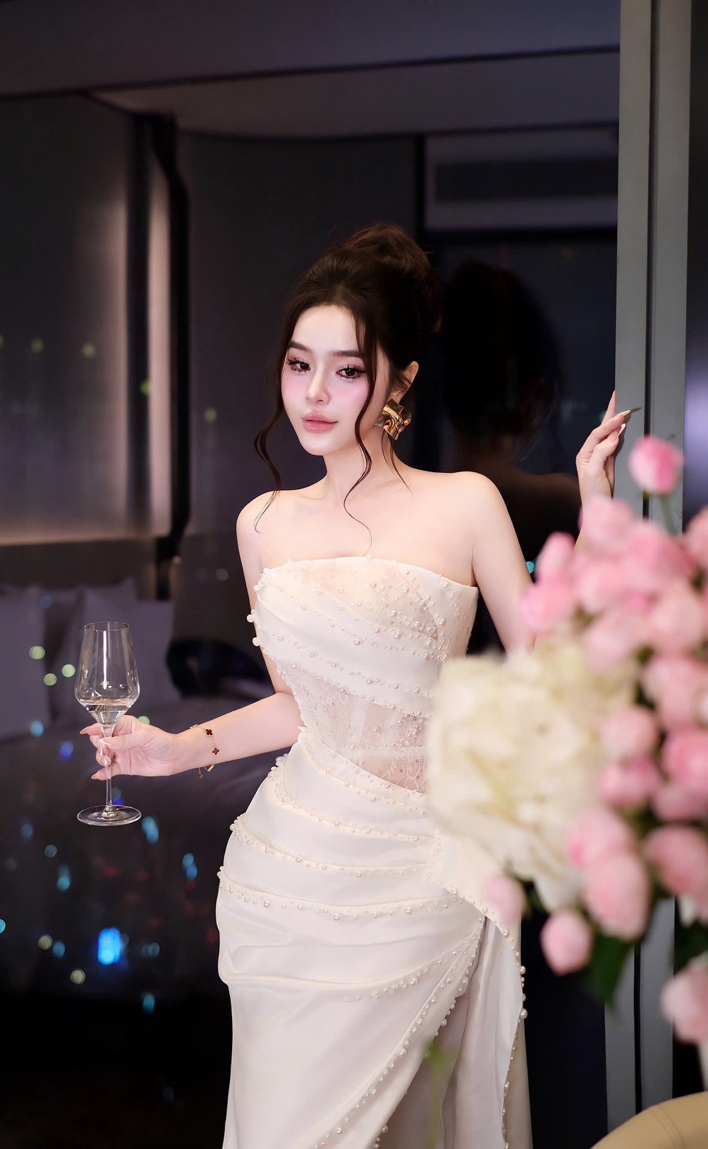 ชุดราตรียาว เกาะอก แต่งเพชร+กลิตเตอร์ สีขาว 3008 Size M