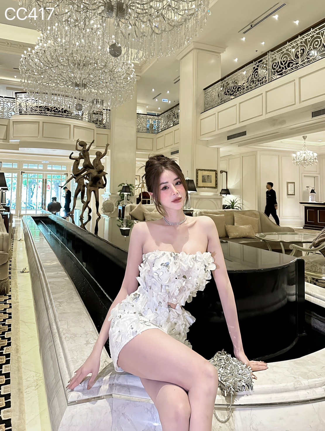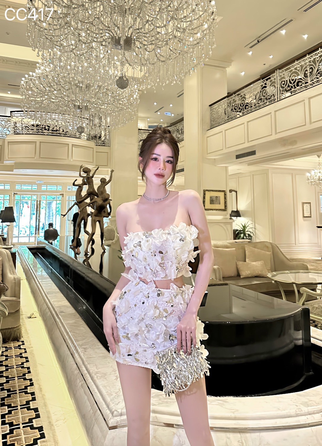 ชุดเซ็ท 2 ชิ้น เสื้อ+กระโปรง แต่งดอก สีขาว 4008 Size S