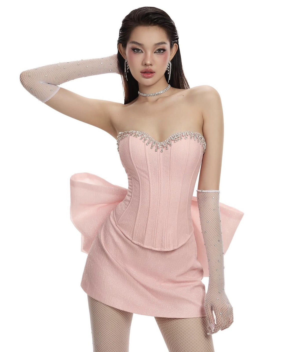 ชุดเซ็ท 3 ชิ้น เกาะอก กลิตเตอร์ แต่งเพรช โบว์ใหญ่ สีชมพู LANE CI 4025 Size S-M