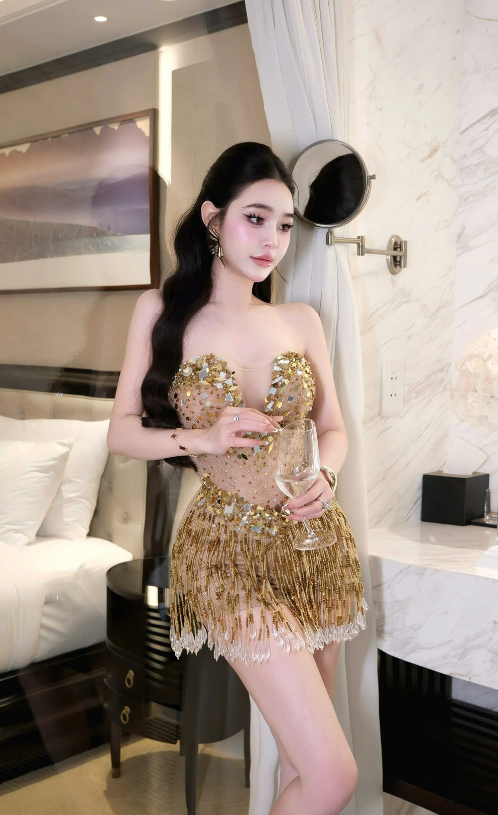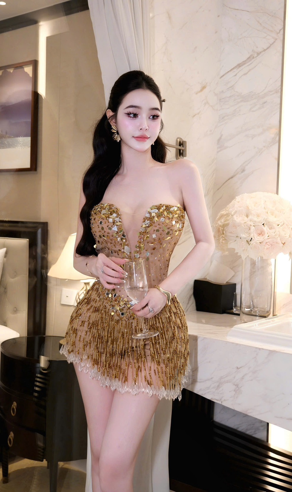 ชุดเดรส กลิตเตอร์ สีน้ำตาล-ทอง Brand HiSo 2213 Size S-M