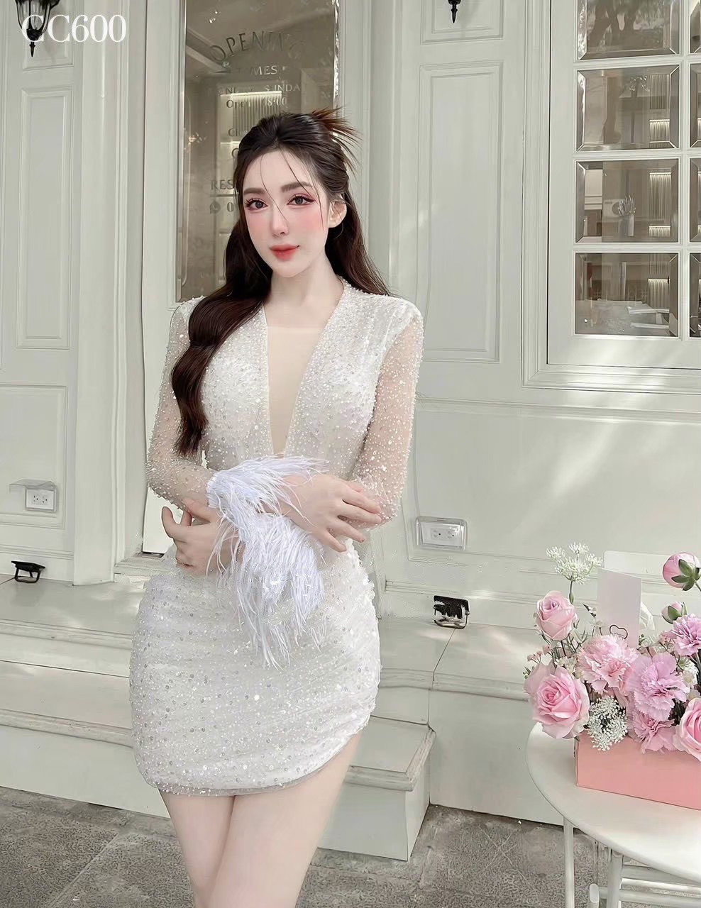 ชุดเดรส กลิตเตอร์ แต่งขน สีขาว 2095 Size M,XXL