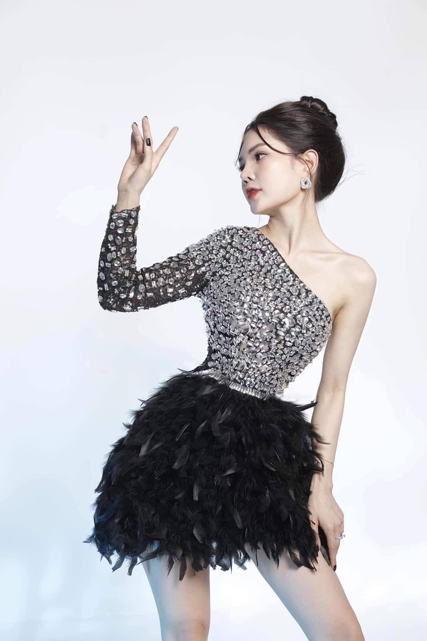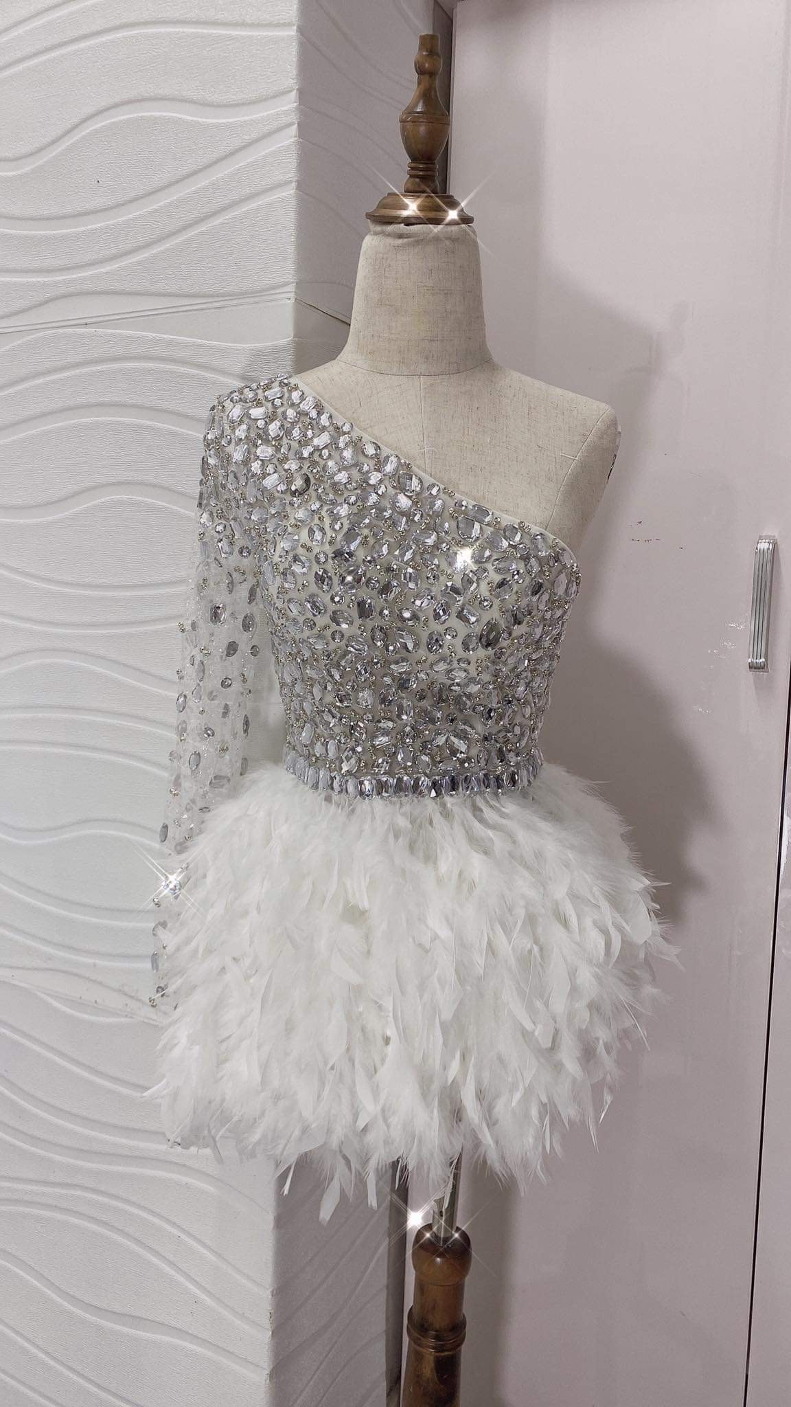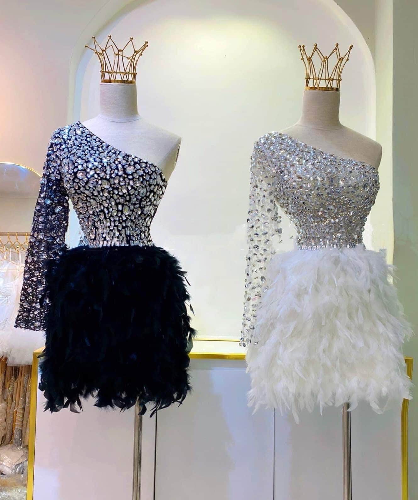 ชุดเดรส ขนนก แต่งเพชร สีขาว สีดำ Brand HiSo 2159 Size S