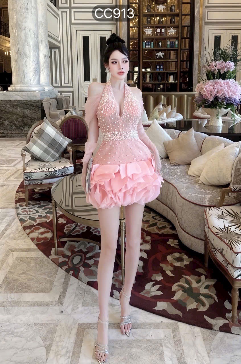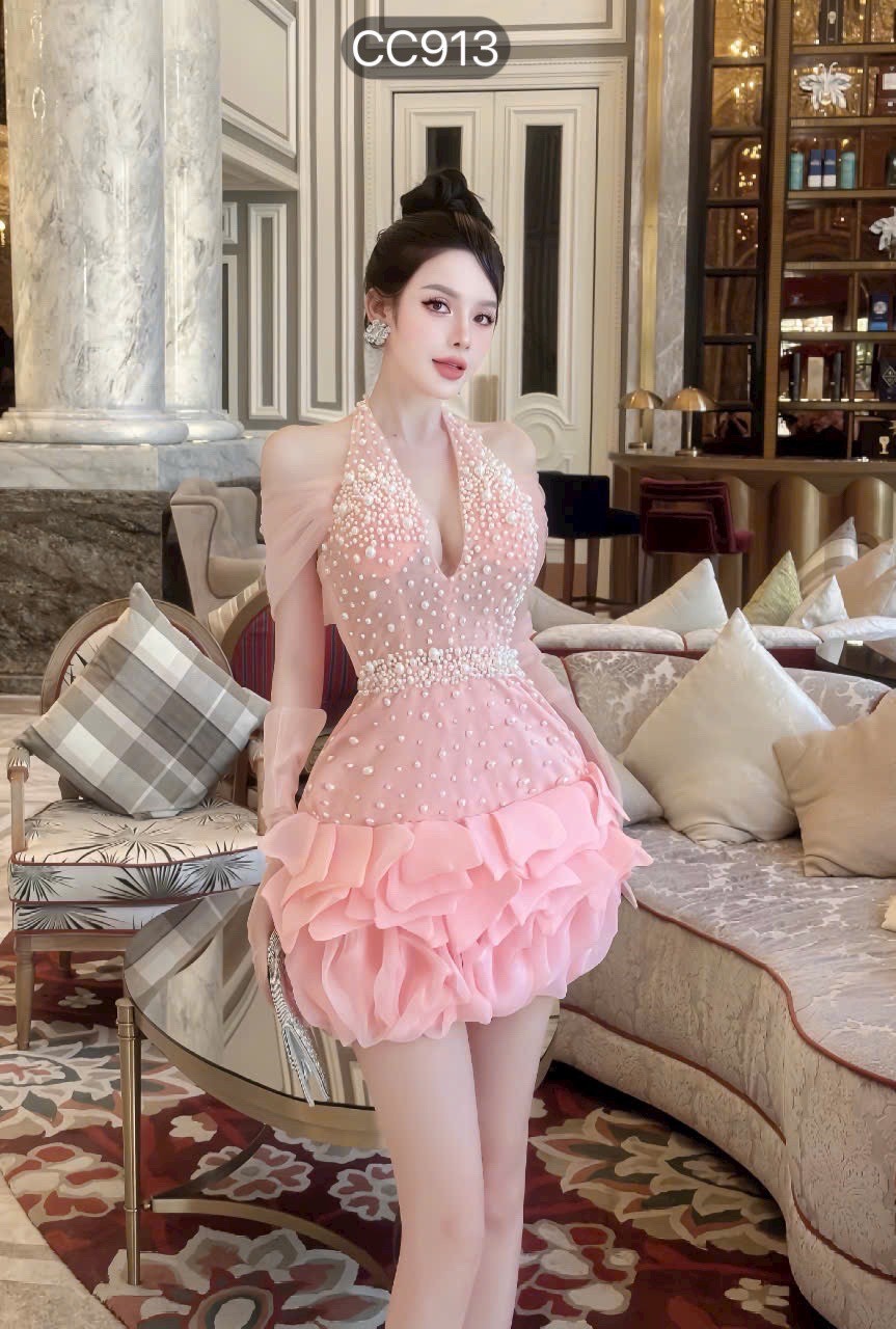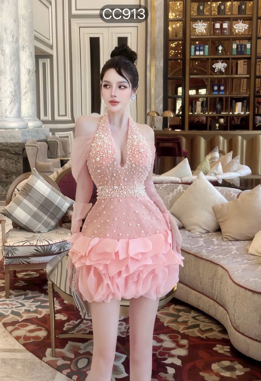 ชุดเดรส คล้องคอแต่งมุก+ถุงมือ สีชมพู Brand HiSo 2145 Size S-M