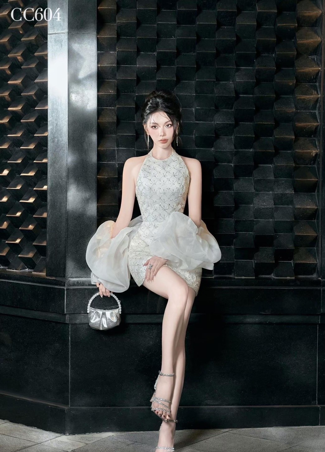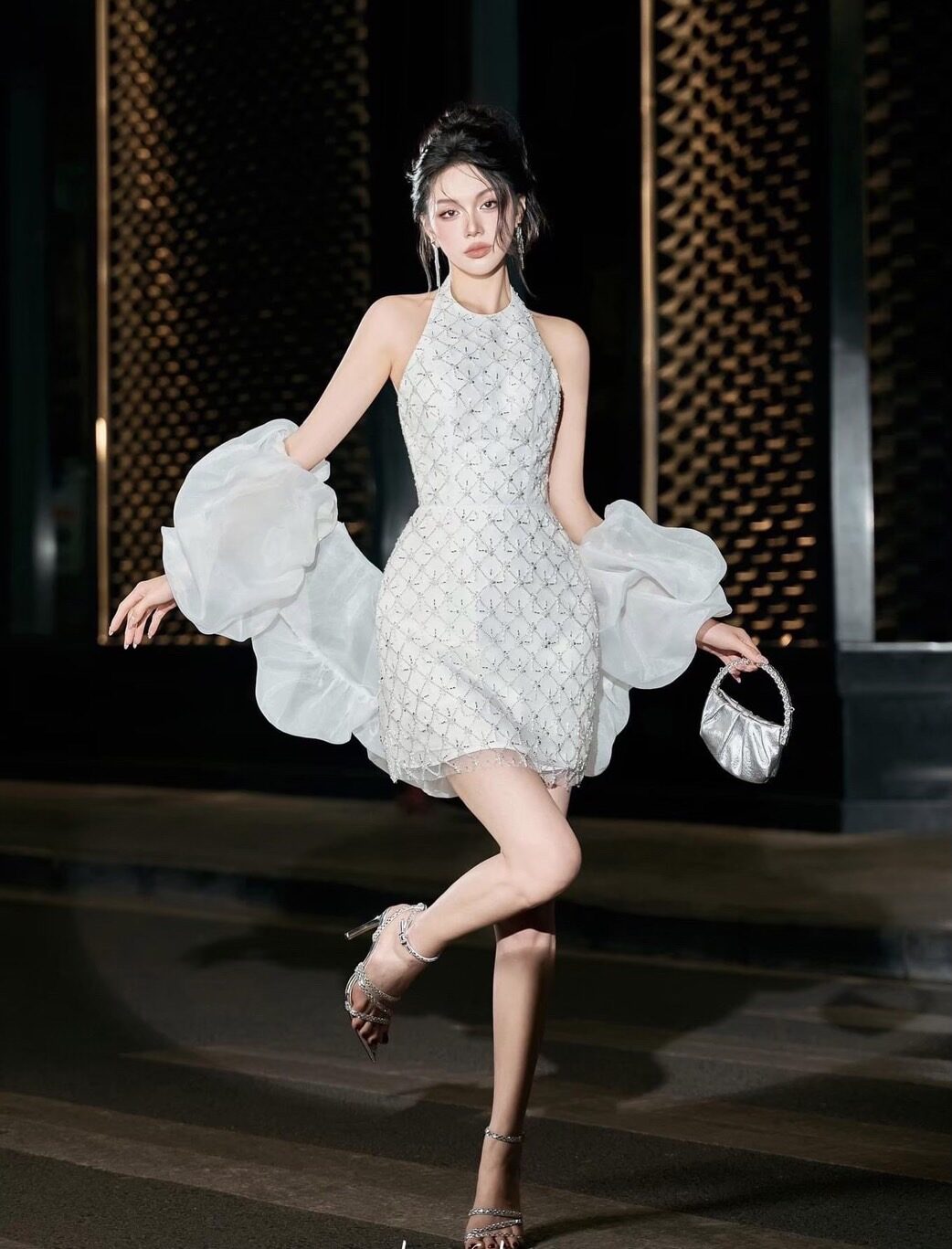 ชุดเดรส คล้องคอ แต่งกลิตเตอร์+แขน สีขาว 2046 Size M