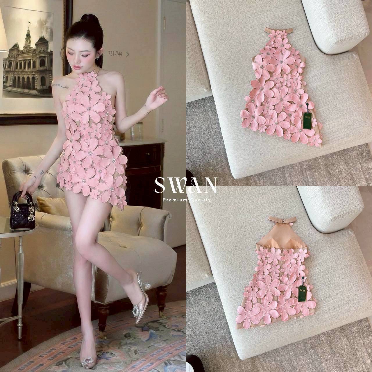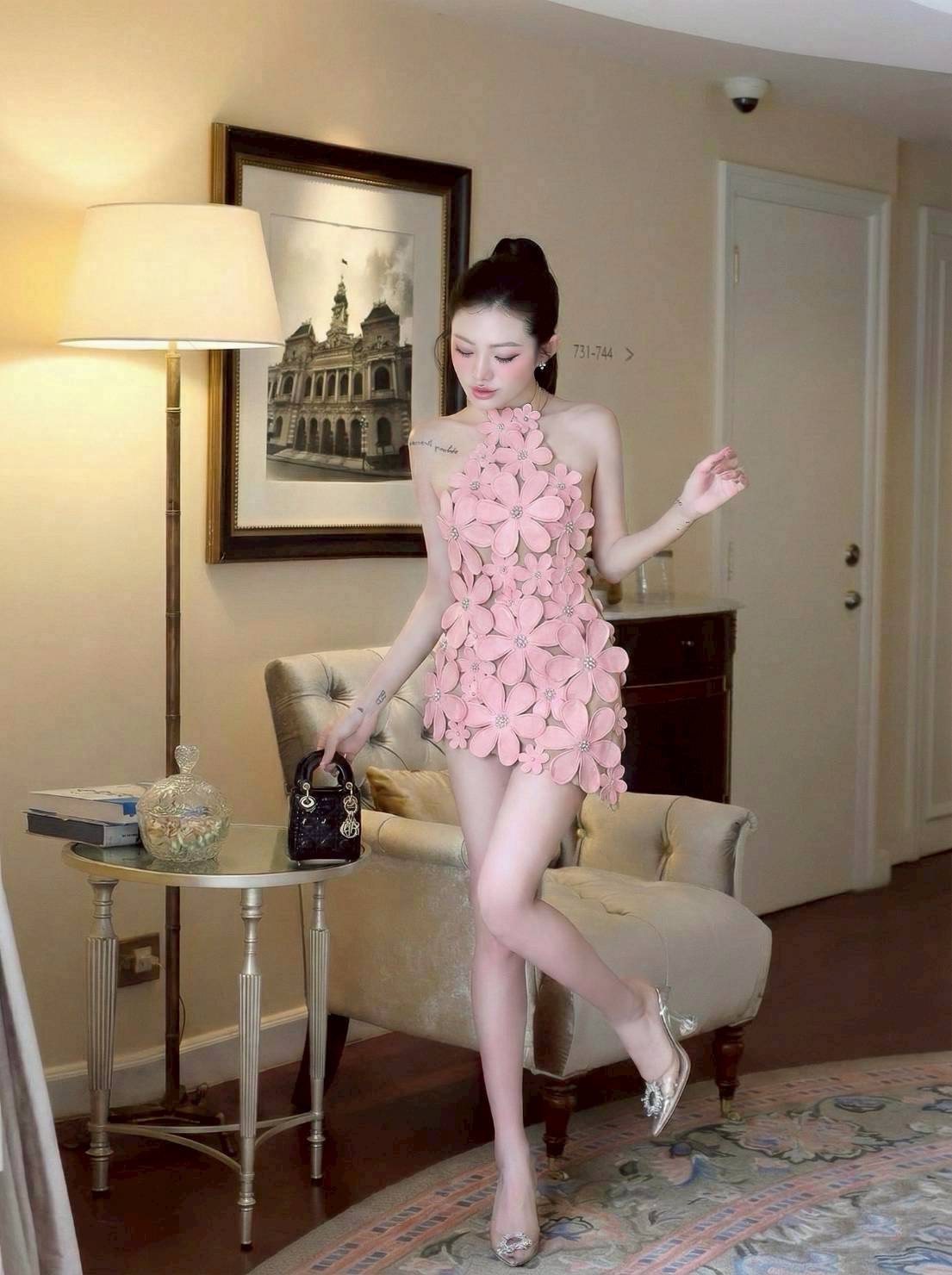 ชุดเดรส ปาดไหล่ แต่งดอก สีชมพู 2008 Size M