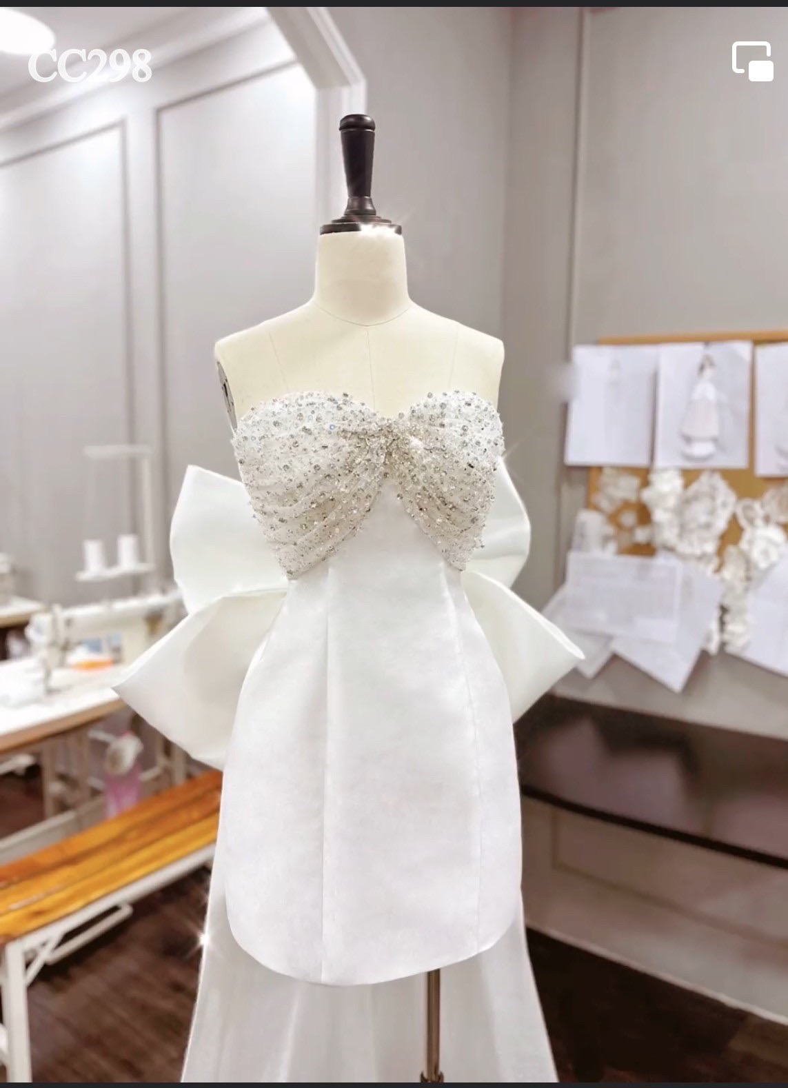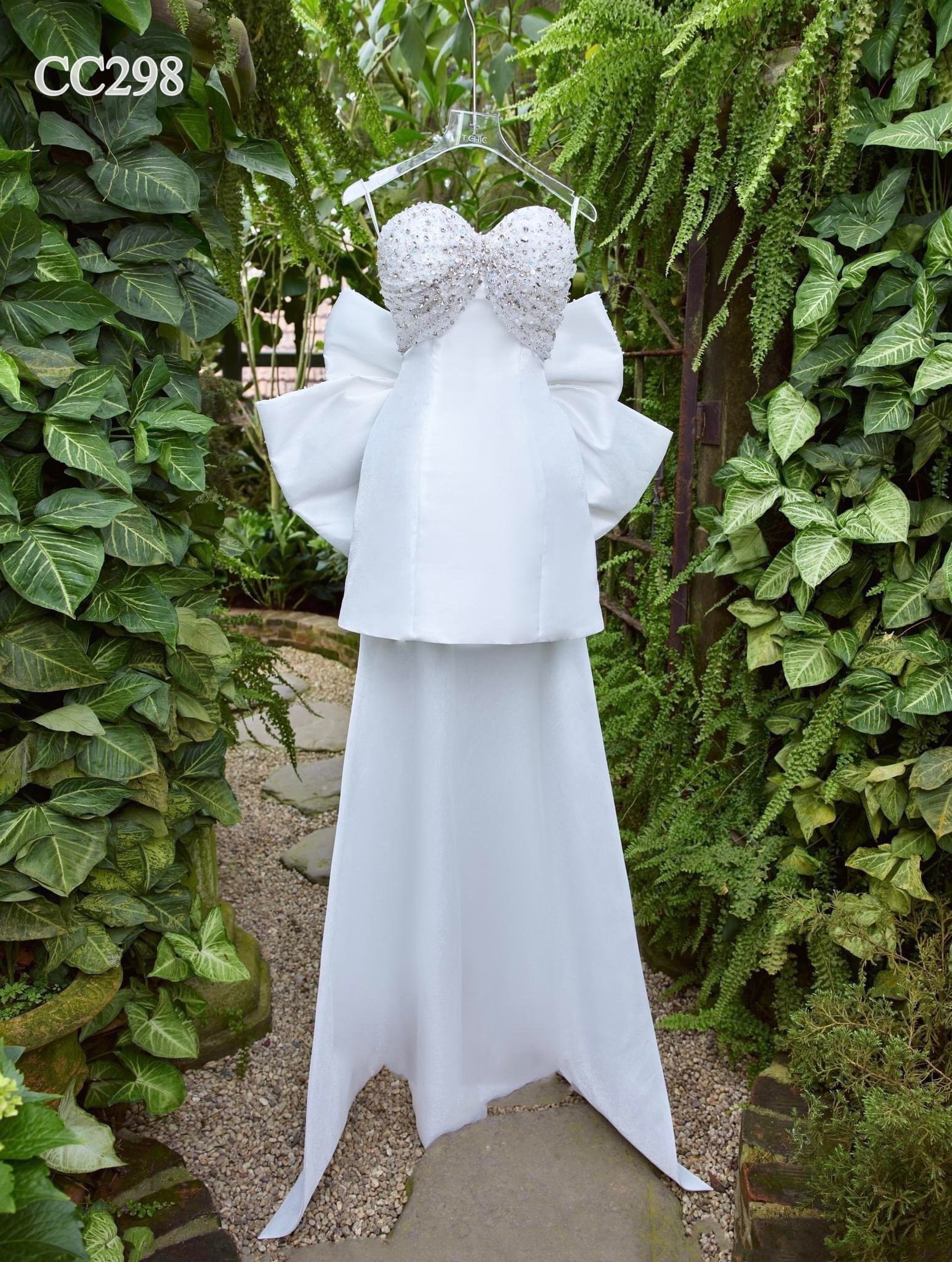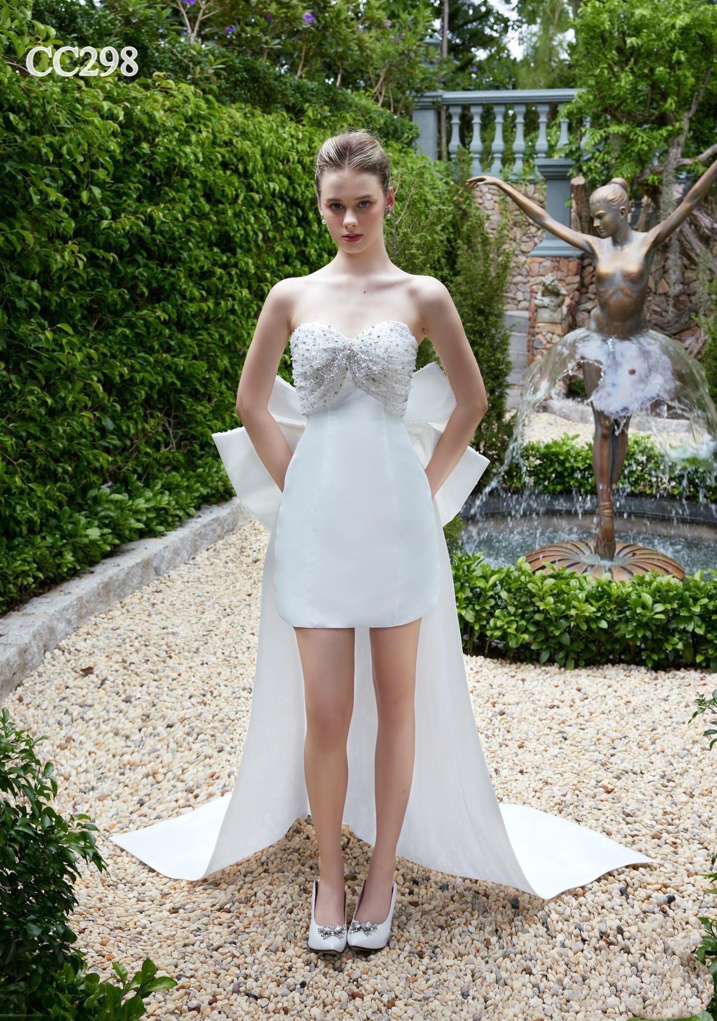 ชุดเดรส ชุดเจ้าสาว เกาะอก แต่งเพชร+โบว์ สีขาว 2118 Size S