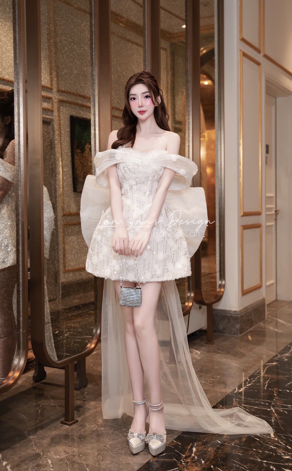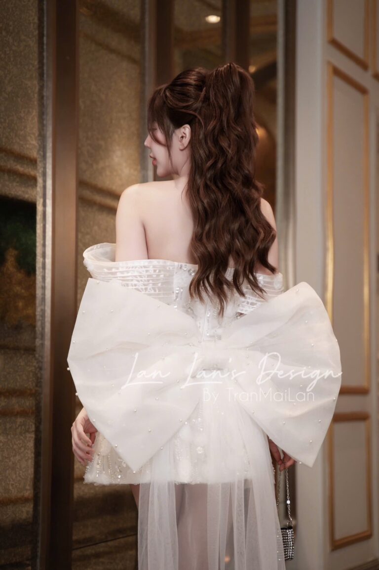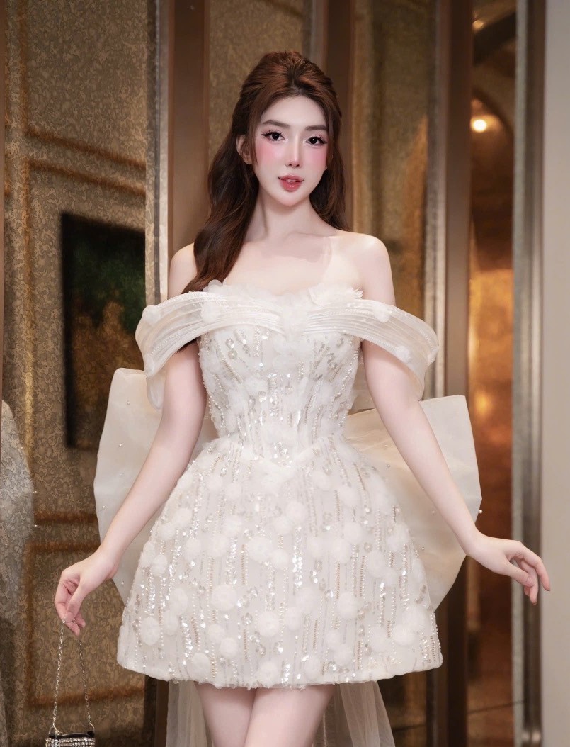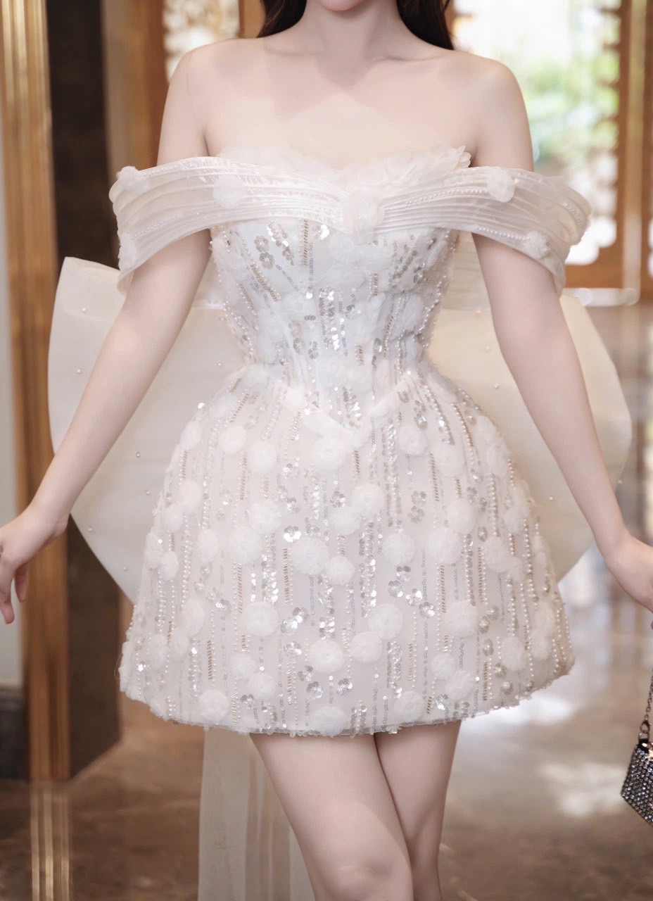 ชุดเดรส เกาะอก แต่งกลิตเตอร์+โบว์ สีขาว 2014 Size S
