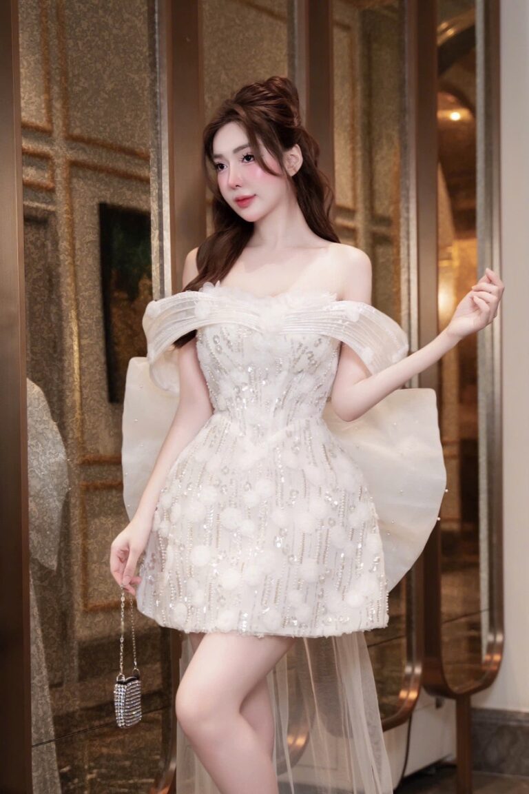 ชุดเดรส ปาดไหล่ แต่งดอก สีขาว-ครีม 2003 Size S