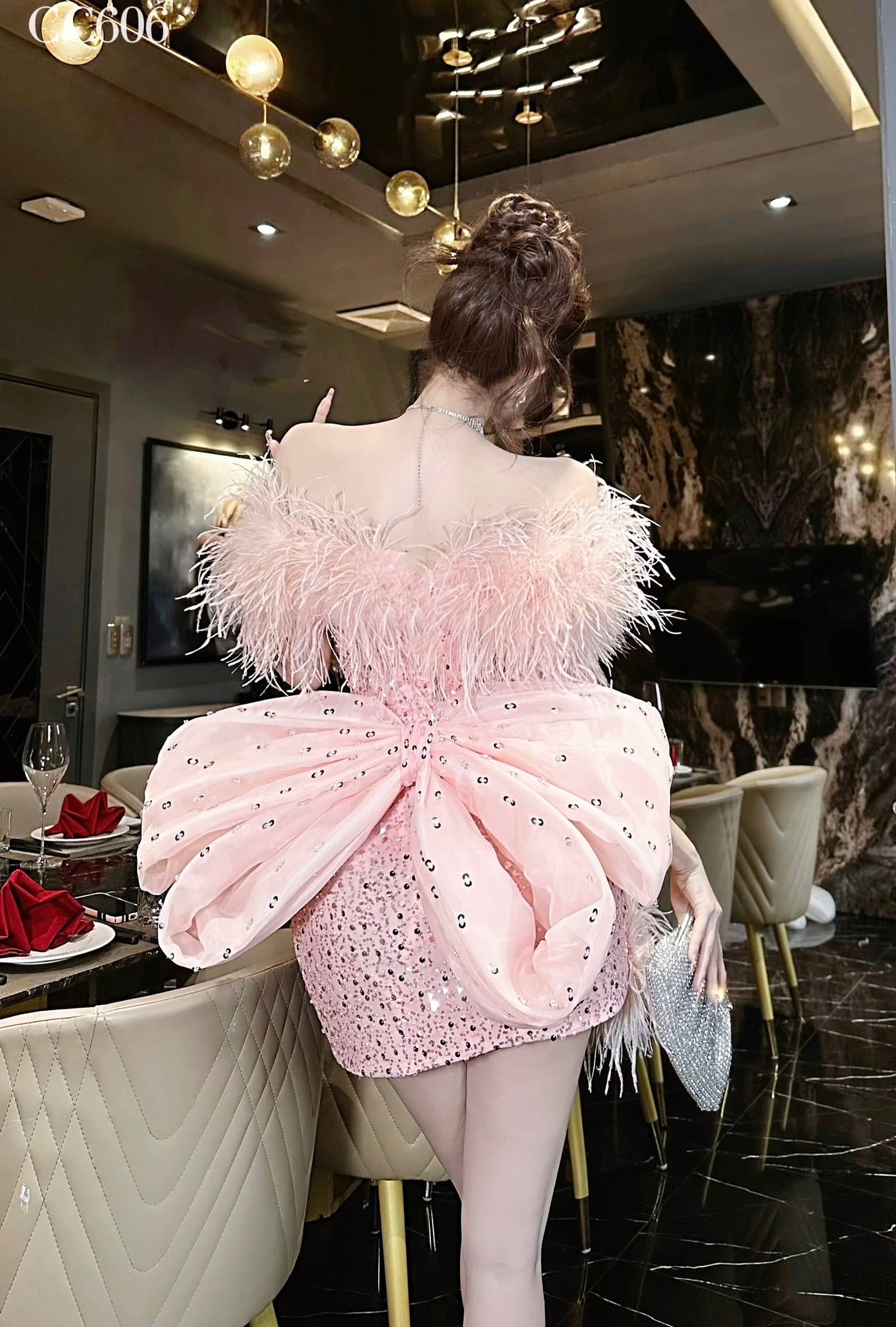 ชุดเดรส ปาดไหล่ ขนนก แต่งกลิตเตอร์ สีชมพู 2098 Size S