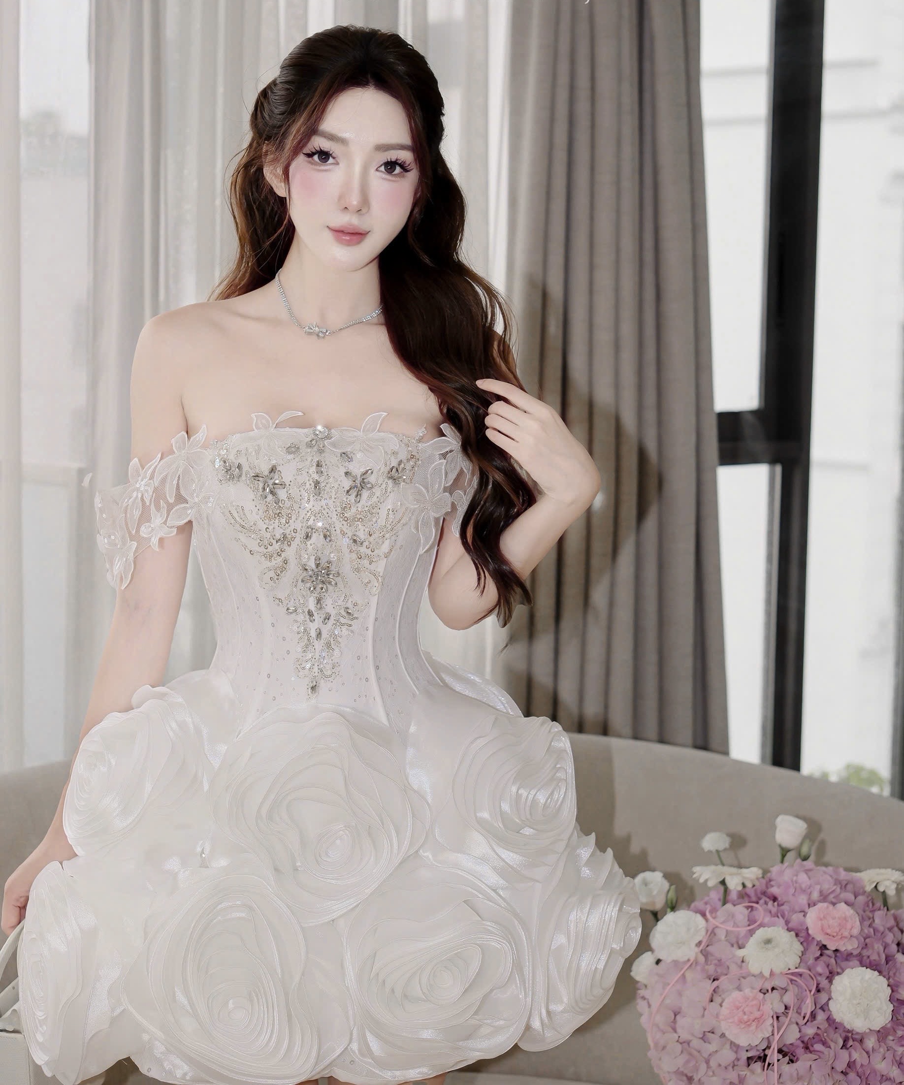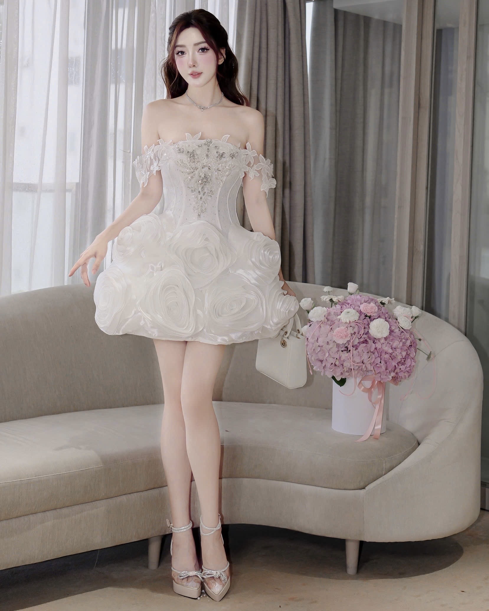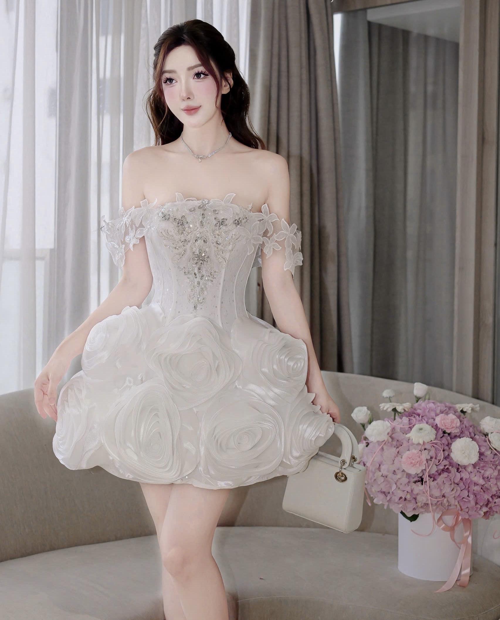 ชุดเดรส ปาดไหล่ แต่งดอก+เพชร สีขาว 2035 Size M