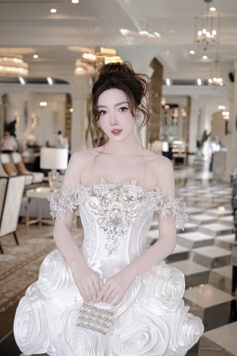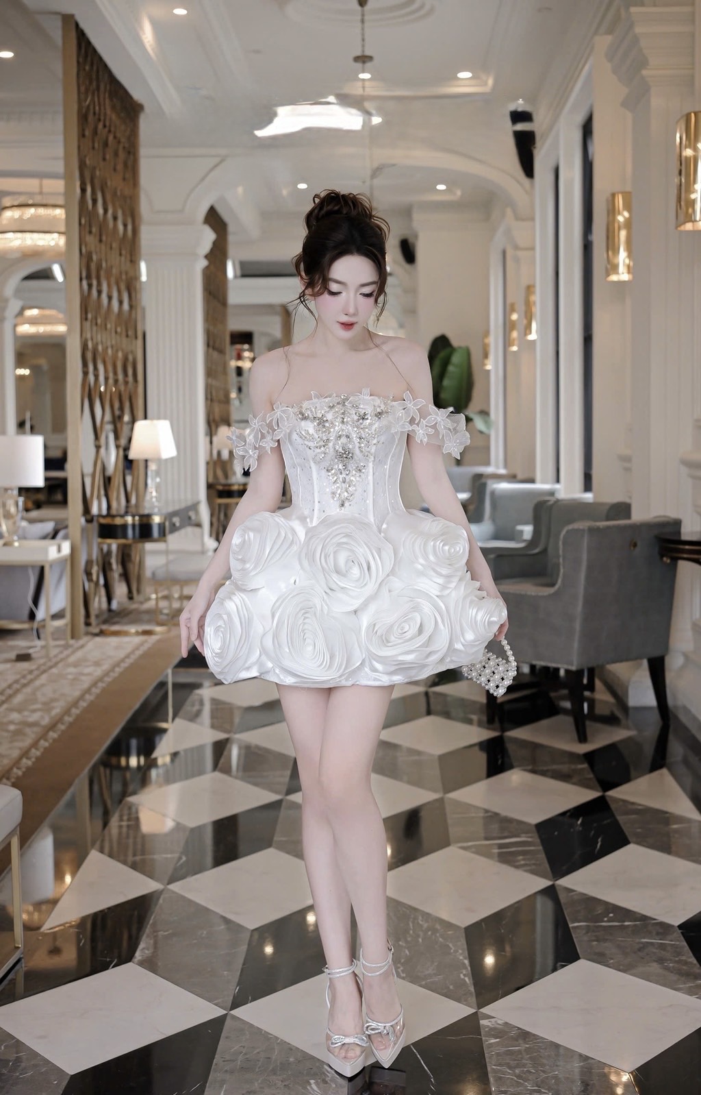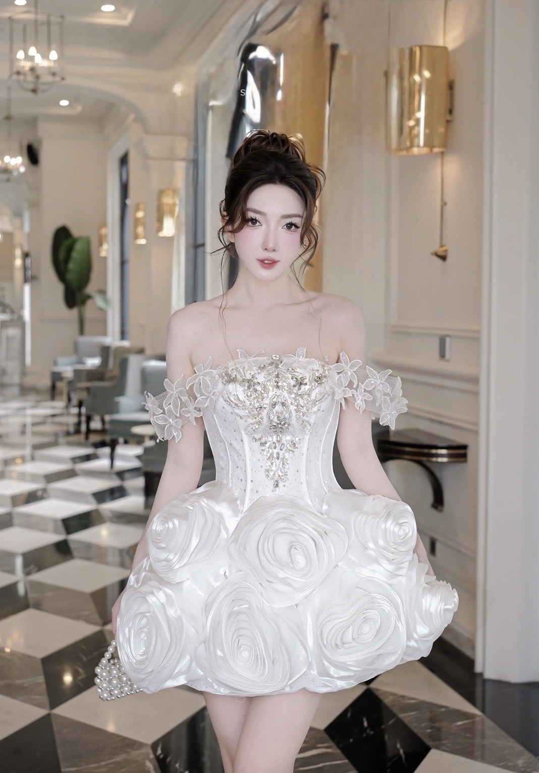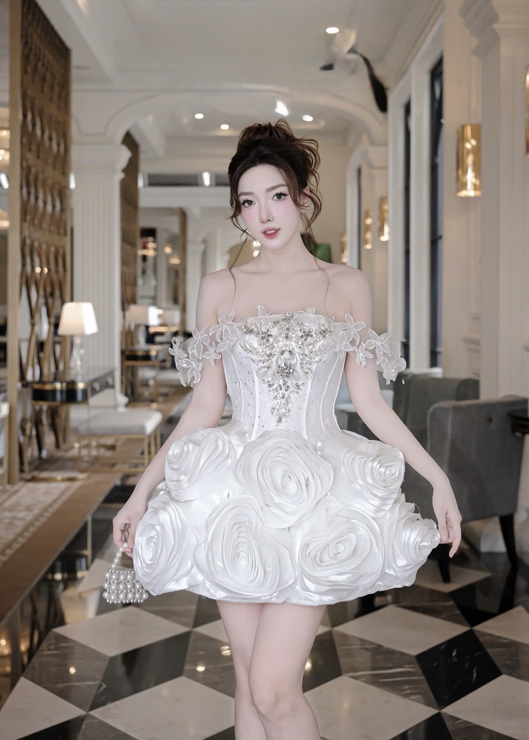ชุดเดรส ปาดไหล่ แต่งดอก+เพชร สีขาว 2035 Size M