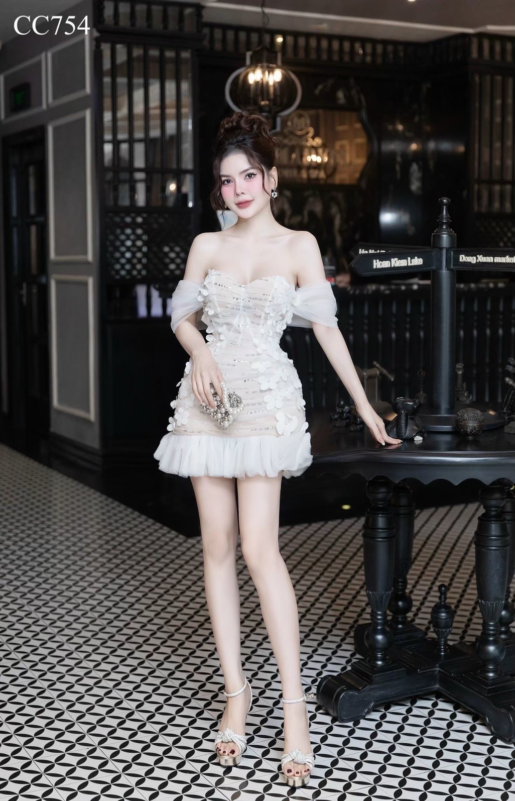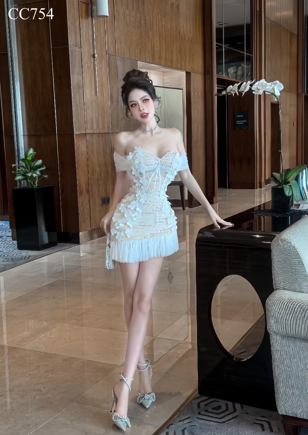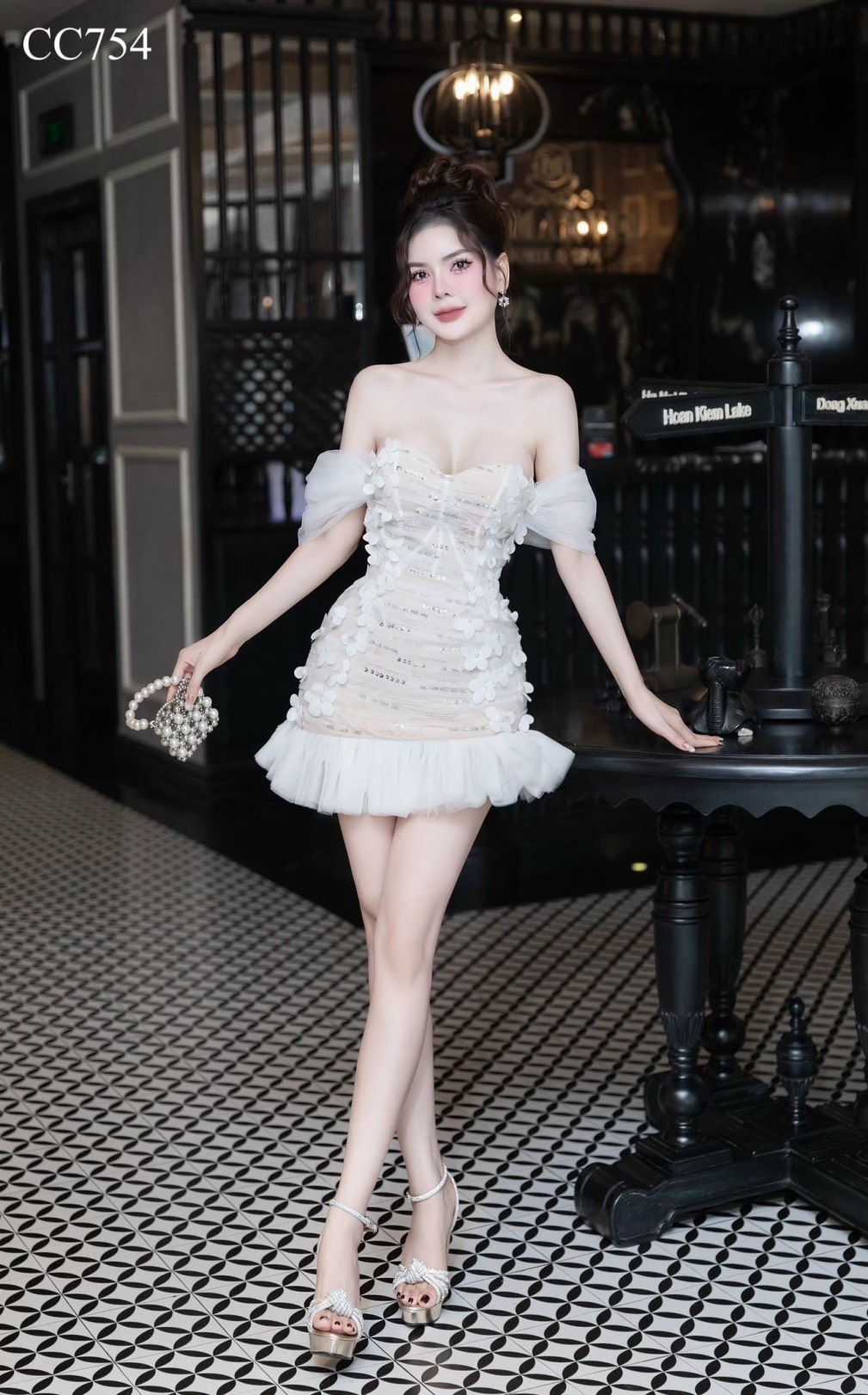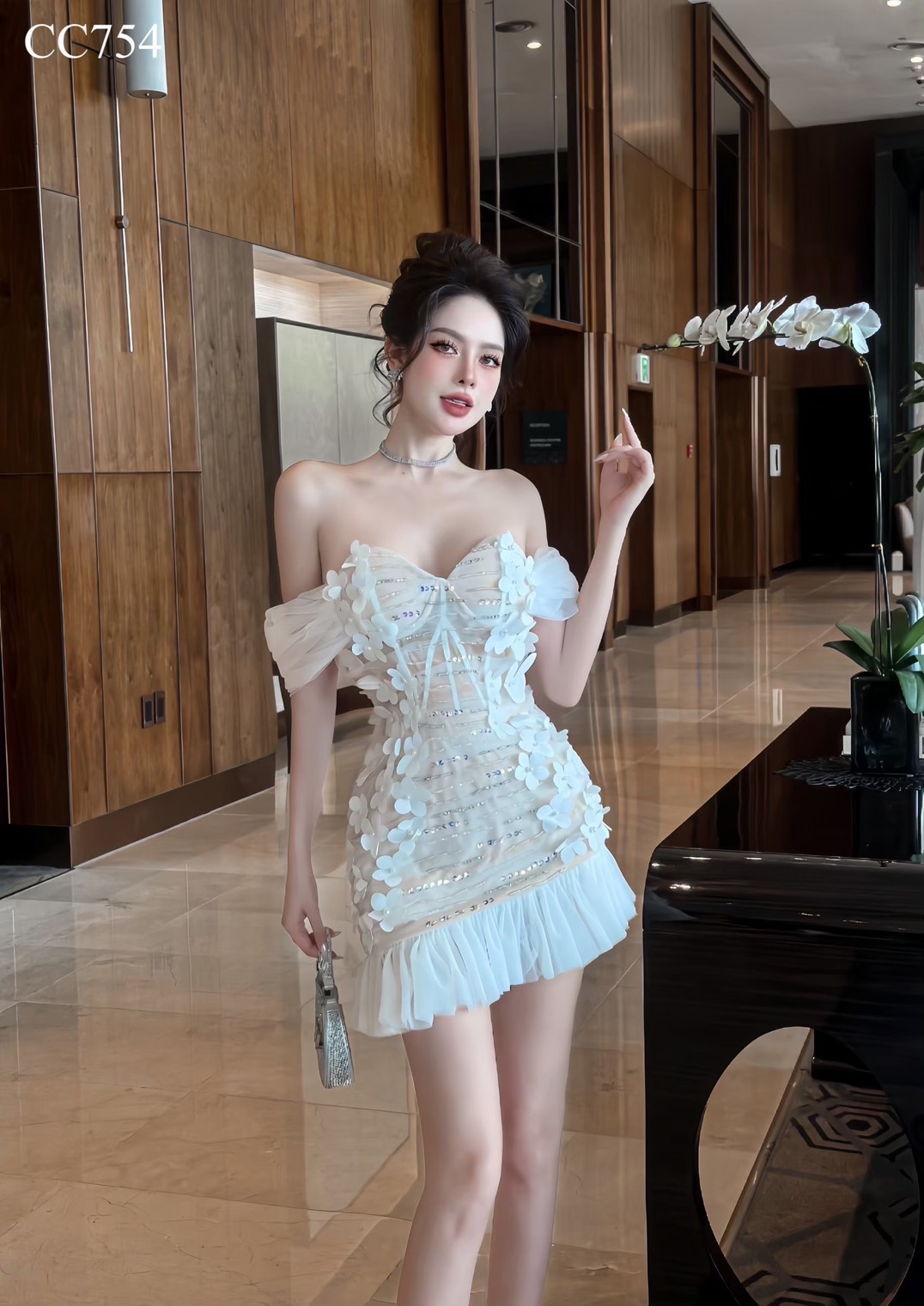 ชุดเดรส ปาดไหล่ แต่งดอก สีขาว-ครีม 2066 Size S
