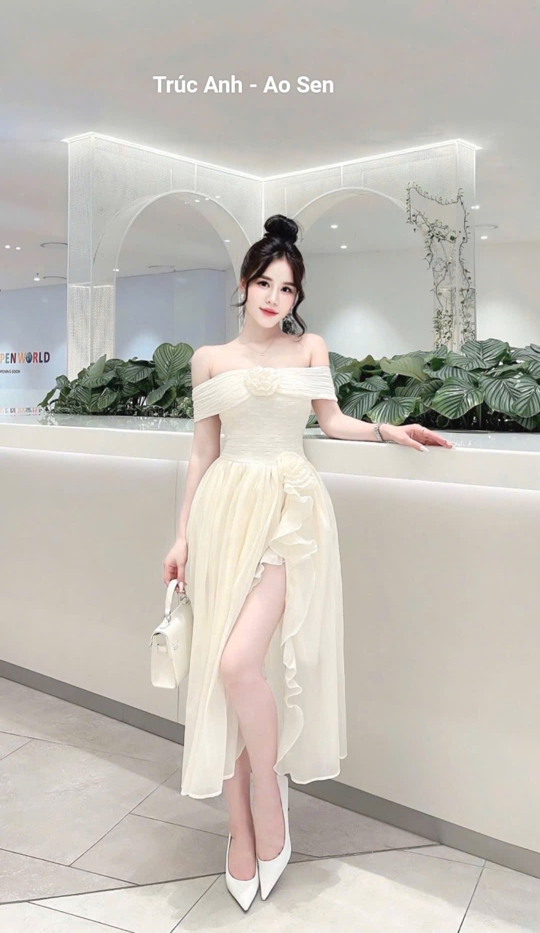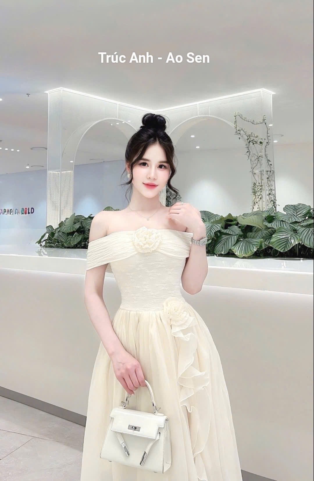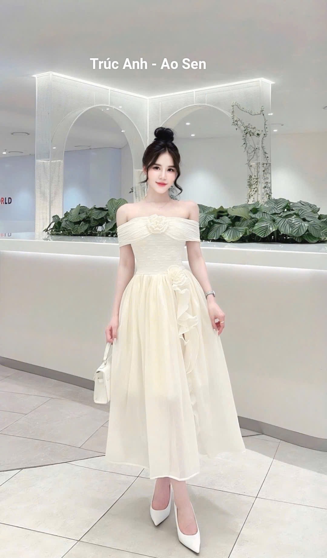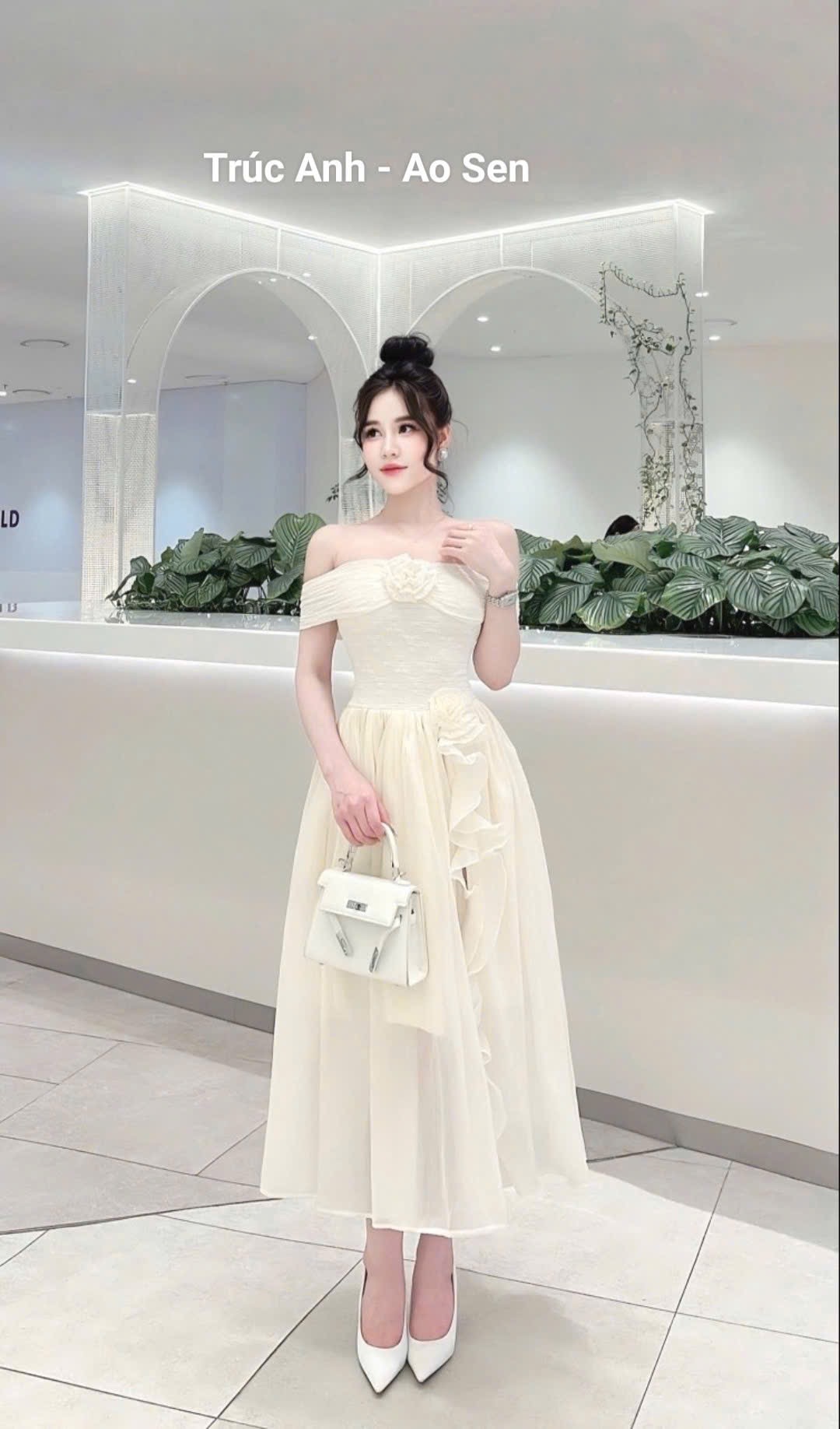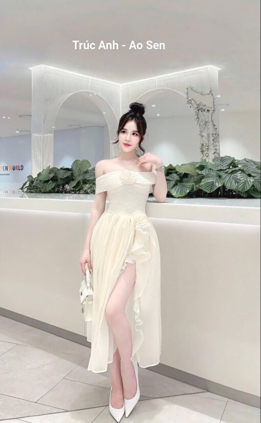 ชุดเดรส ปาดไหล่ แต่งดอก สีครีม Brand เวียดนามแท้ 3051 Size S-M