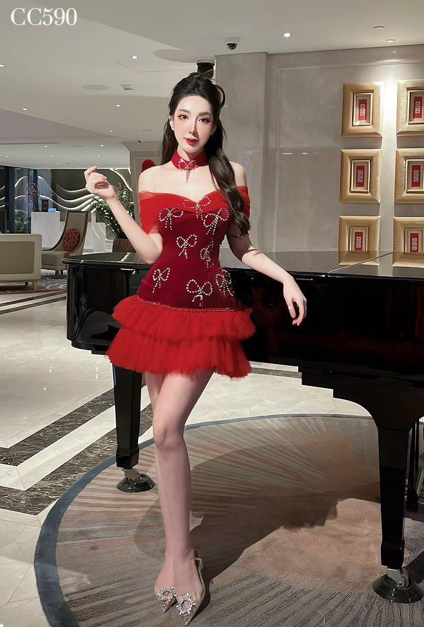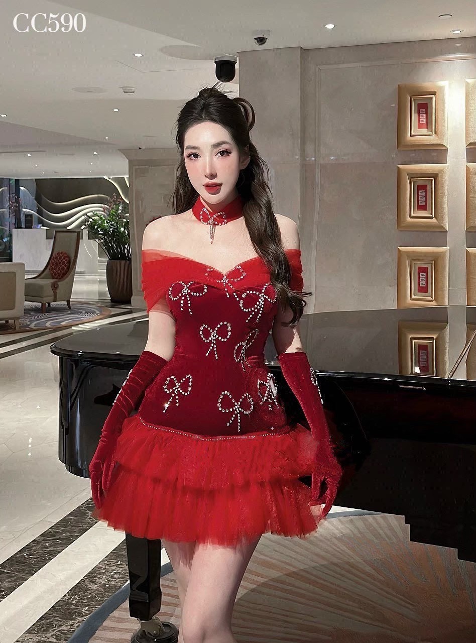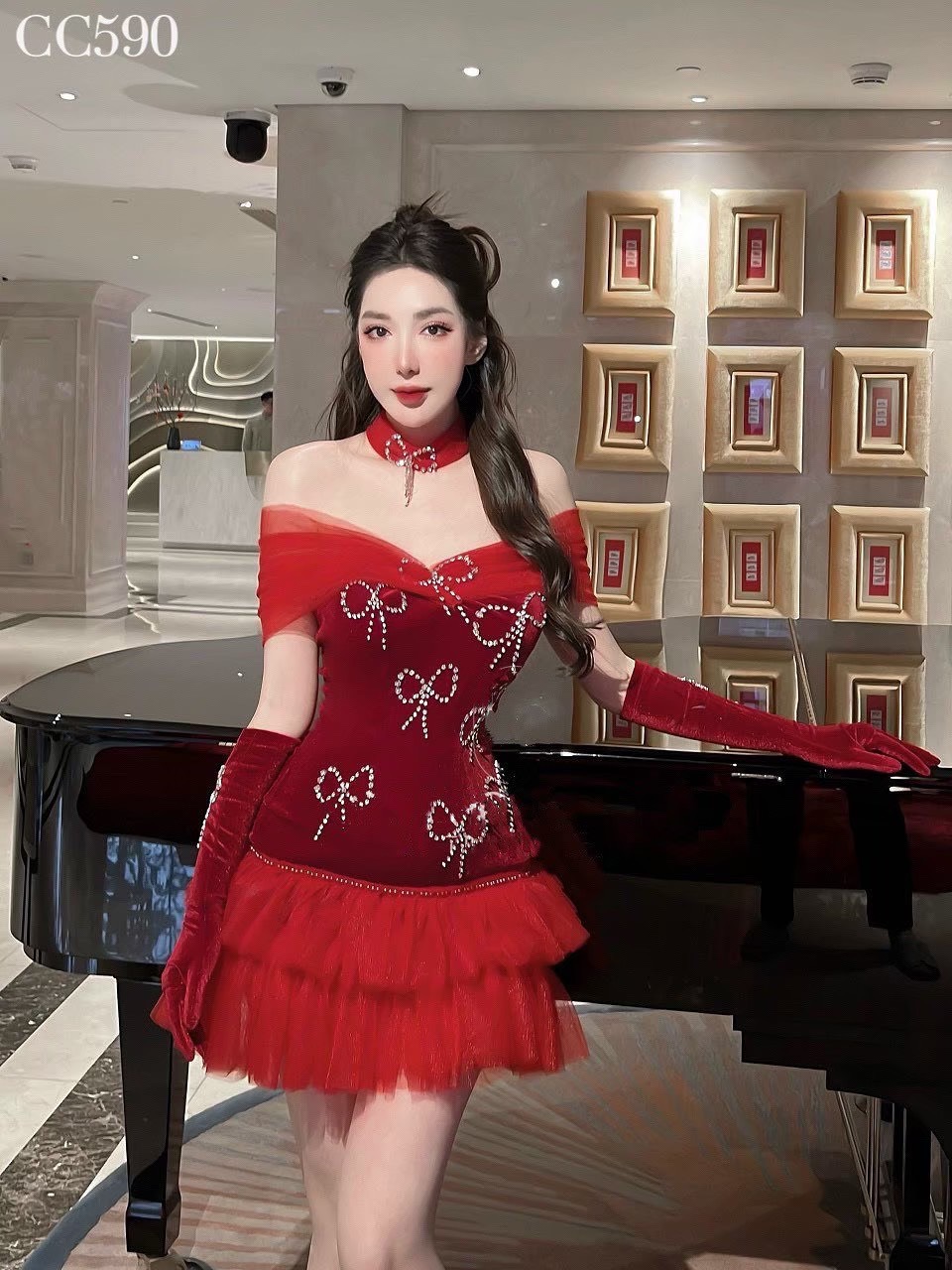 ชุดเดรส ปาดไหล่ แต่งโบว์เพชร สีแดง 2092 Size M