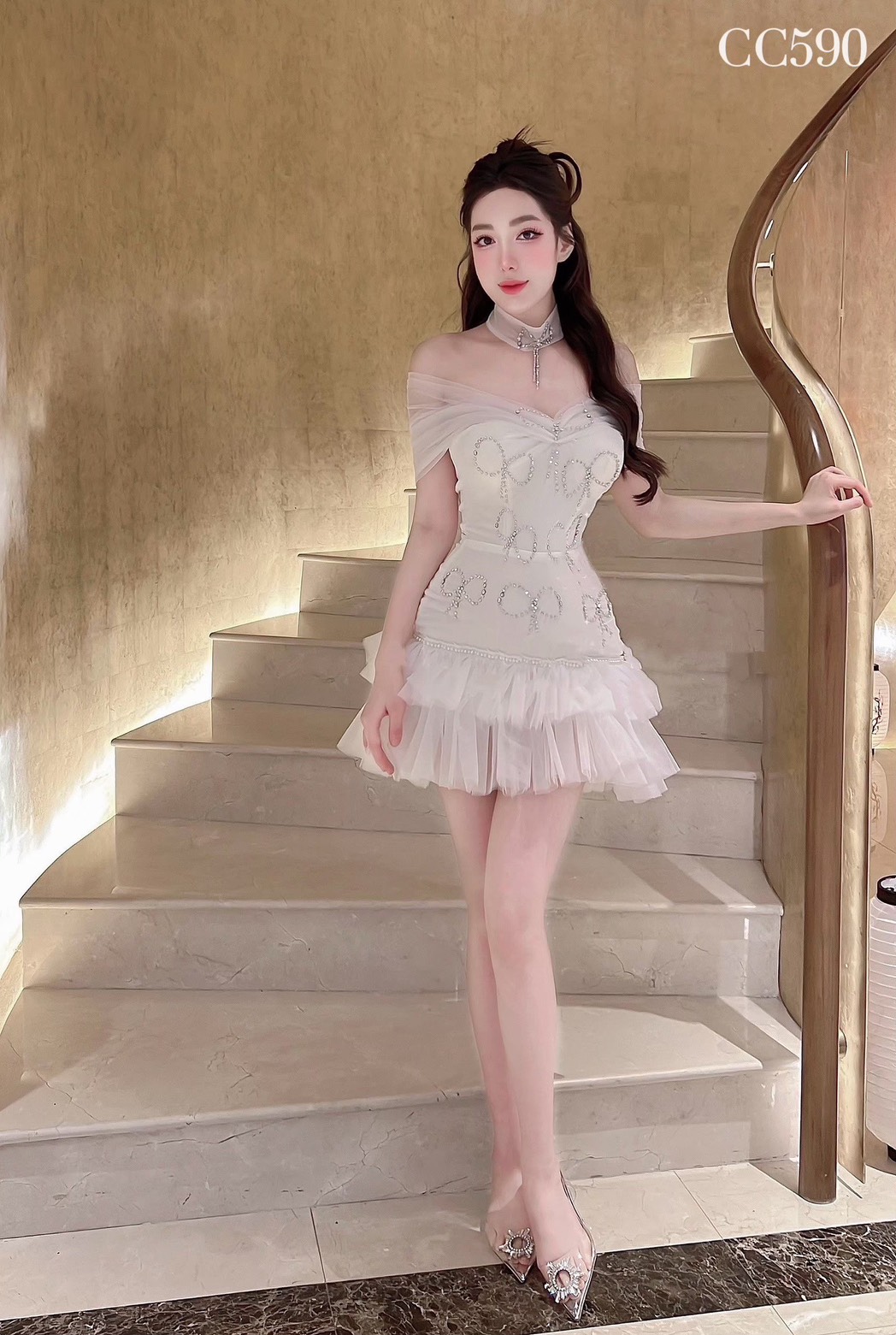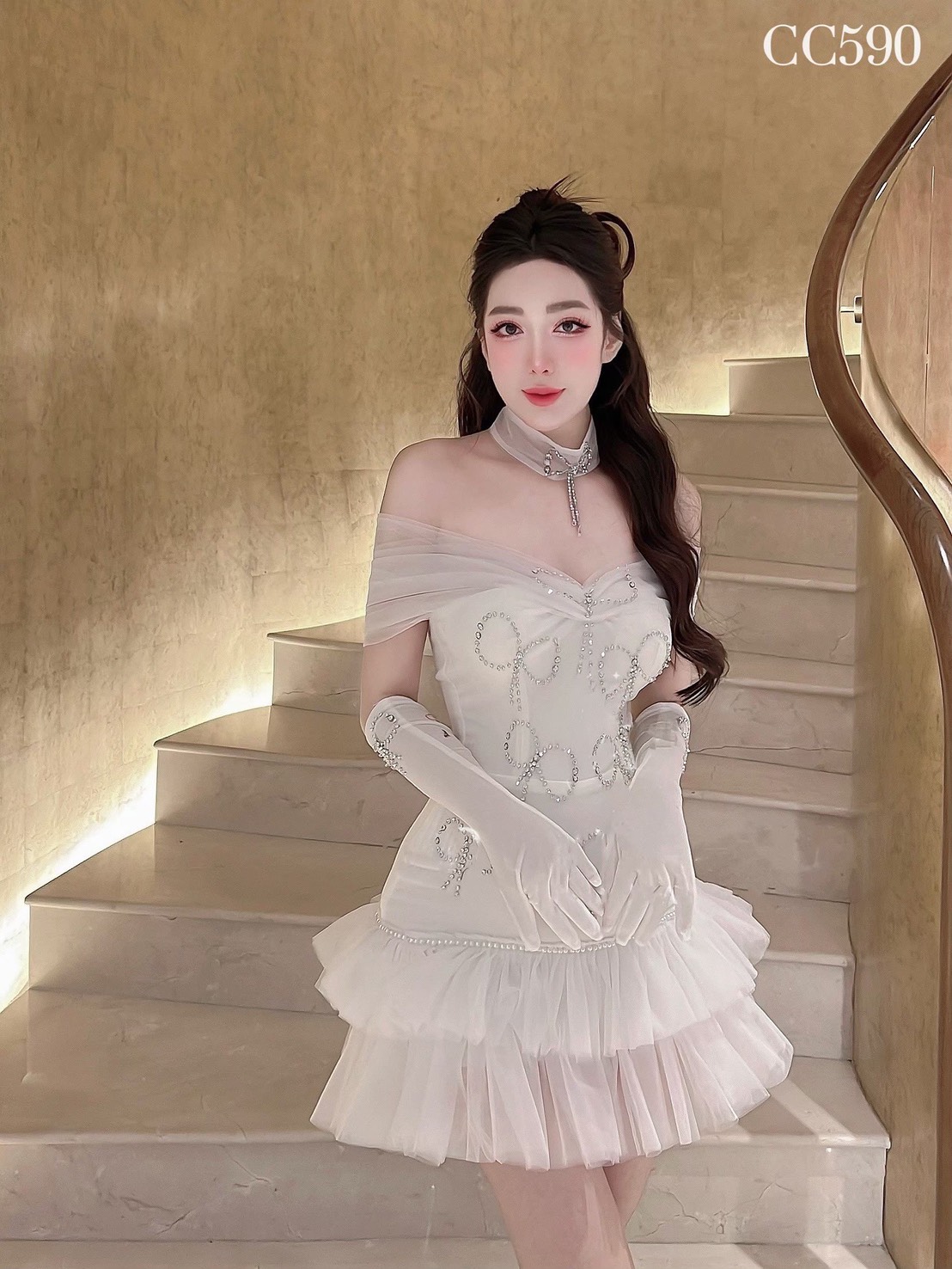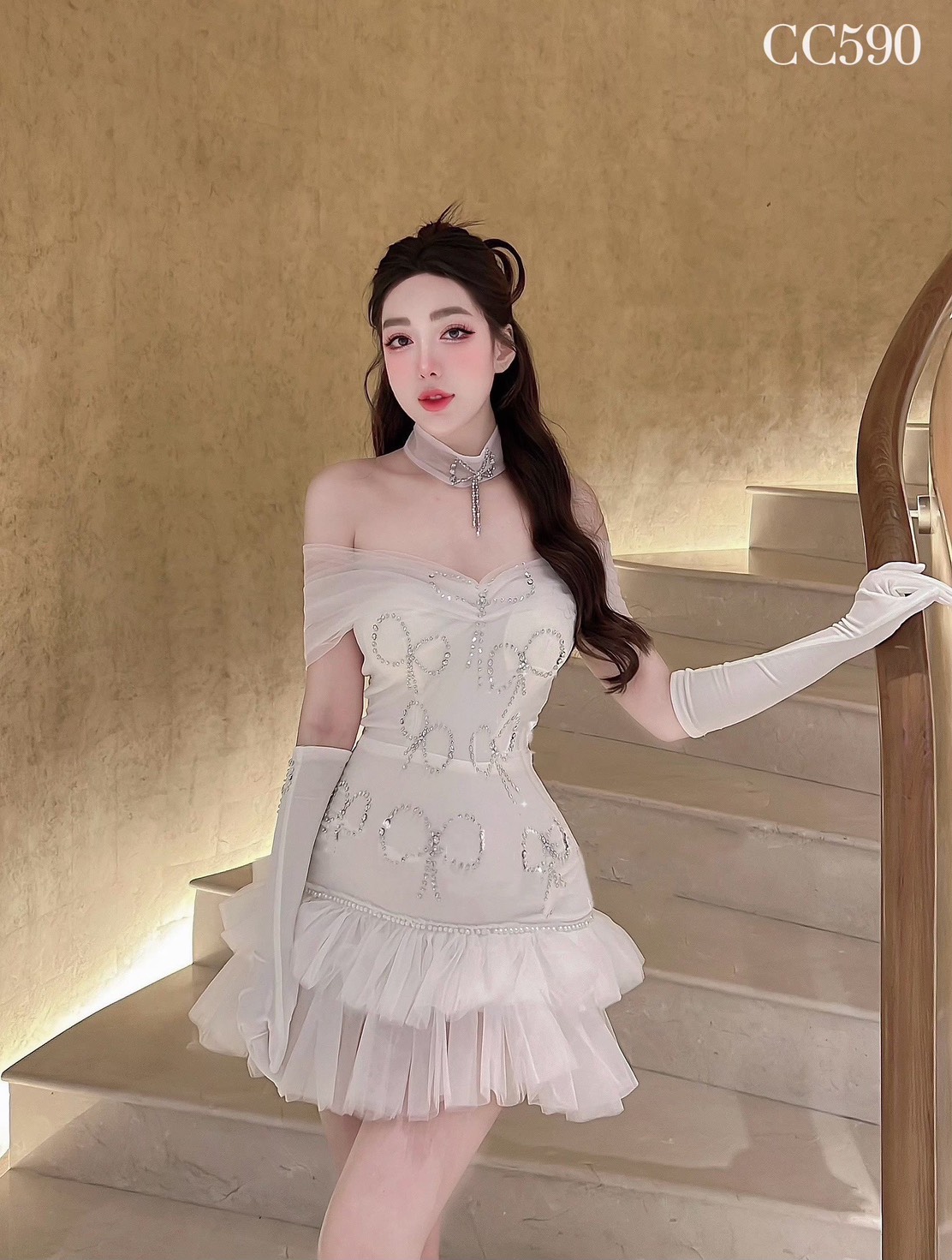 ชุดเดรส ปาดไหล่ แต่งโบว์เพชร สีขาว 2093 Size M