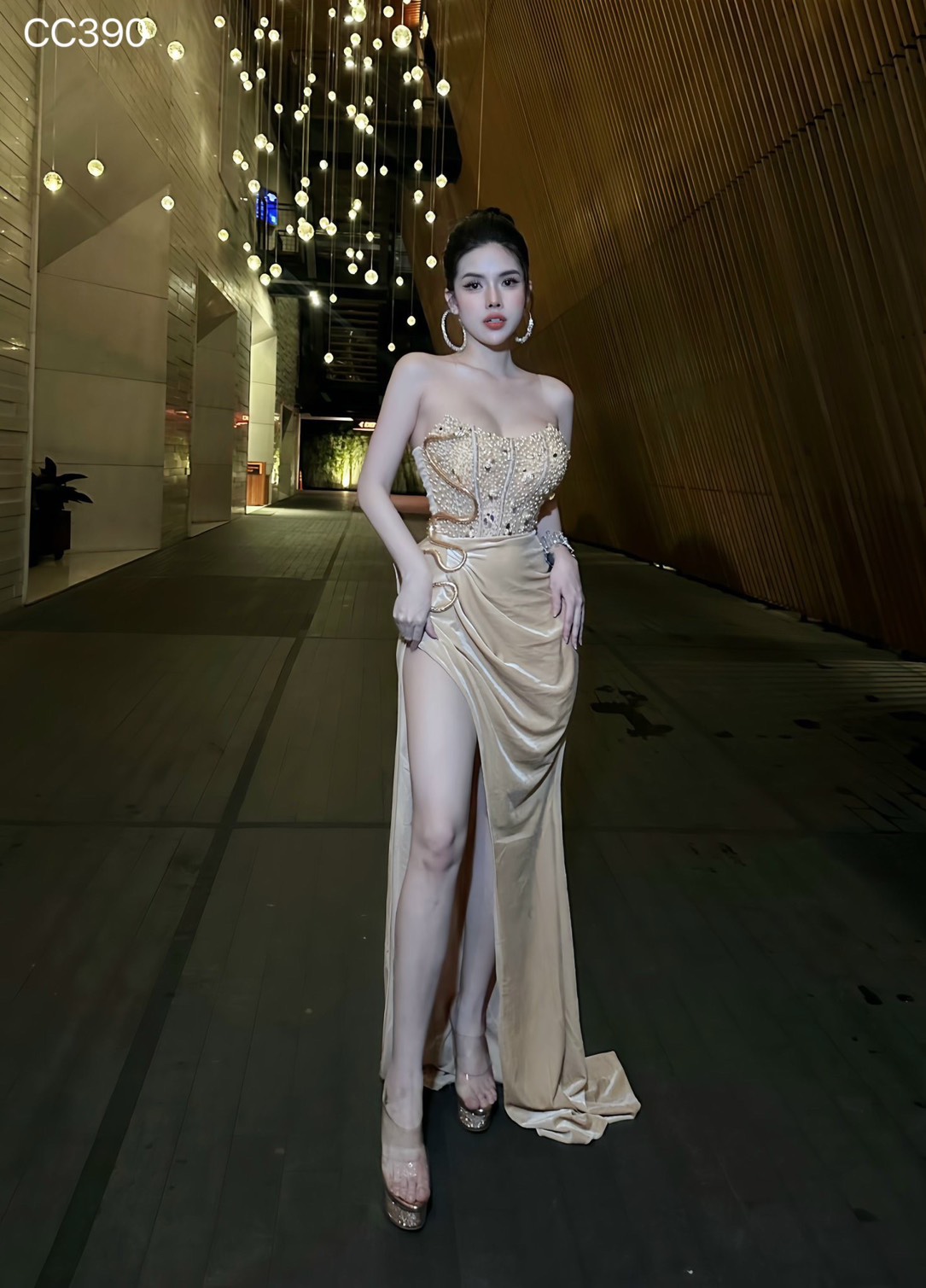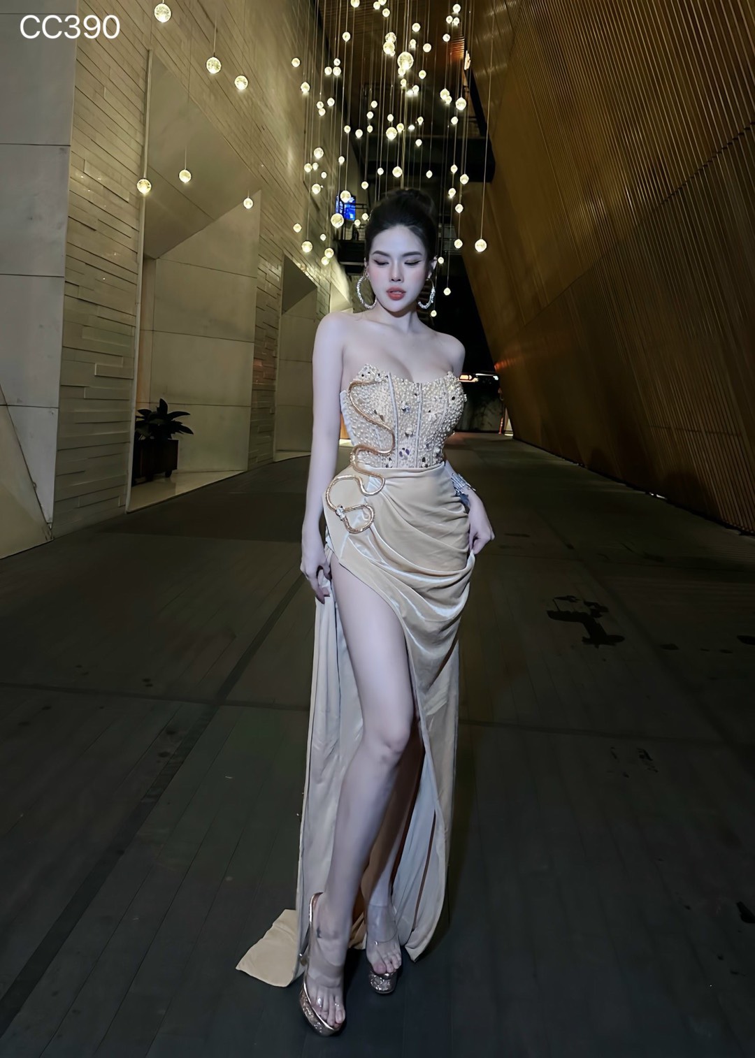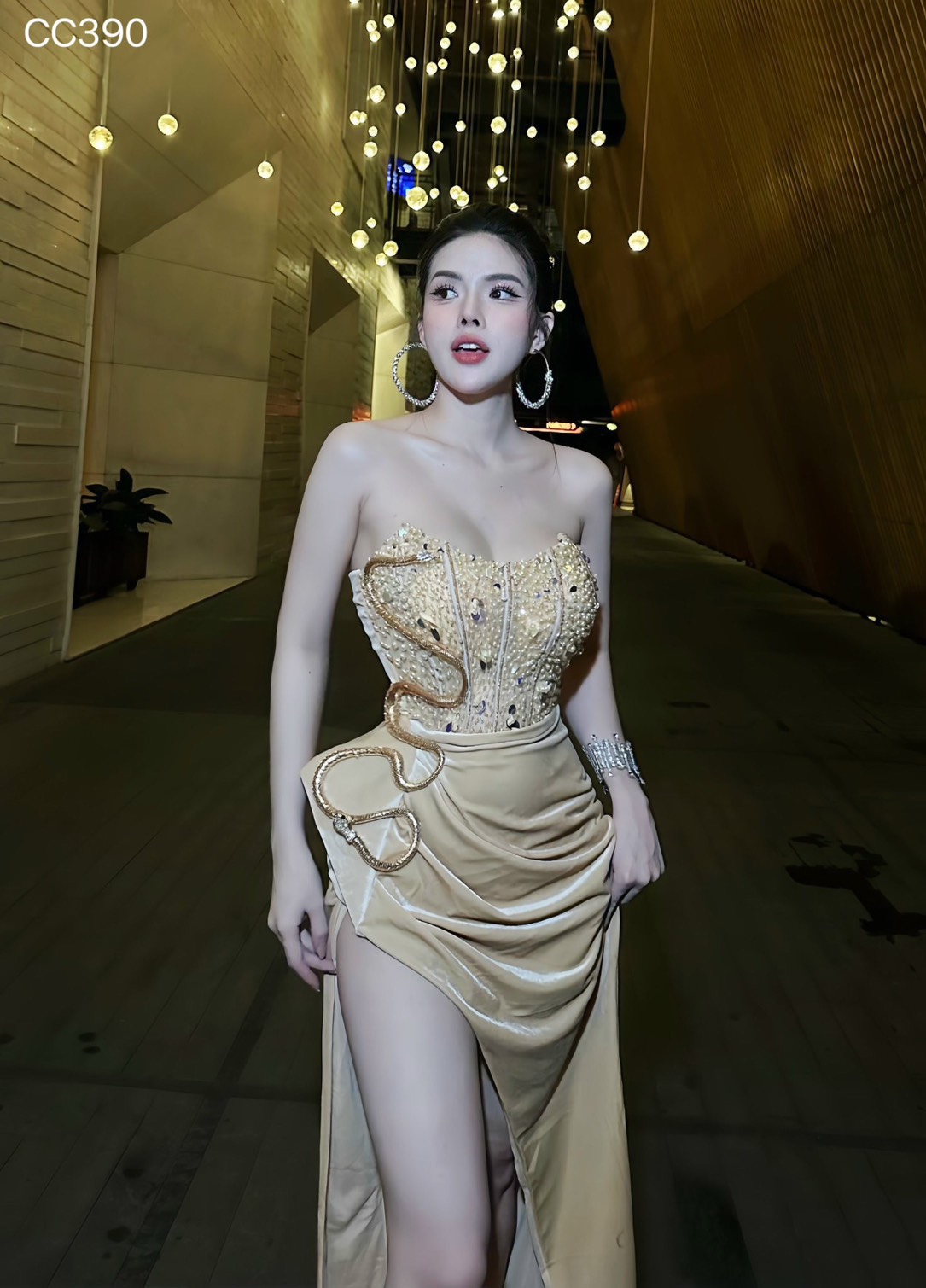 ชุดเดรส ราตรียาว เกาะอก แต่งมุก สีครีม 3024 Size S