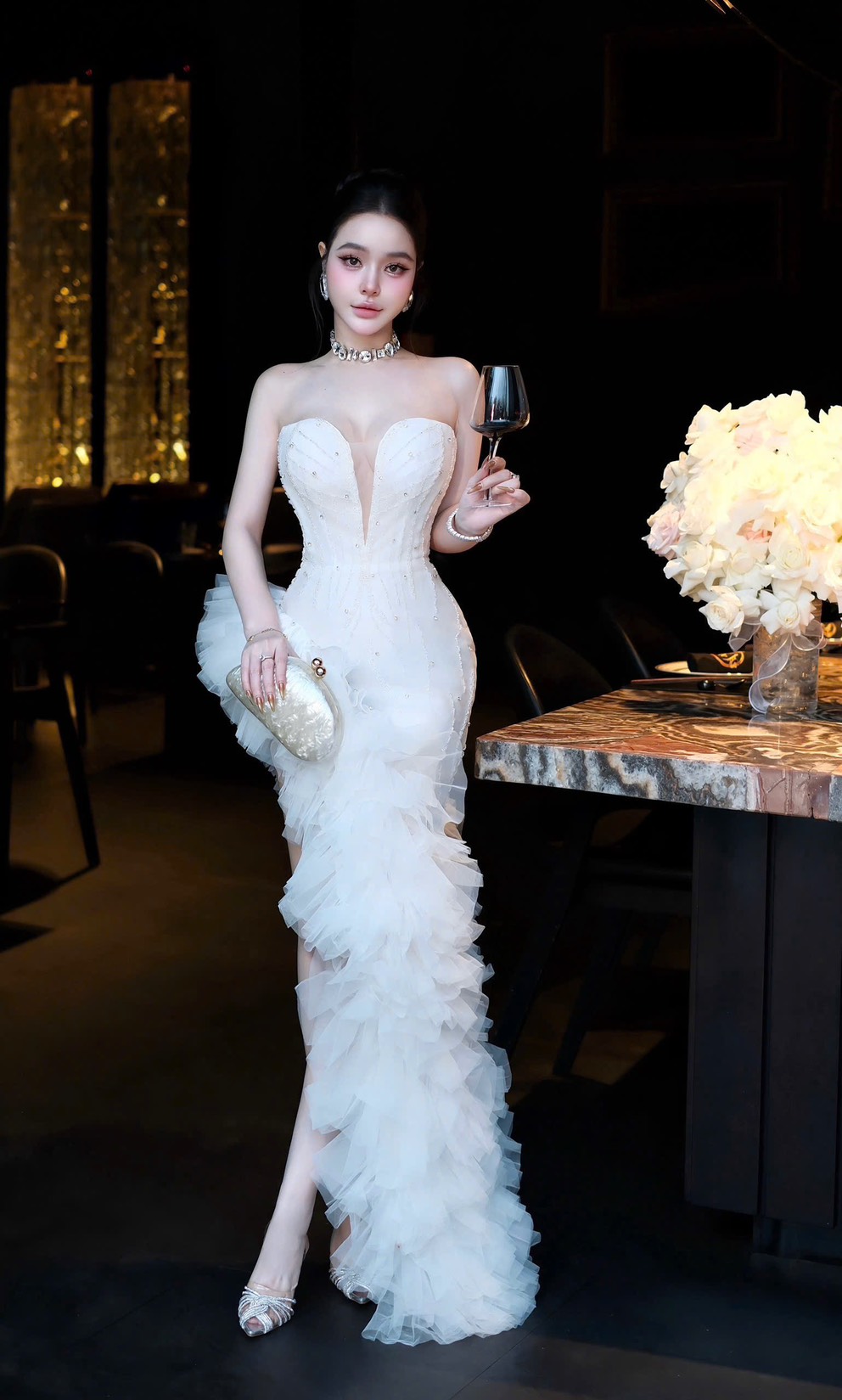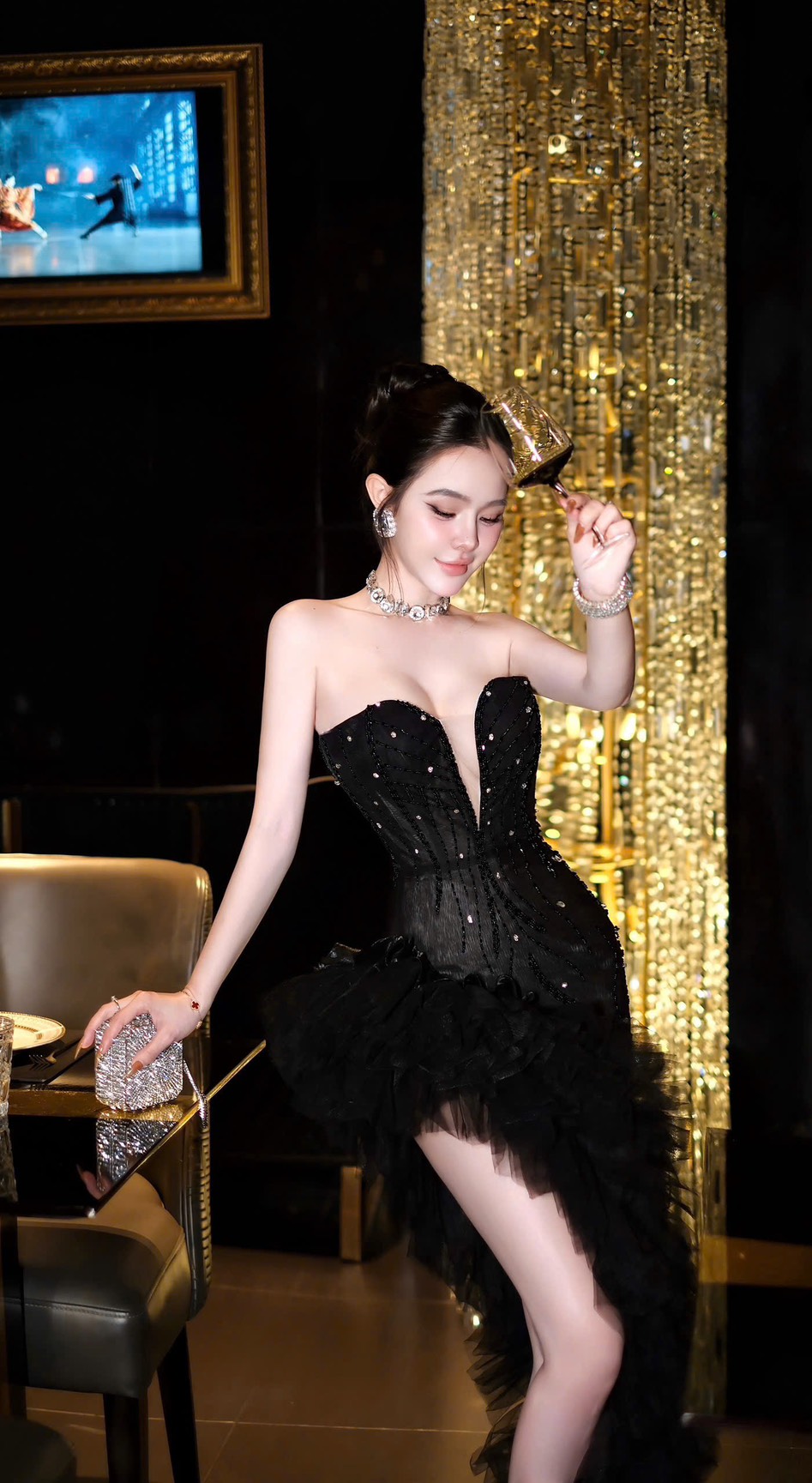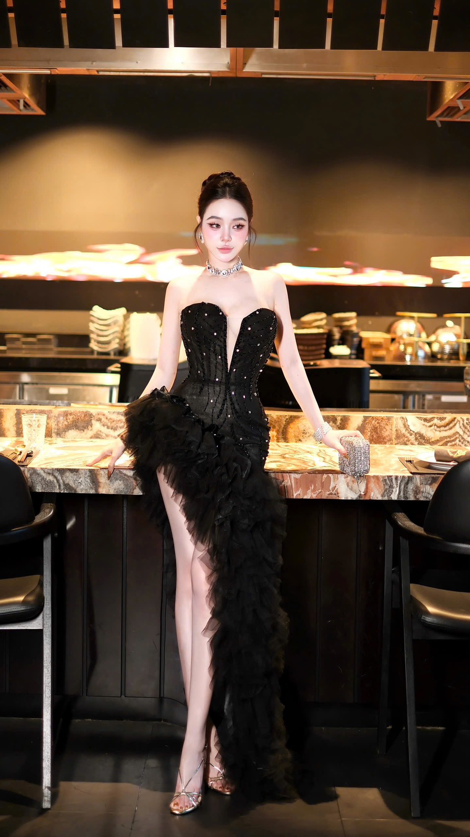 ชุดเดรส ราตรียาว แต่งมุก+เพชร สีดำ 3031 Size M