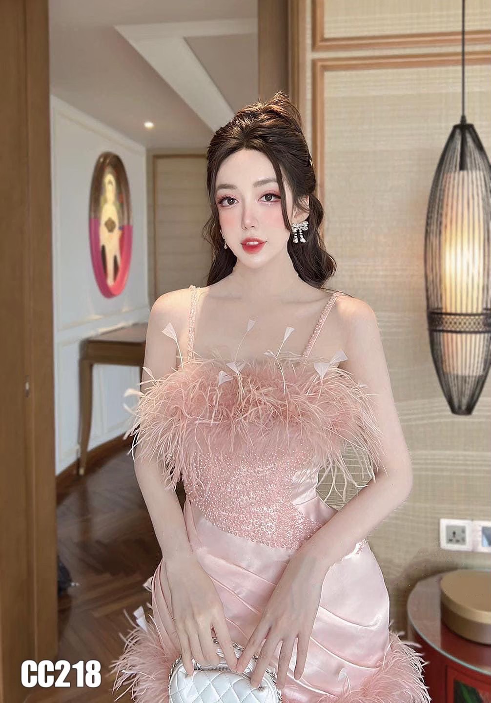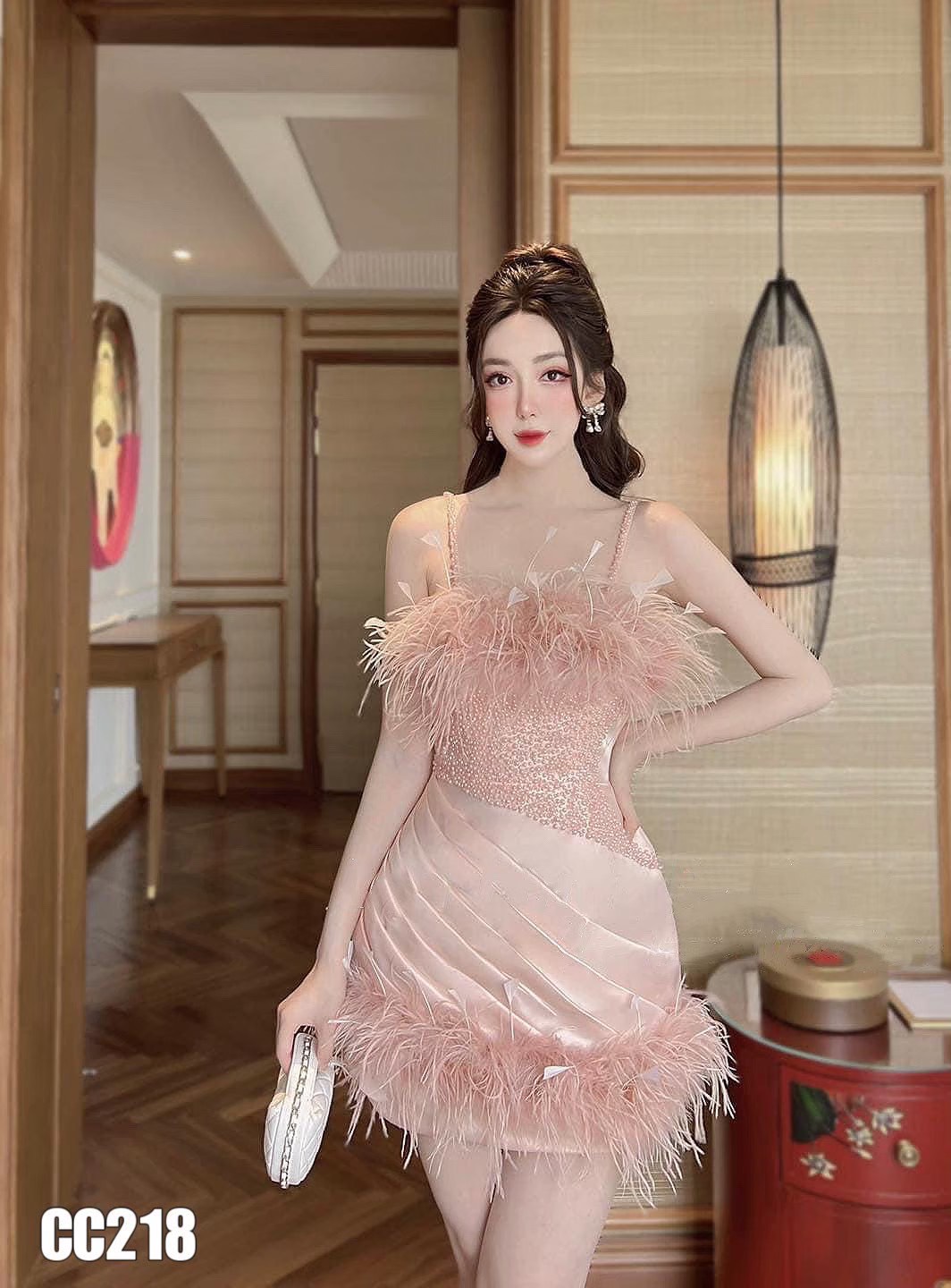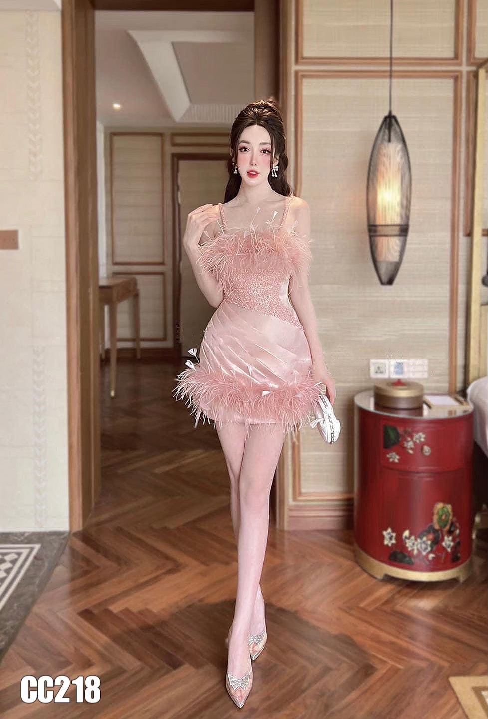 ชุดเดรส สายเดี่ยว แต่งขน สีชมพู 2127 Size M