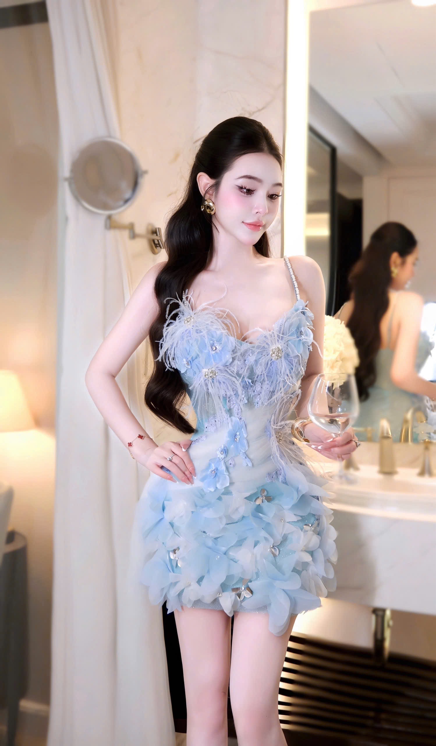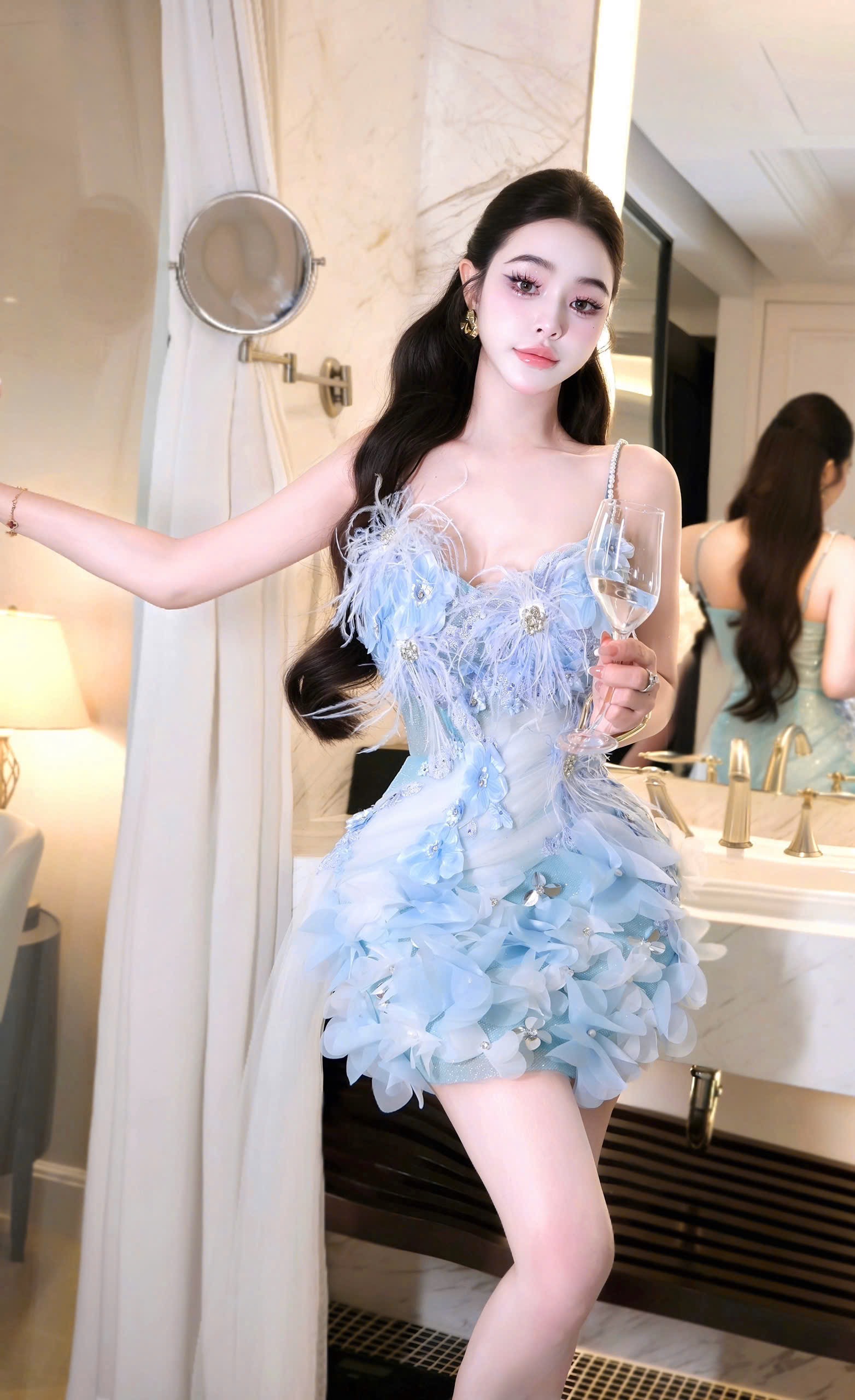 ชุดเดรส สายเดี่ยว แต่งดอก+ขน สีฟ้า 2043 Size M