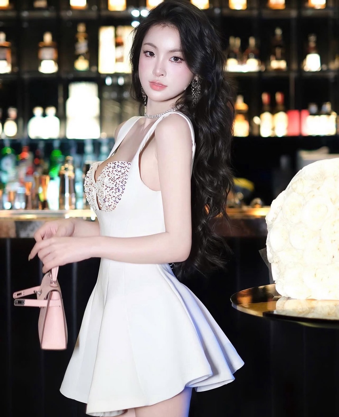 ชุดเดรส สายเดี่ยว แต่งมุก สีขาว สีดำ RAND THAOBIBI 2217 Size S