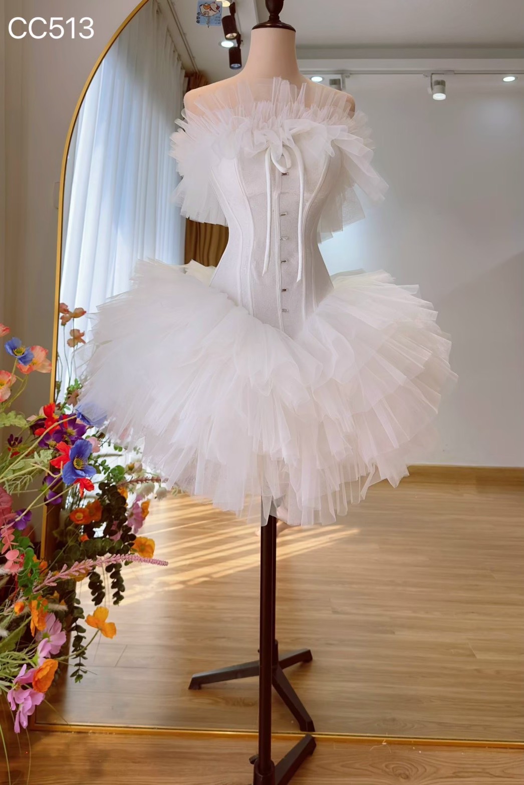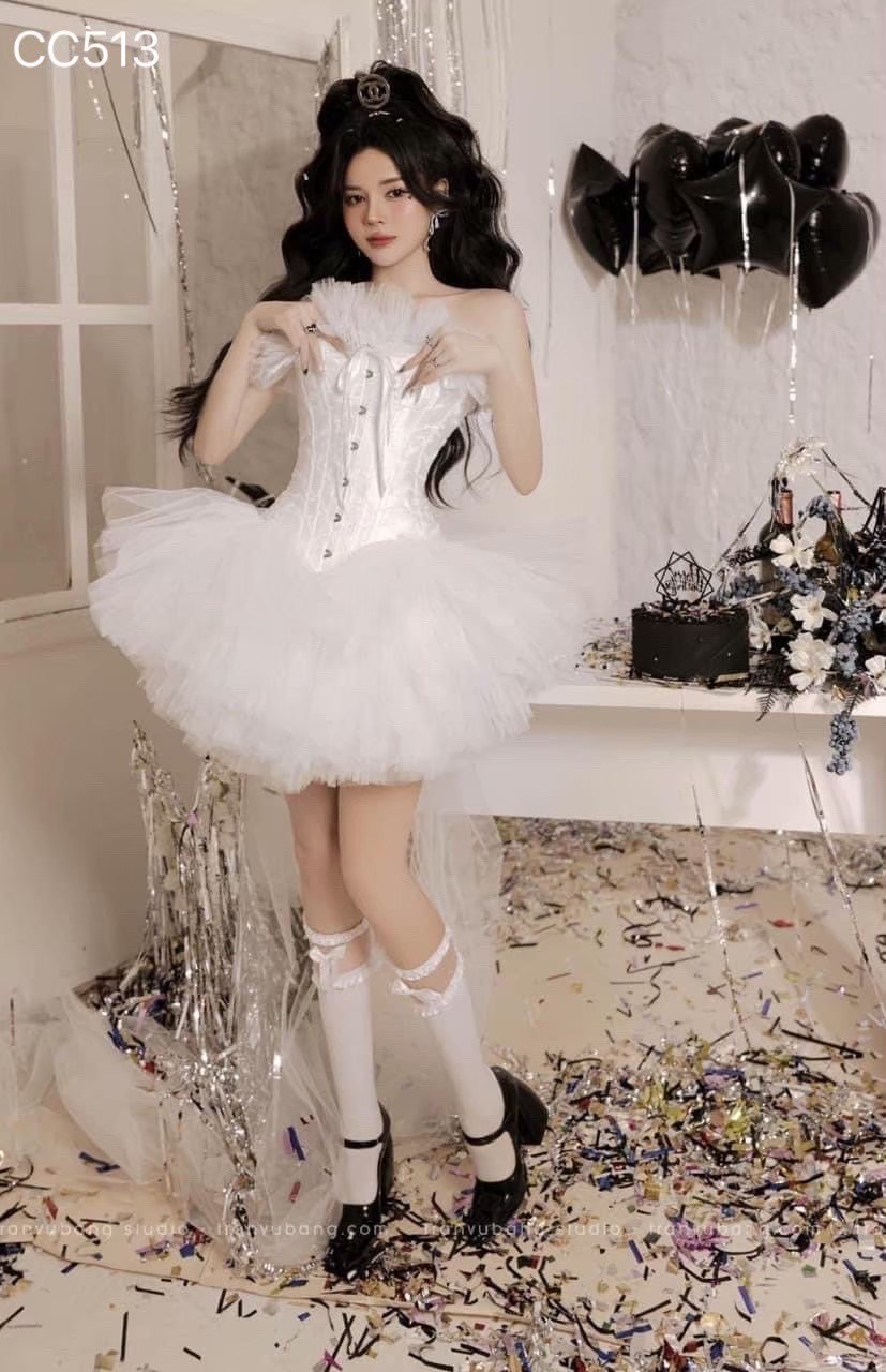 ชุดเดรส เกาะอก แต่งขน สีขาว 2026 Size M