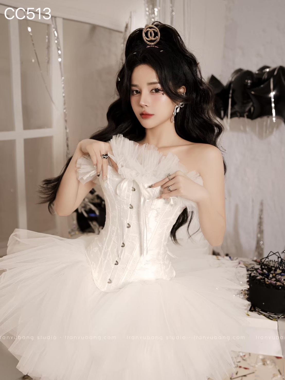 ชุดเดรส เกาะอก แต่งเพชร+กลิตเตอร์ สีขาว 2021 Size M