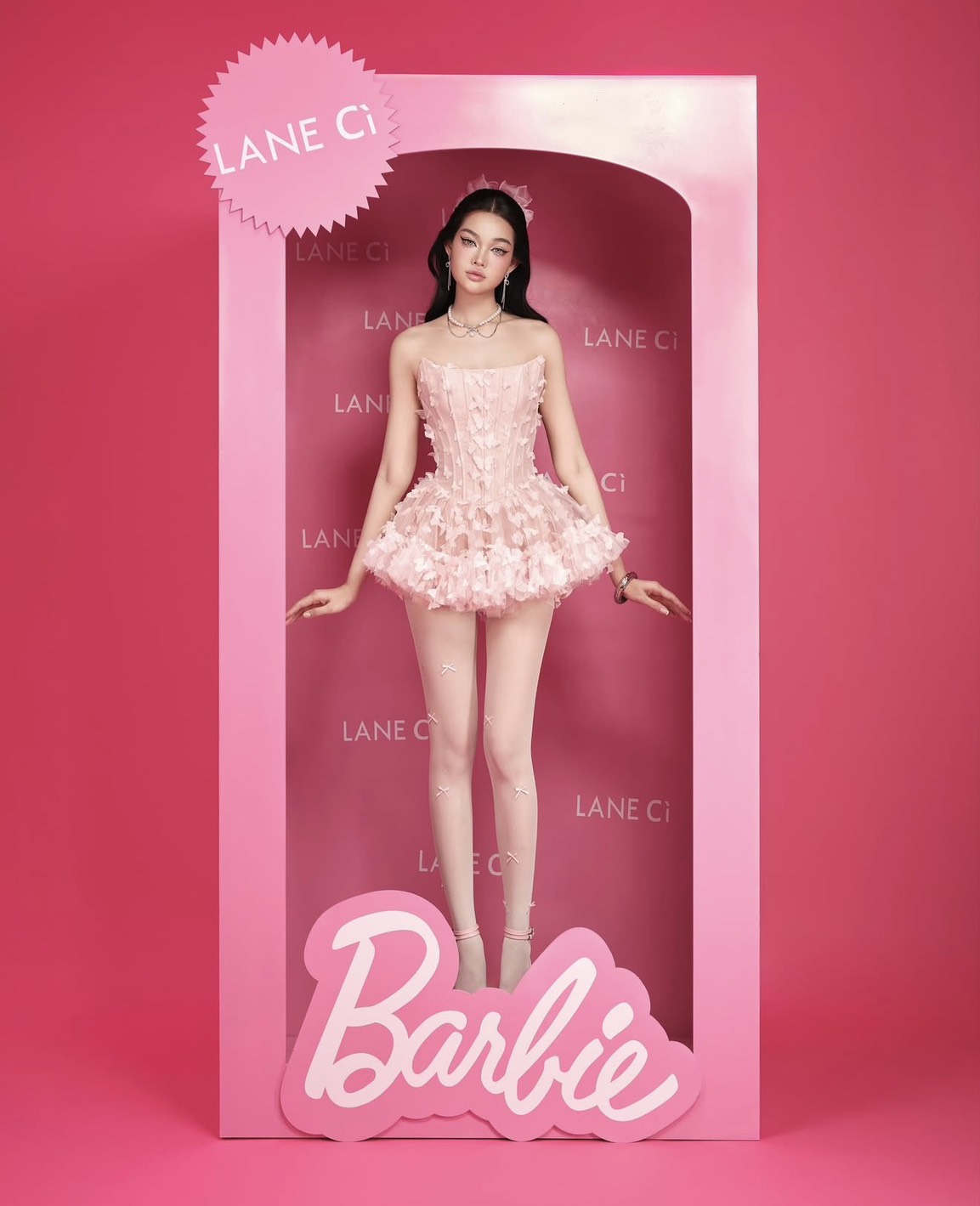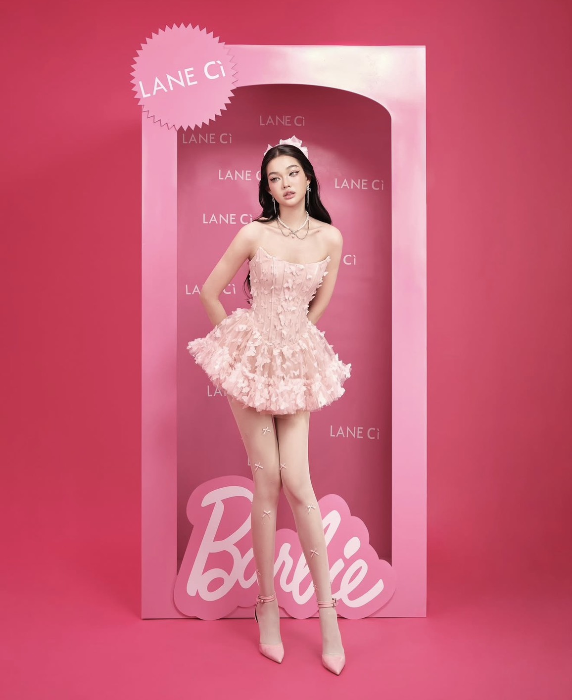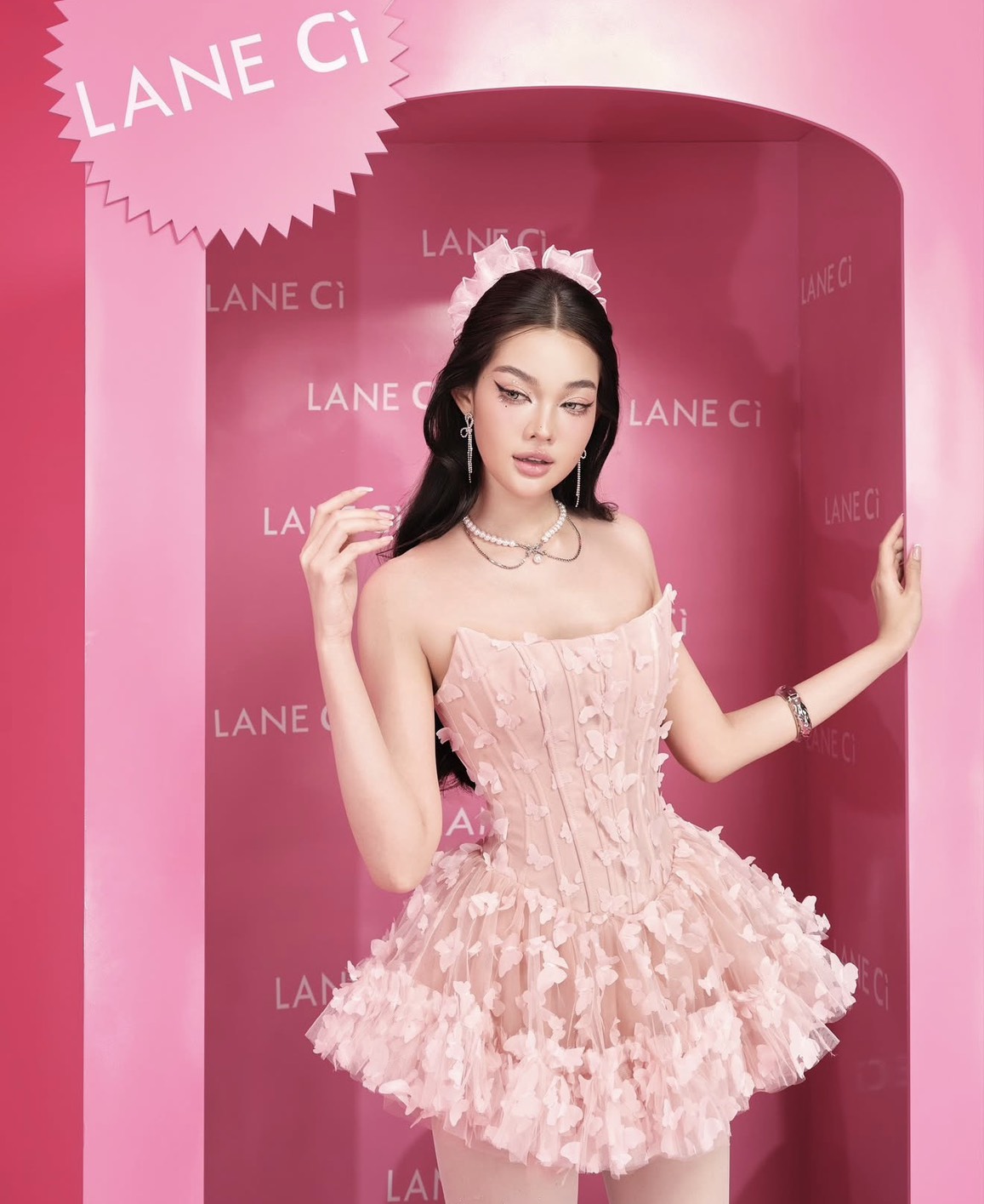 ชุดเดรส เกาะอก แต่งเพชร+ขนนก สีชมพูพาสเทล ม่วง 2024 Size M