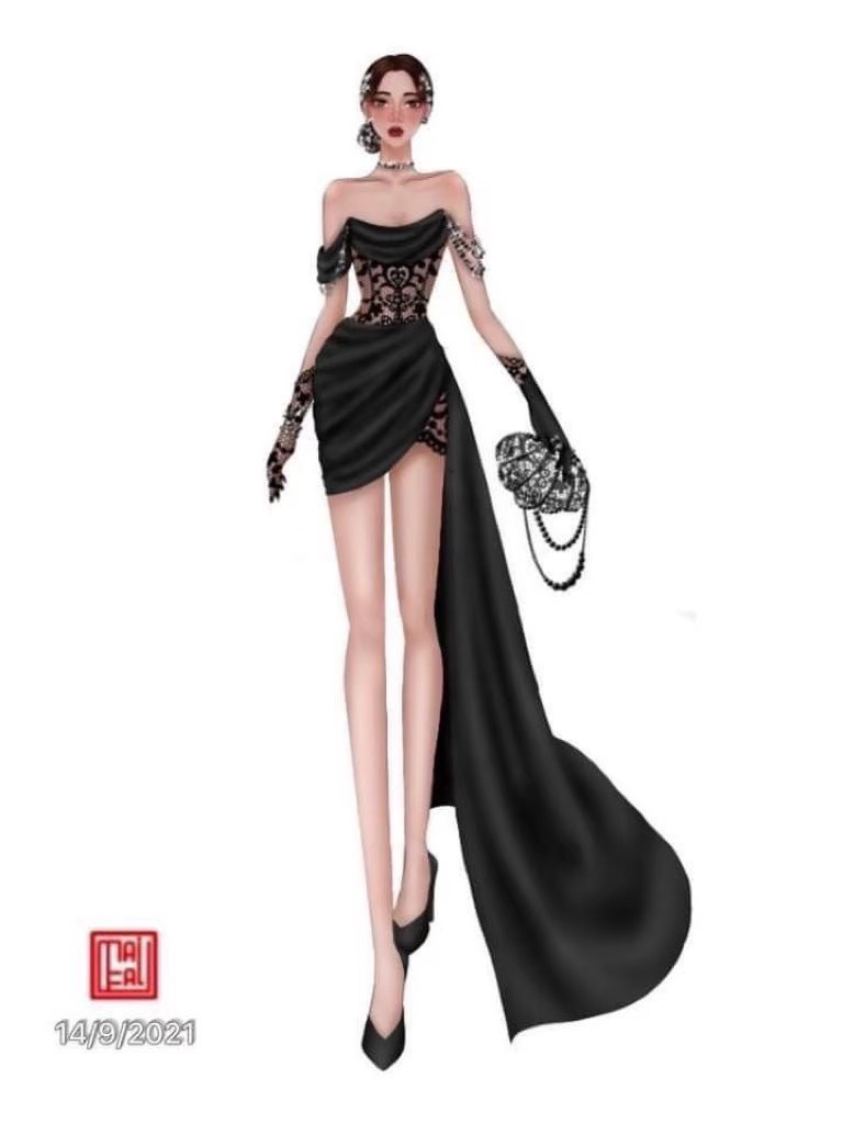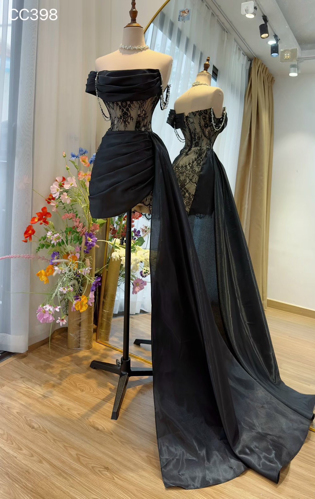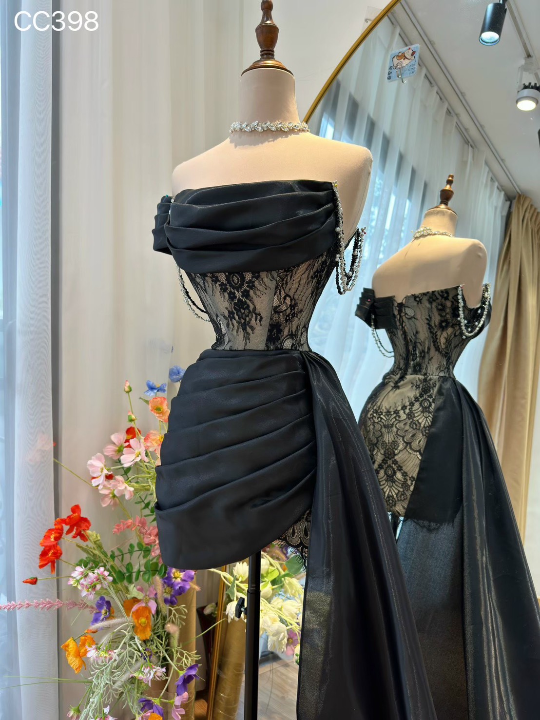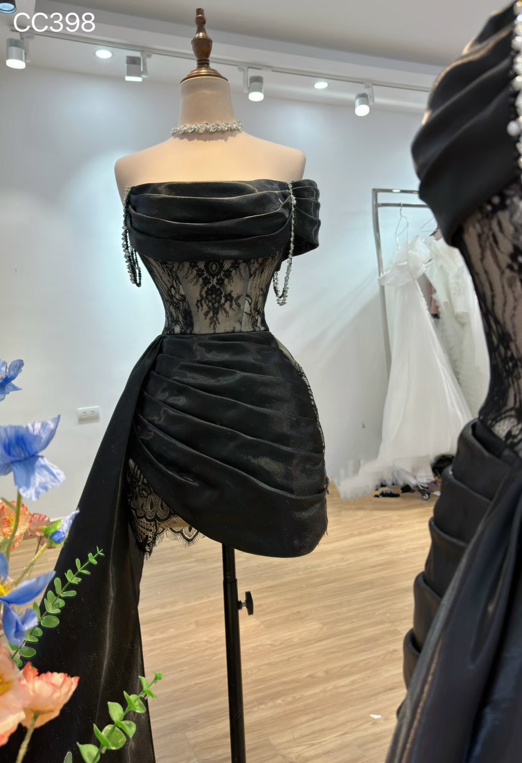 ชุดเดรส เกาะอก ลูกไม้ แต่งเพชร สีดำ 2110 Size S