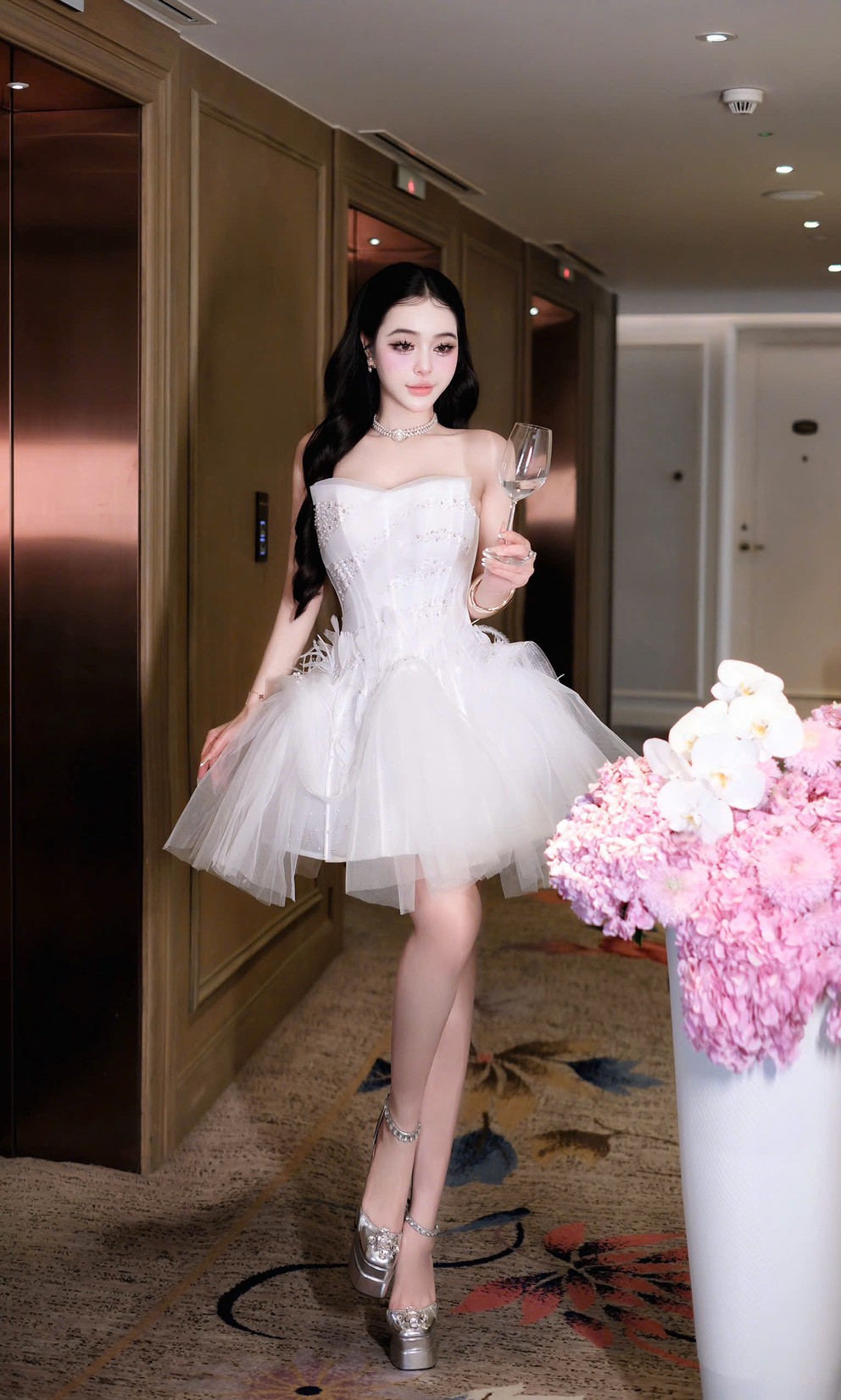 ชุดเดรส ปาดไหล่ ขนนก แต่งกลิตเตอร์ สีขาว 2004 Size S,L-XL