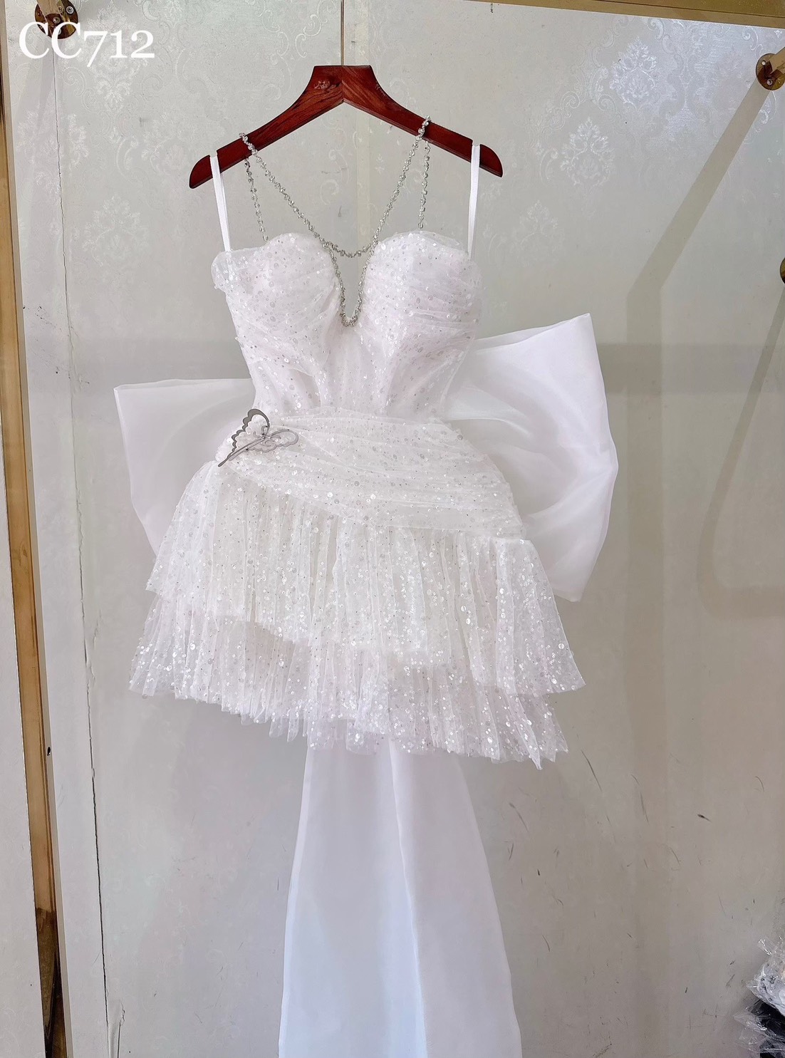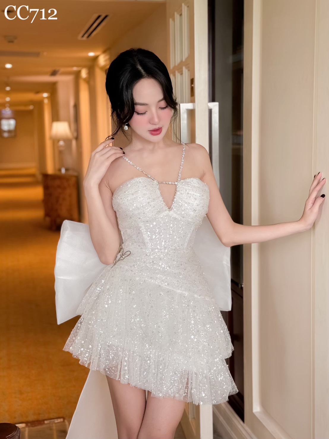 ชุดเดรส เกาะอก แต่งกลิตเตอร์+โบว์ สีขาว 2052 Size S