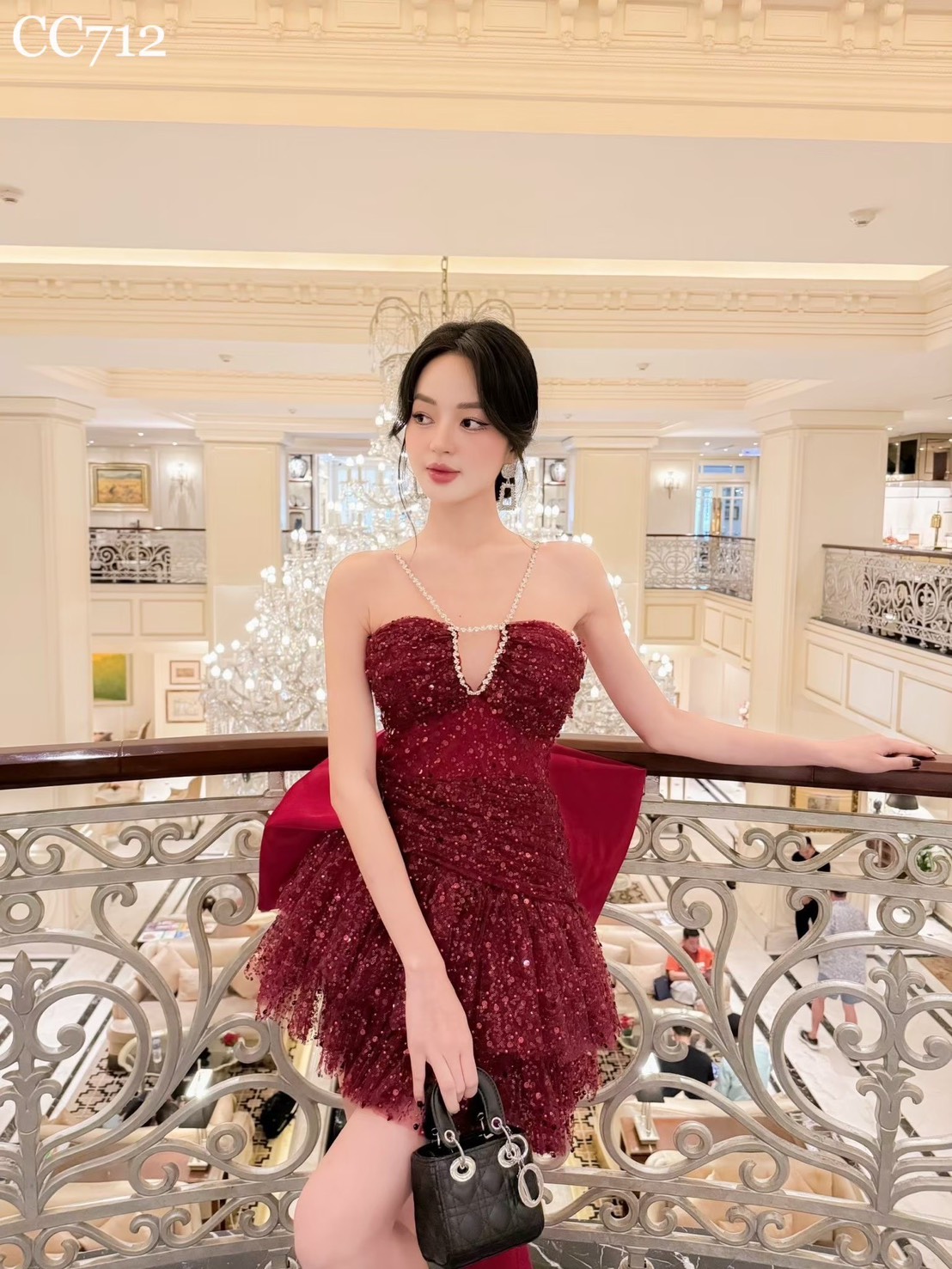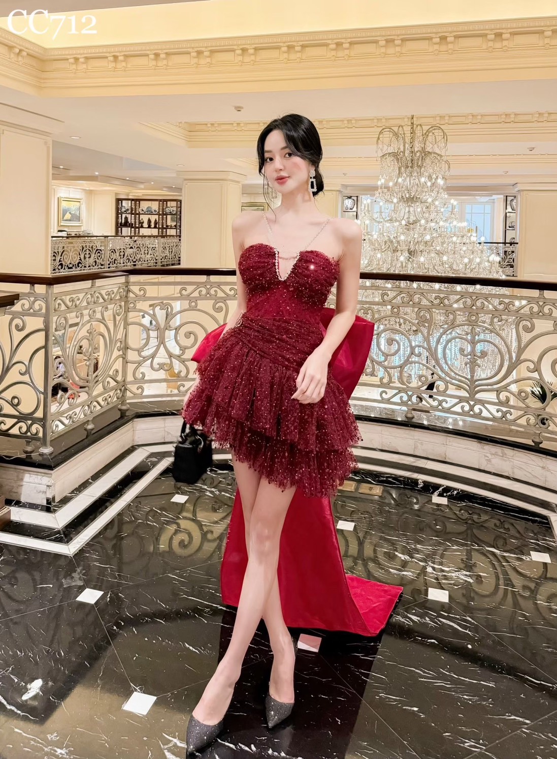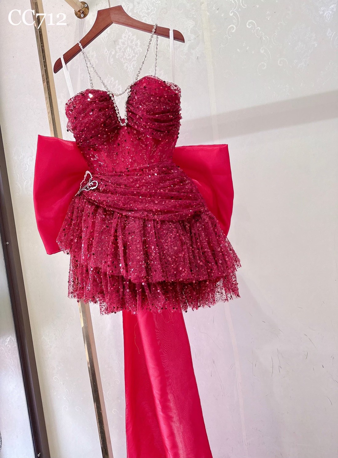 ชุดเดรส เกาะอก แต่งกลิตเตอร์+โบว์ สีแดง 2053 Size S