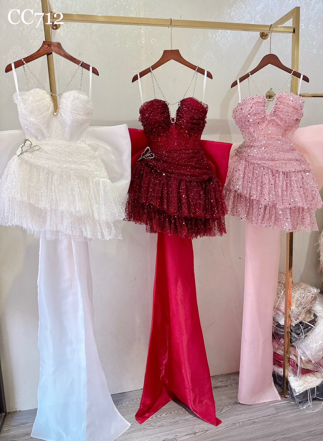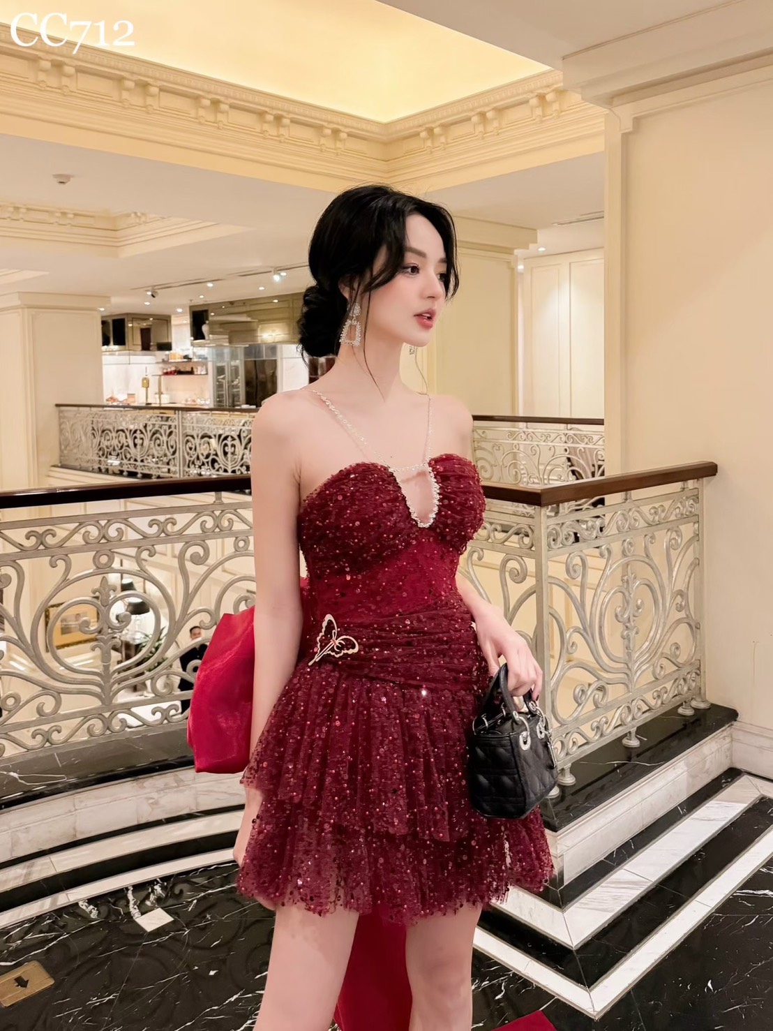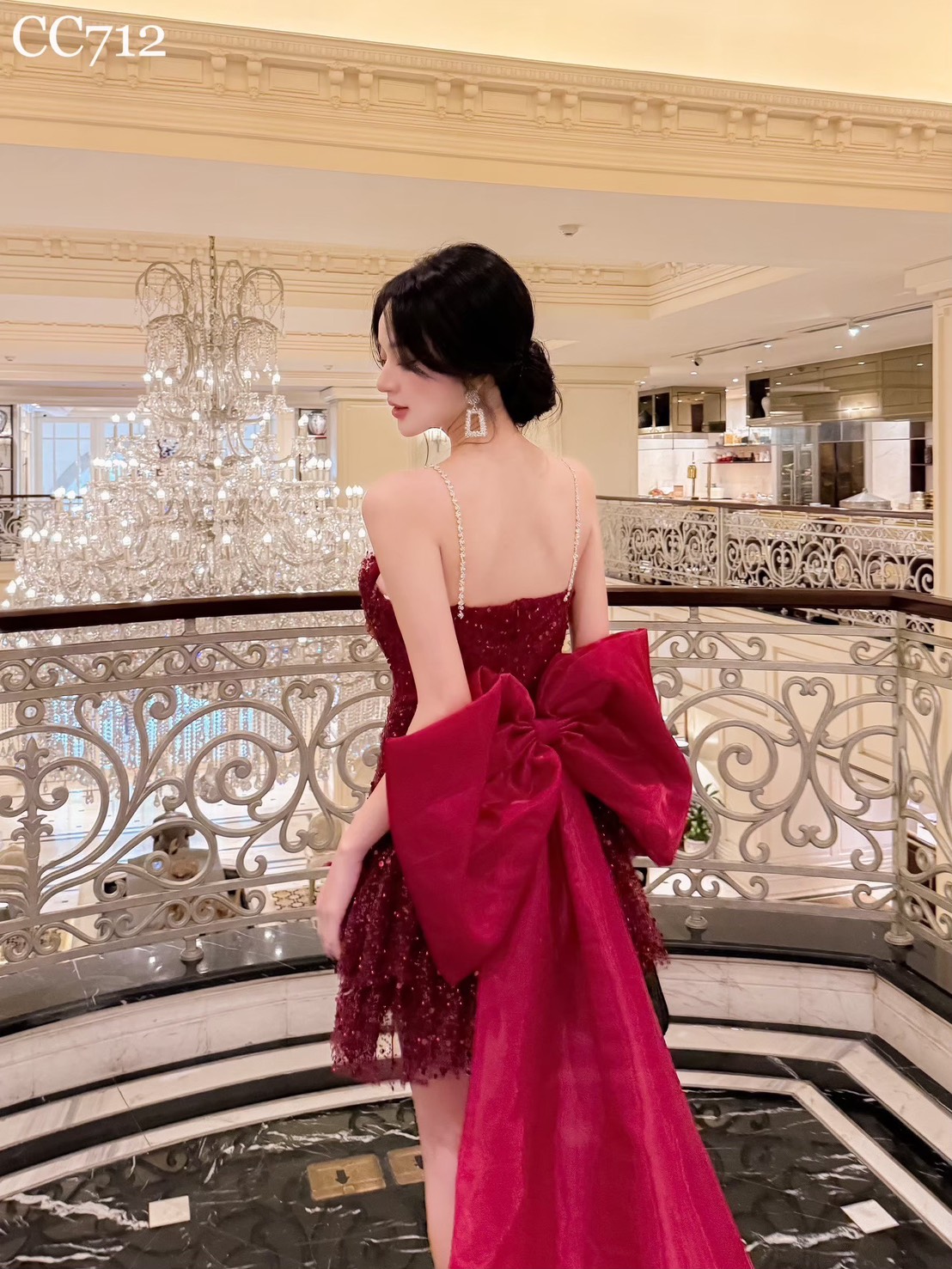 ชุดเดรส เกาะอก แต่งกลิตเตอร์+โบว์ สีแดง 2053 Size S