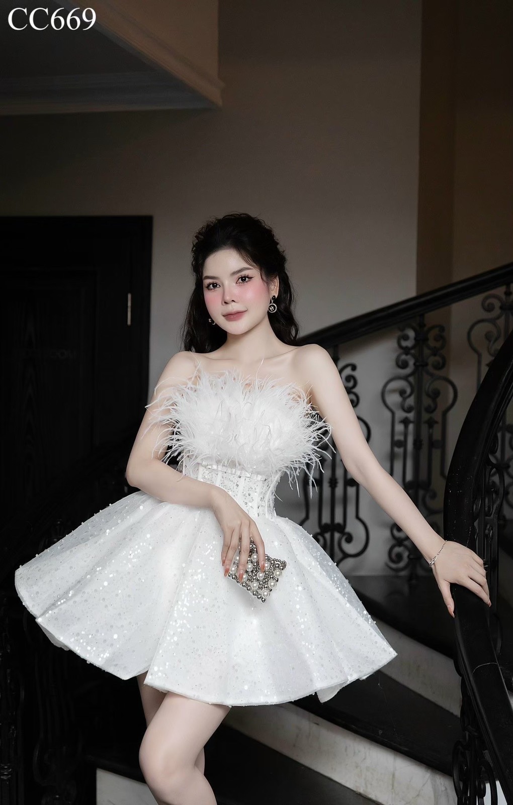 ชุดเดรส เกาะอก แต่งกลิตเตอร์+ขน สีขาว 2083 Size M