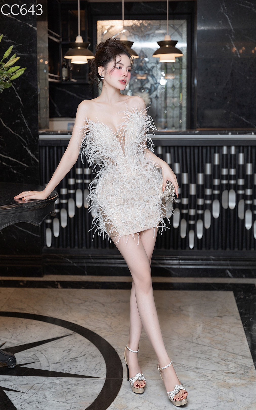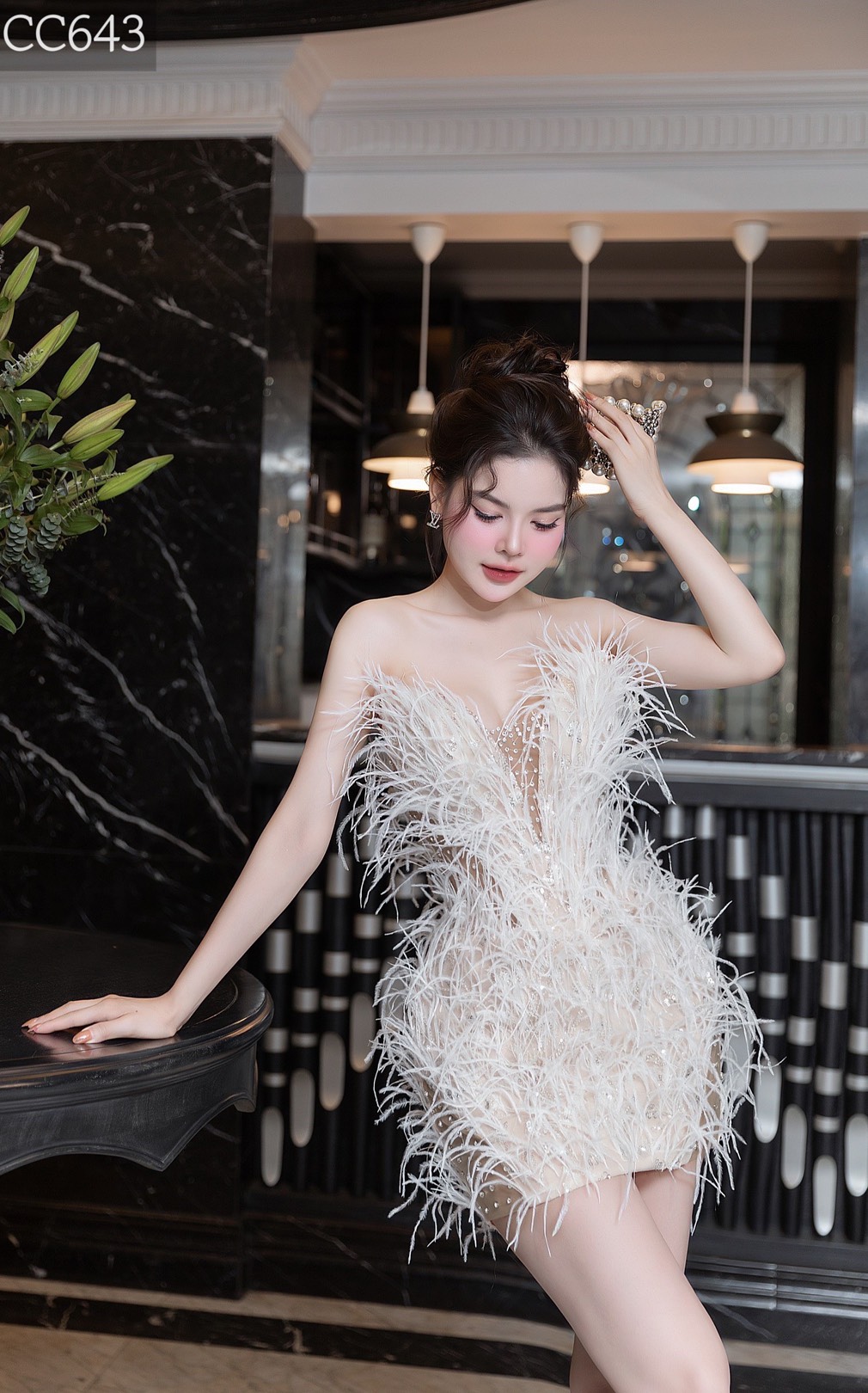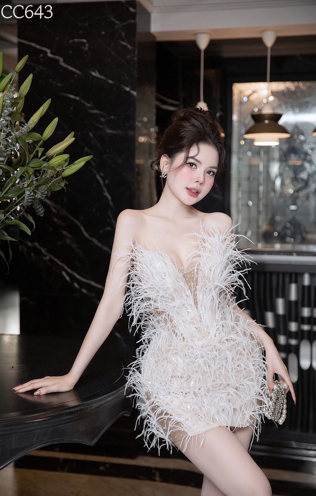 ชุดเดรส เกาะอก แต่งขน สีขาว-ครีม 2087 Size M