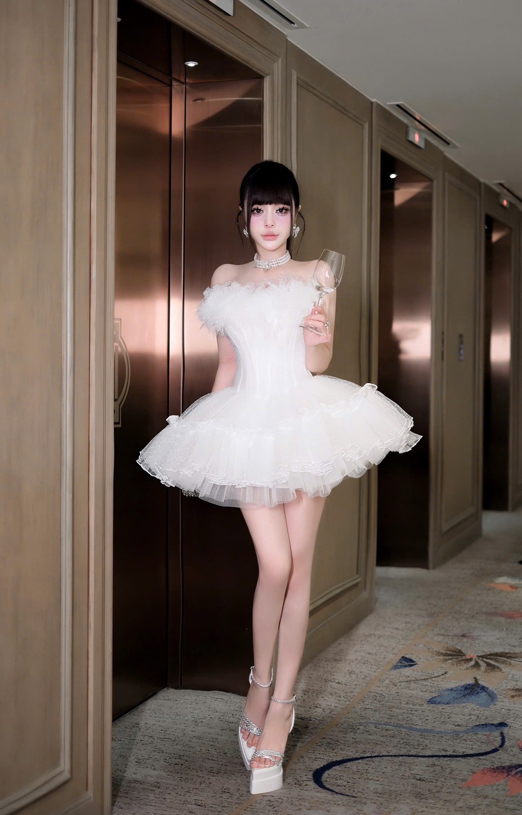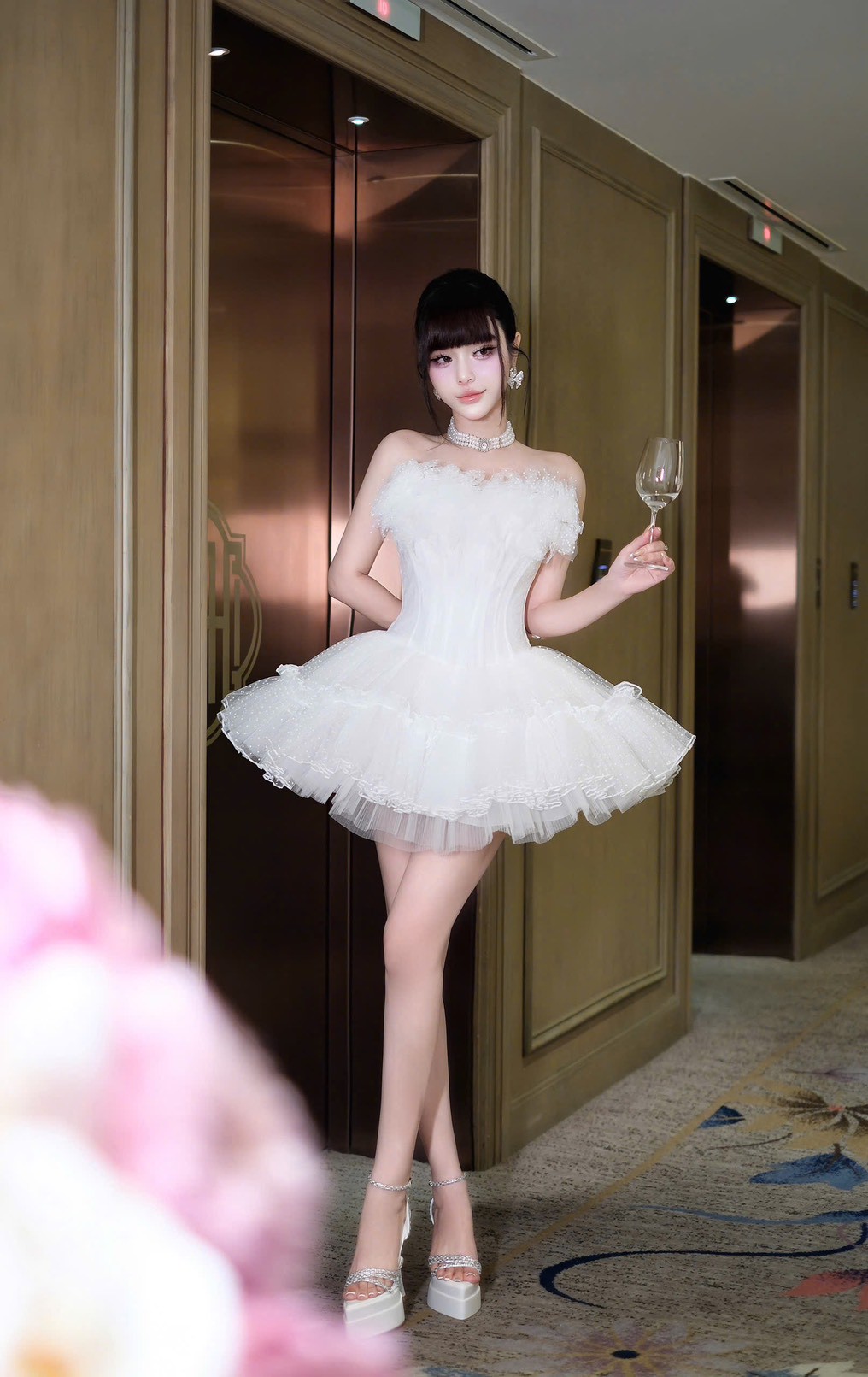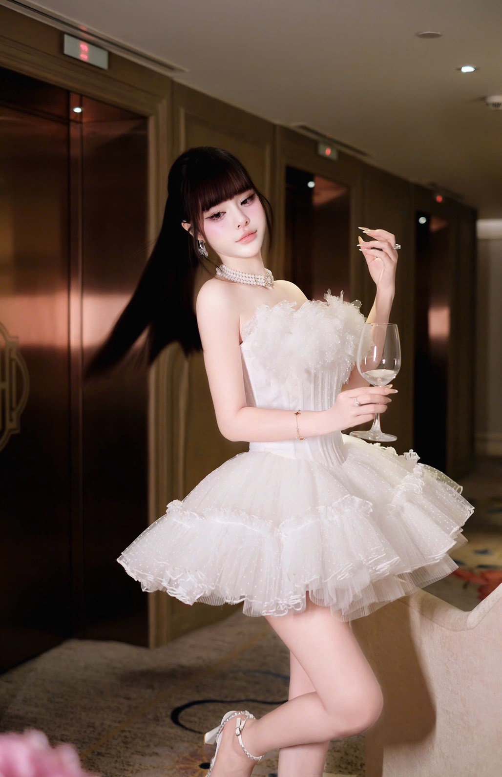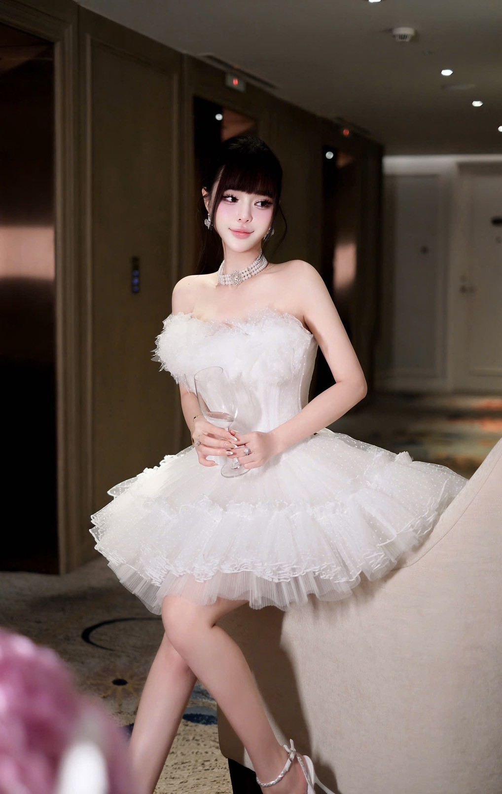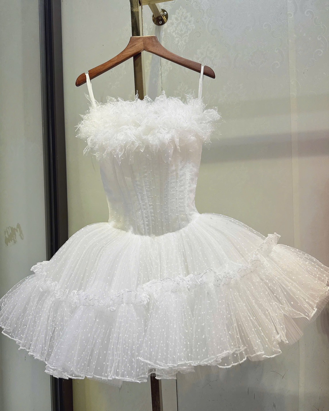 ชุดเดรส เกาะอก แต่งขน สีขาว 2026 Size M