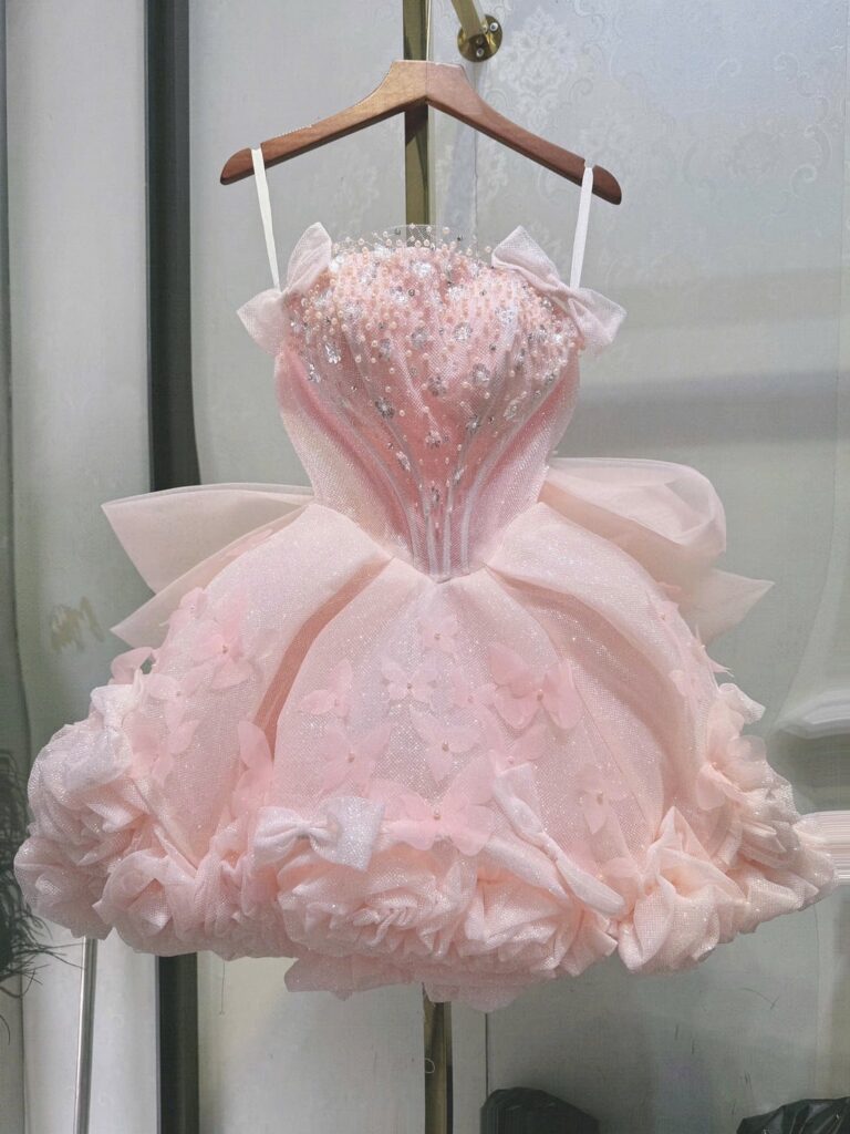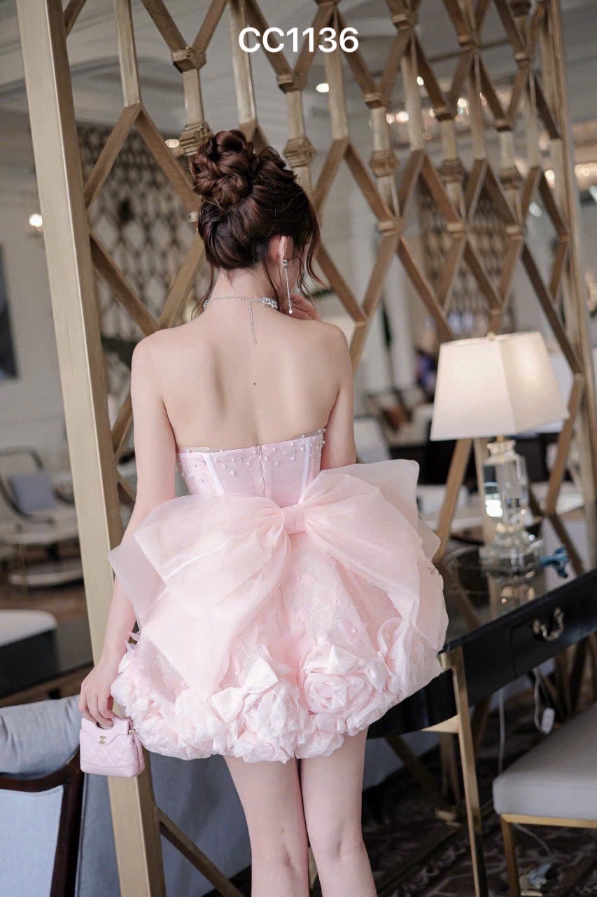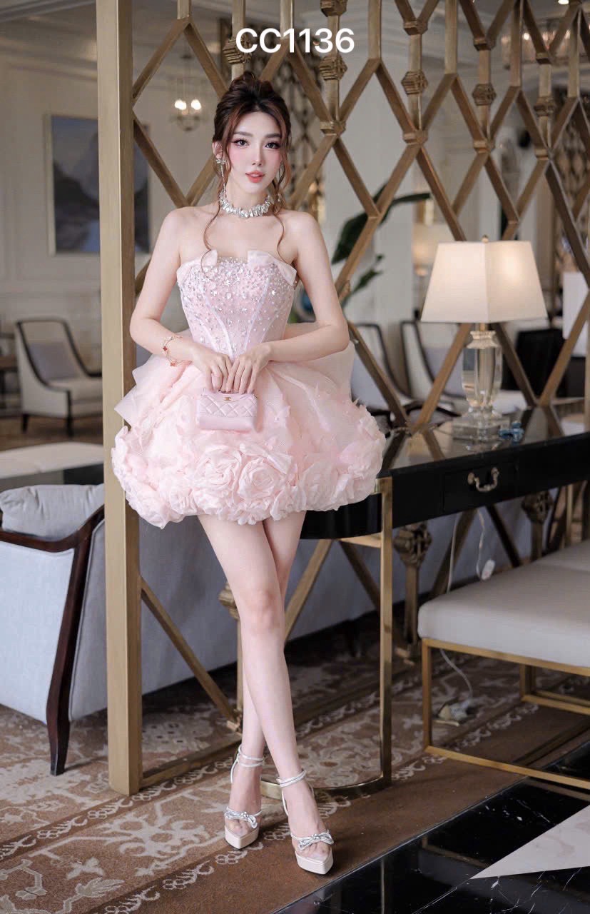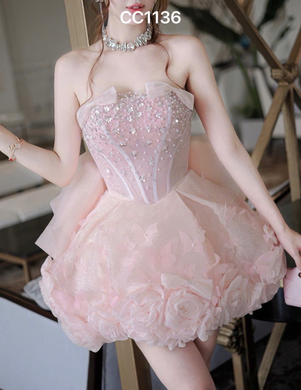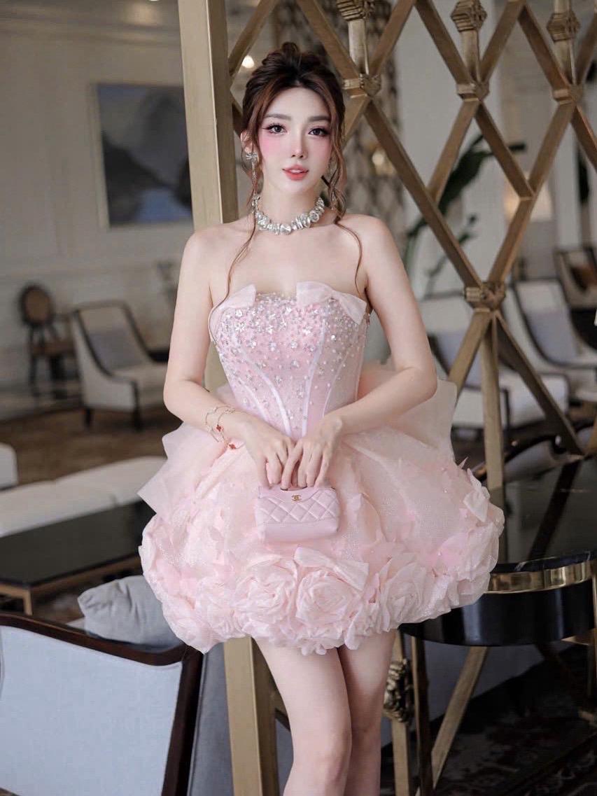 ชุดเดรส เกาะอก แต่งดอก+กลิตเตอร์ สีชมพู 2031 Size M