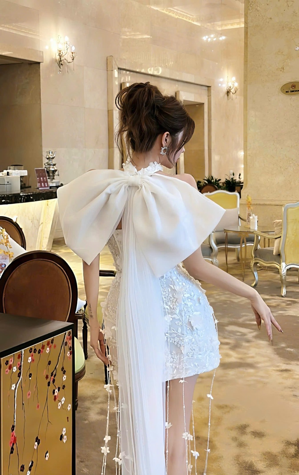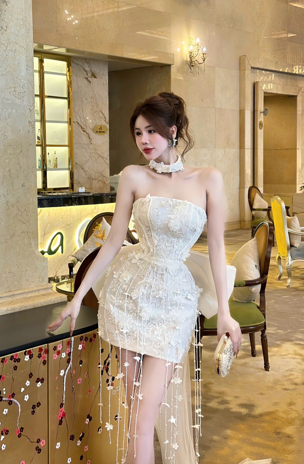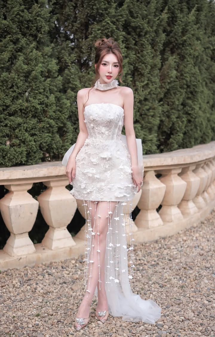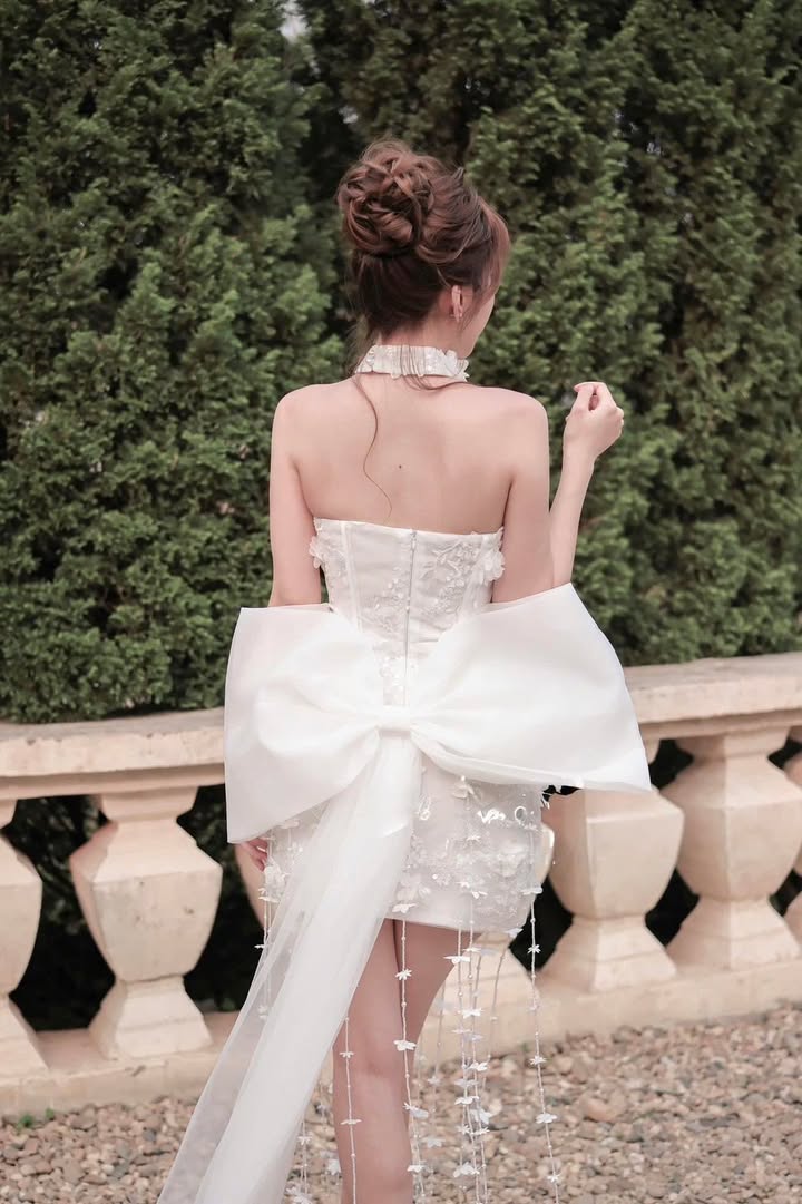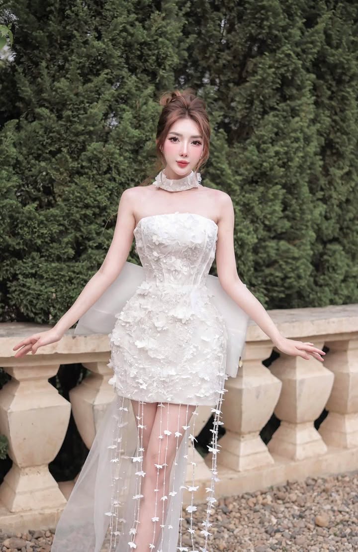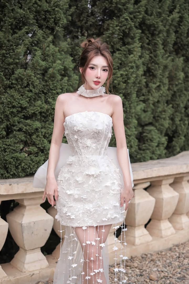 ชุดเดรส เกาะอก แต่งดอก+โบว์ สีขาว 2013 Size S