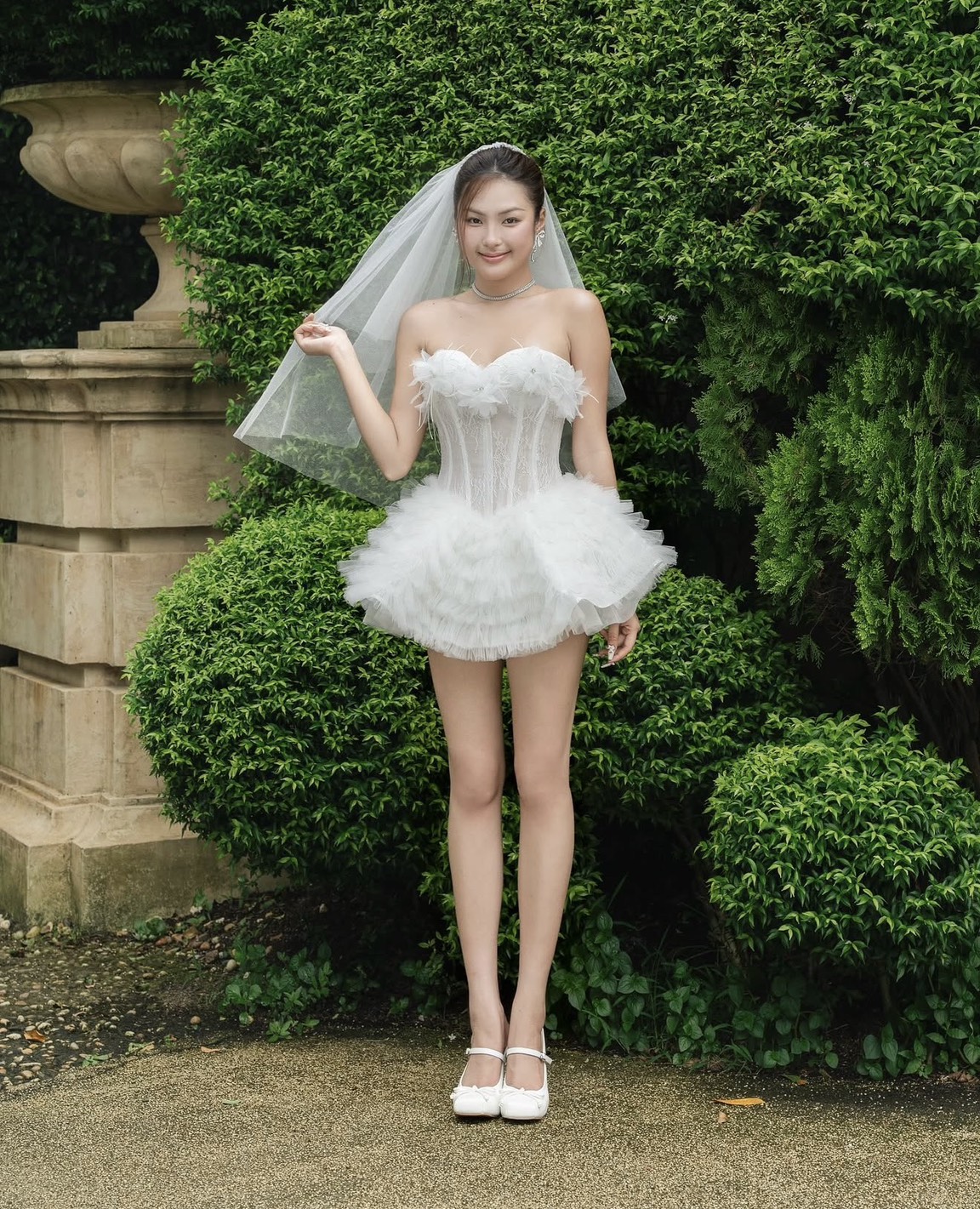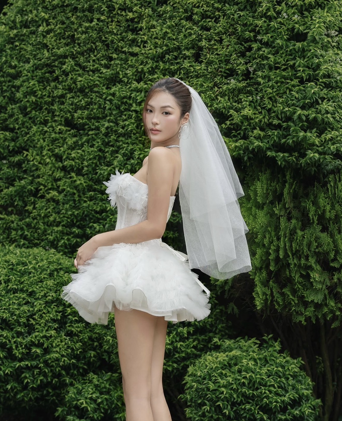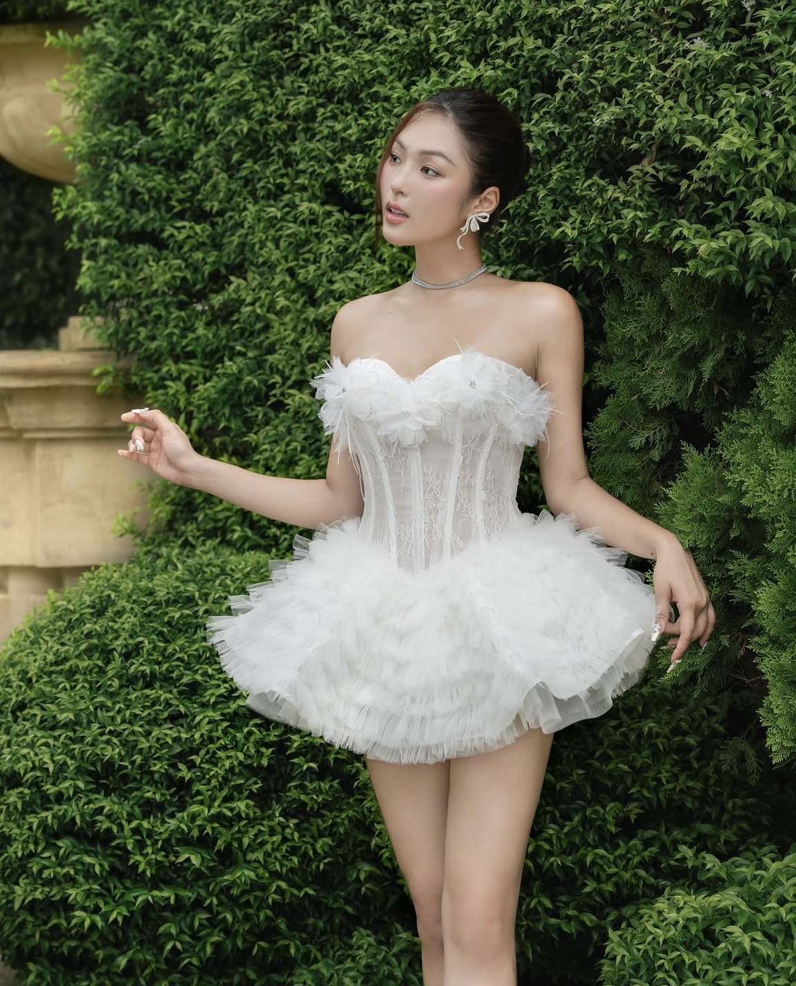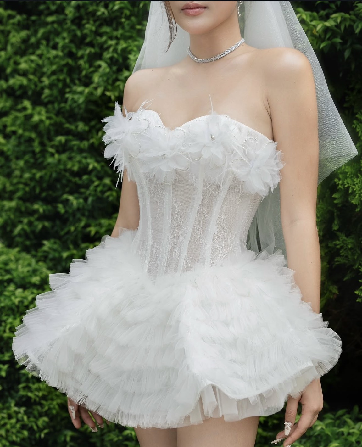 ชุดเดรส เกาะอก แต่งดอก กระโปรงฟู สีขาว LANE CI 2209 Size S-M