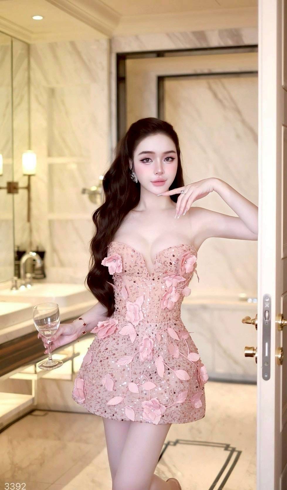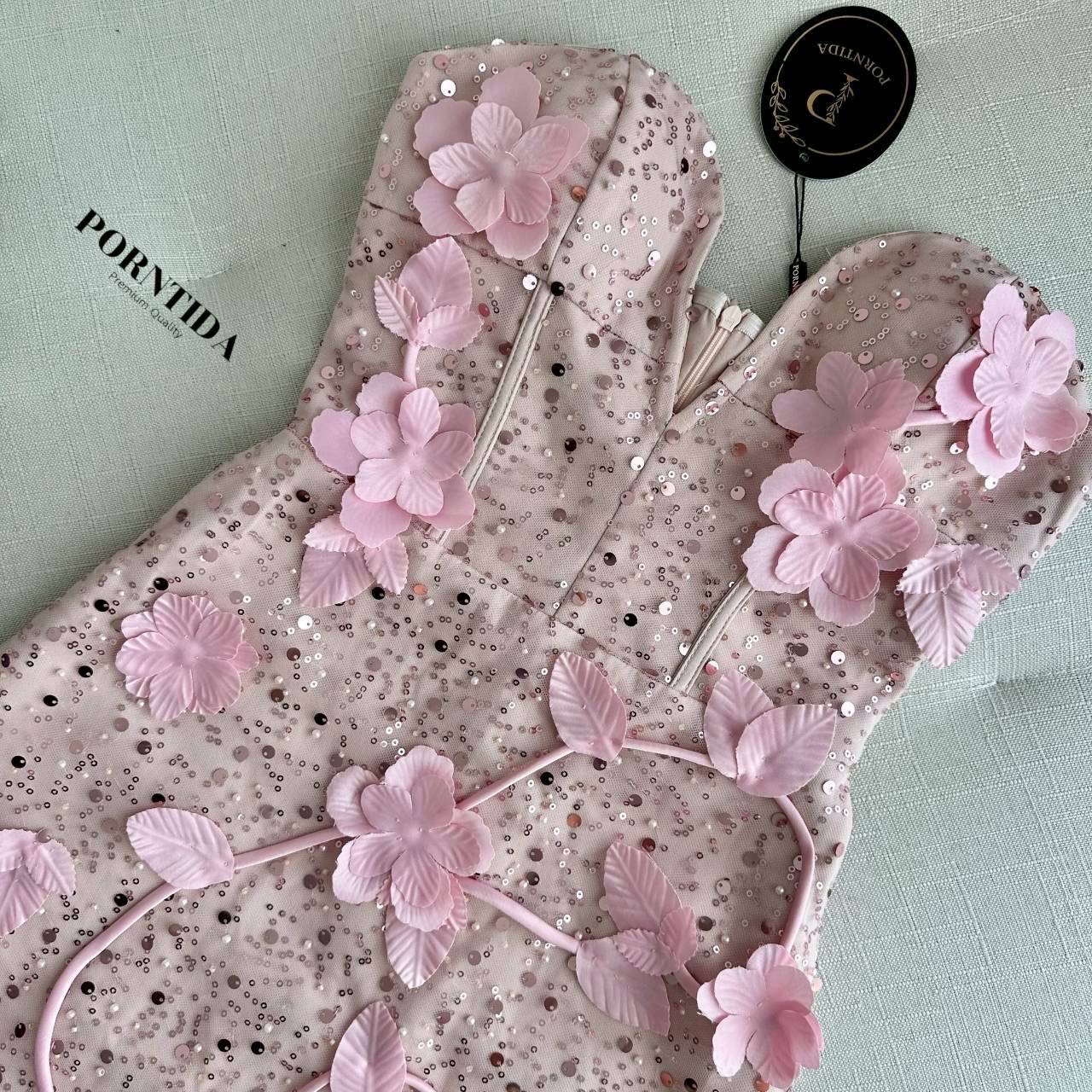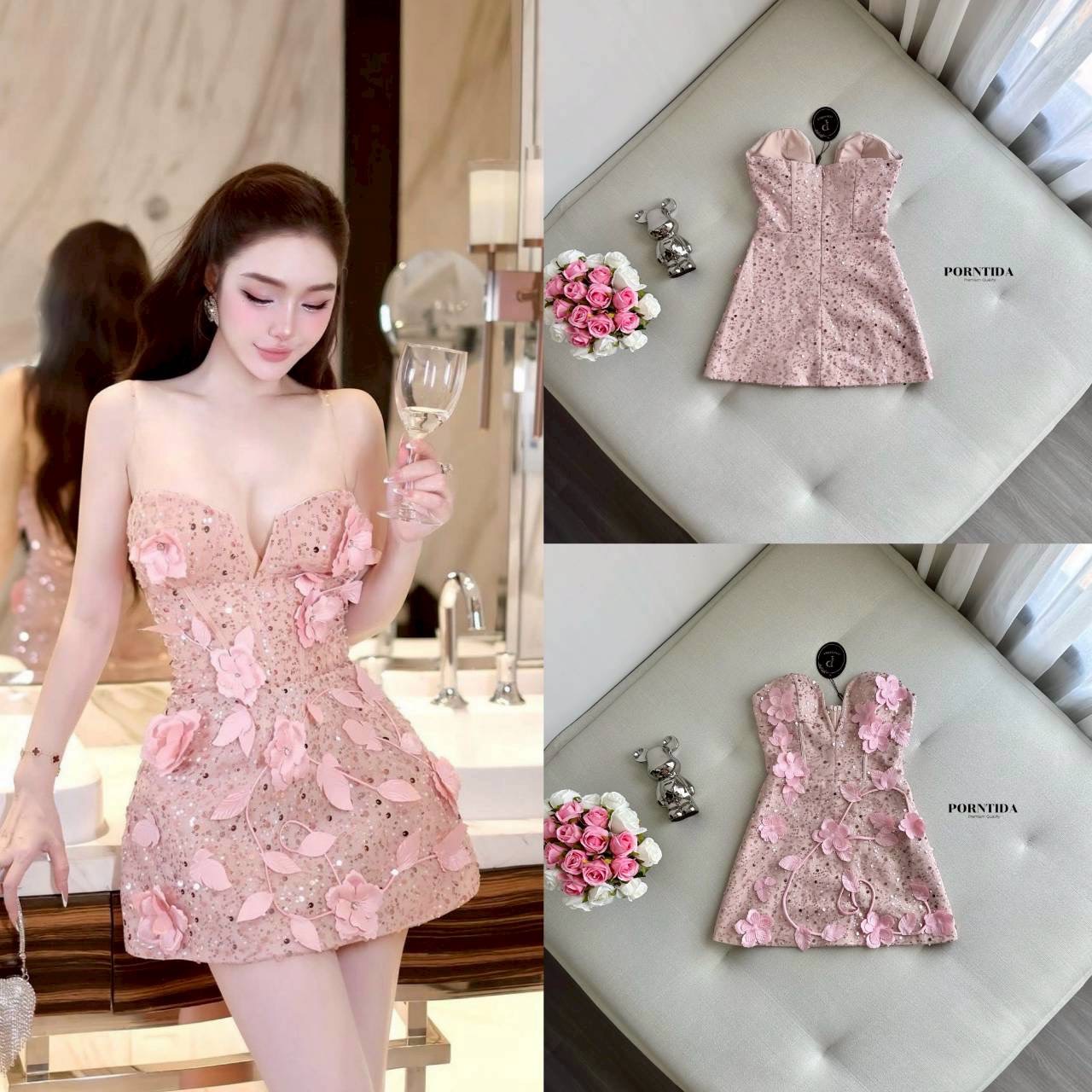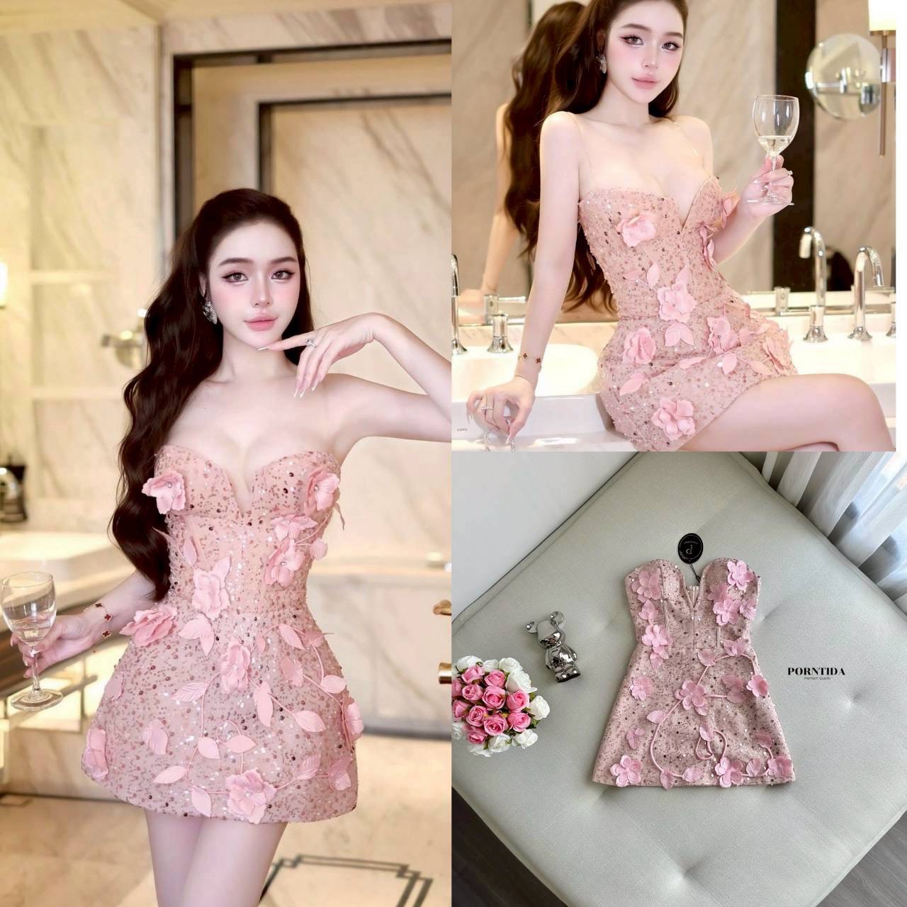 ชุดเดรส เกาะอก แต่งดอก สีชมพู 2027 Size S