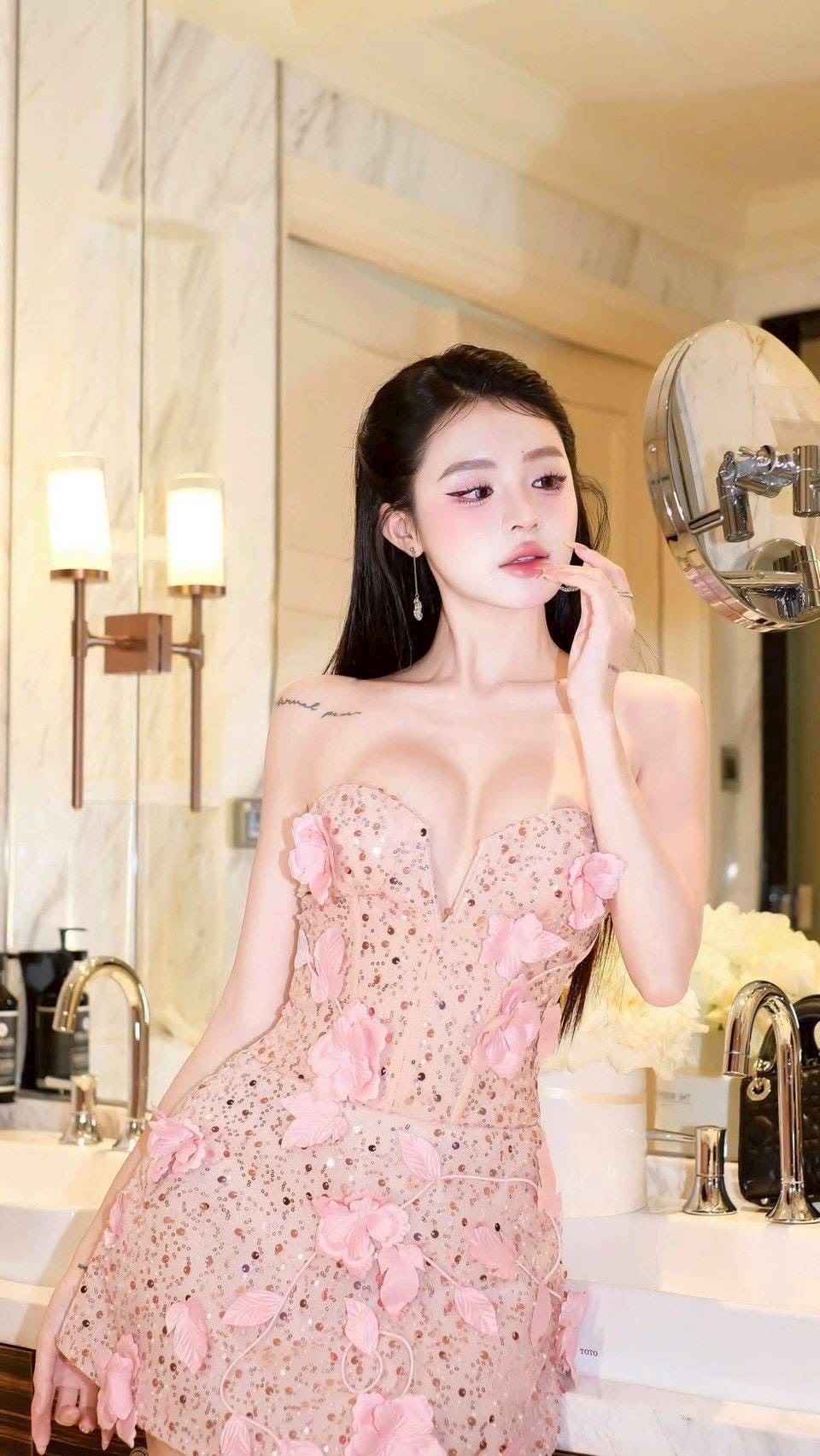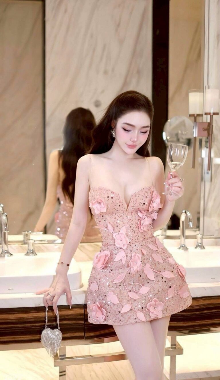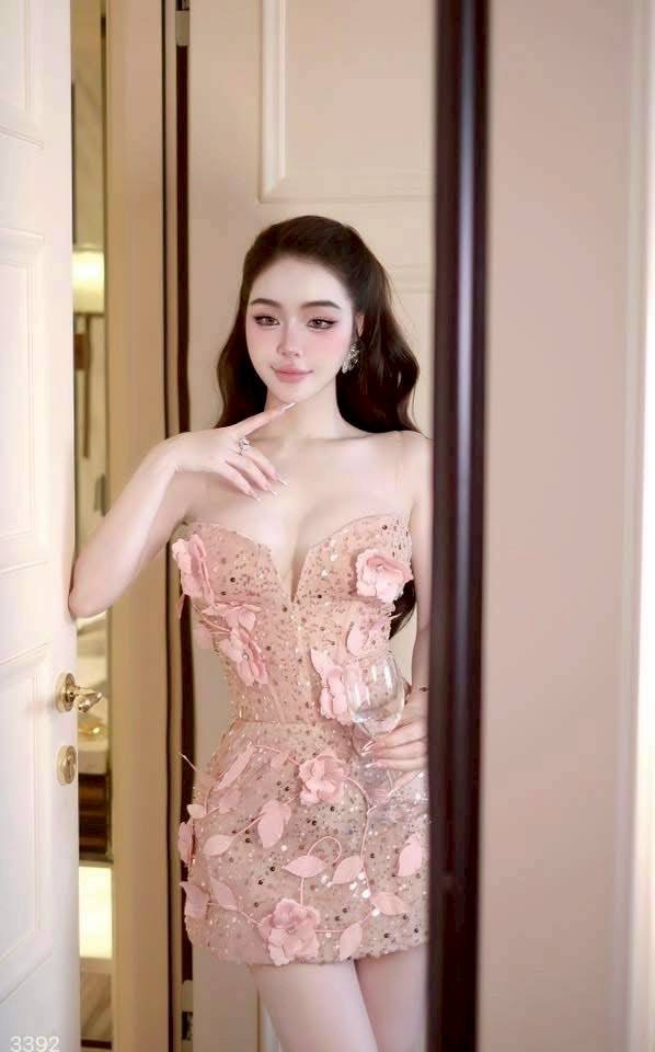 ชุดเดรส เกาะอก แต่งเพชร+ขนนก สีชมพูพาสเทล ม่วง 2024 Size M