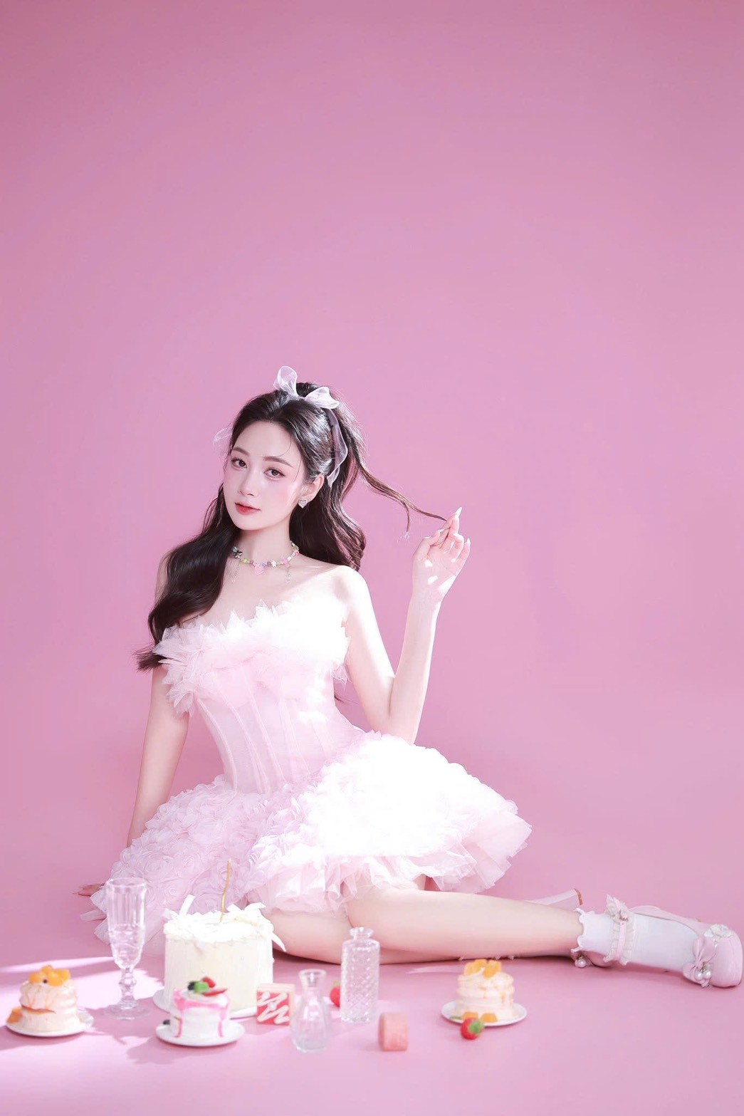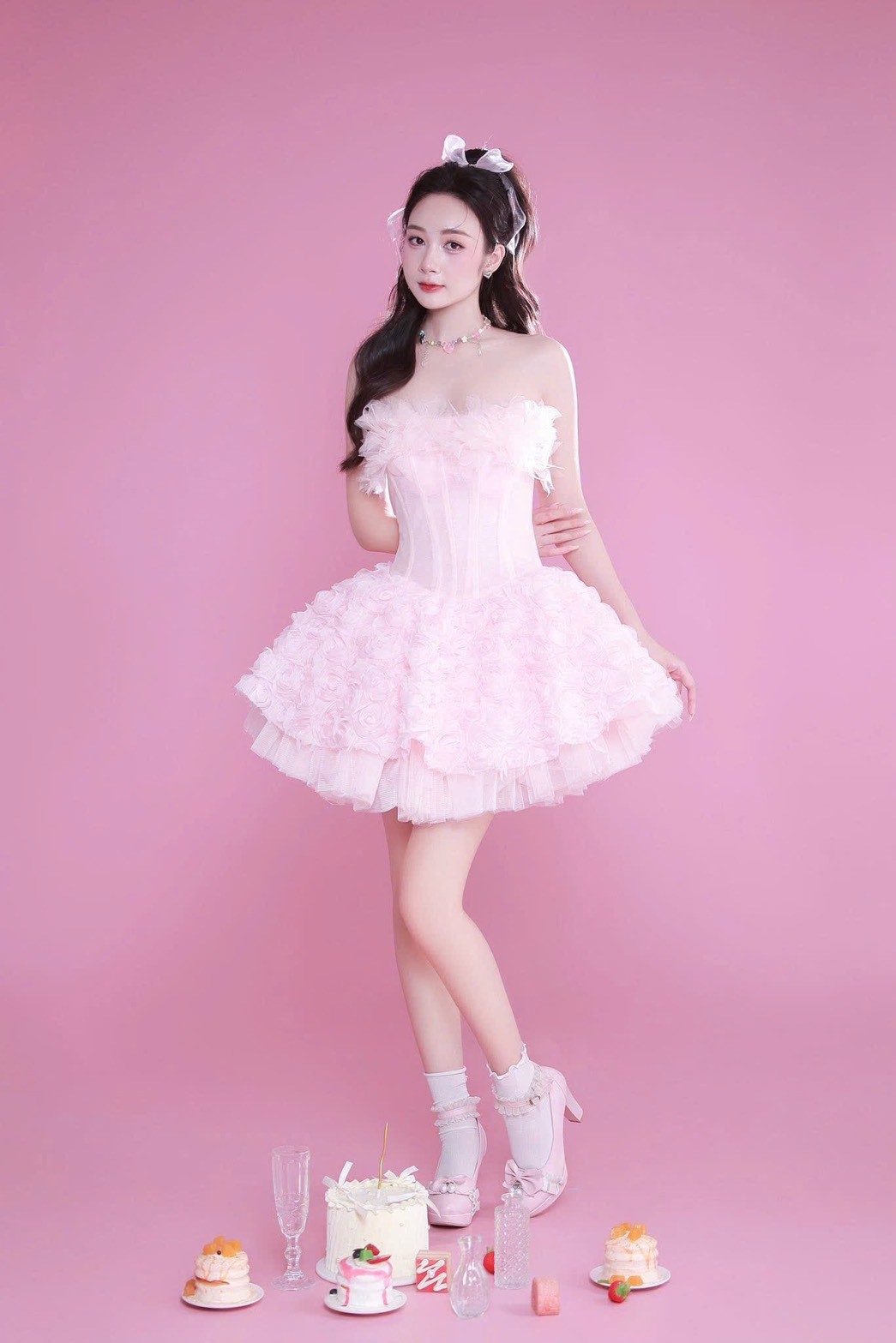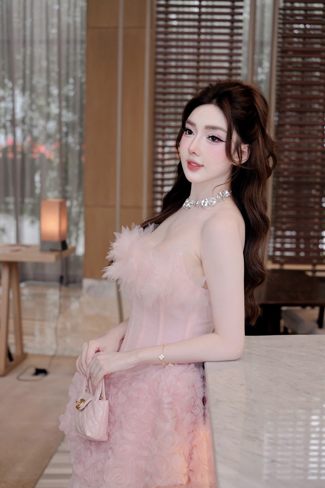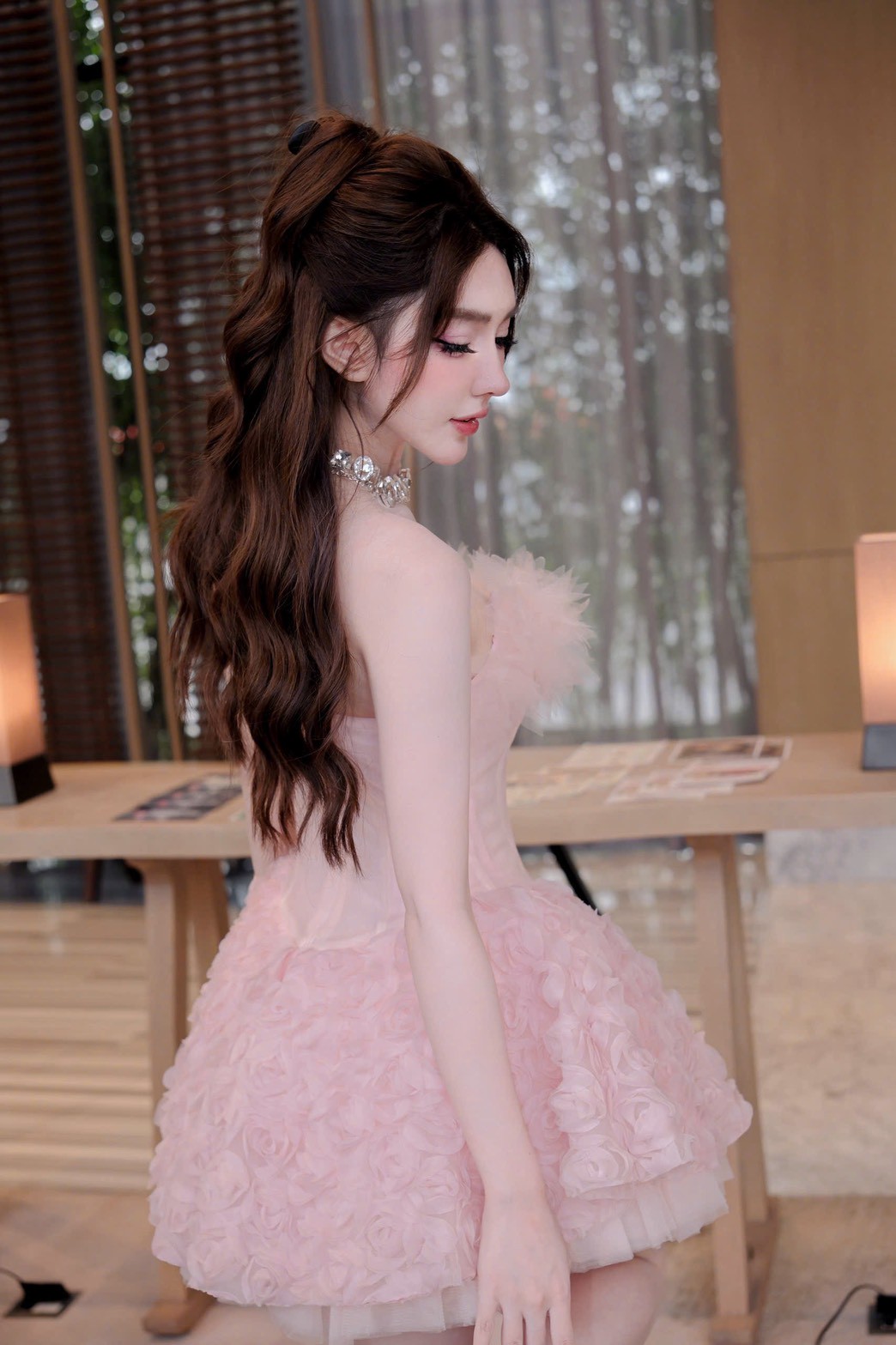 ชุดเดรส เกาะอก แต่งดอก สีชมพู 2027 Size S