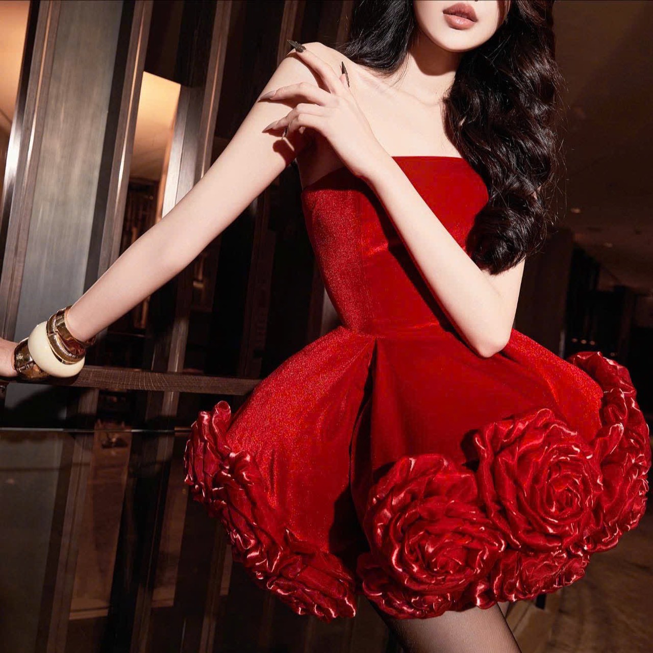 ชุดเดรส เกาะอก แต่งดอก สีแดง 2001 Size M