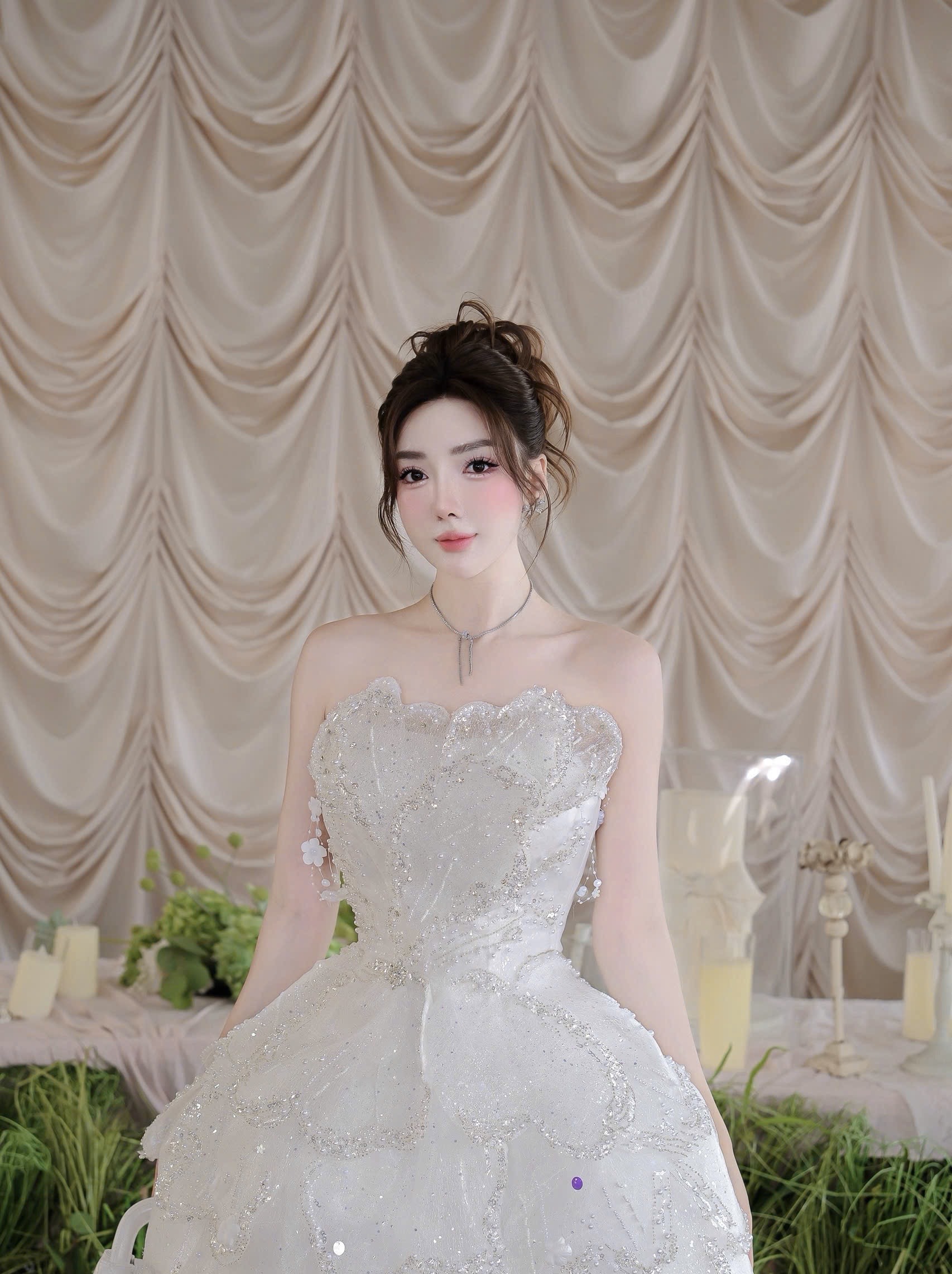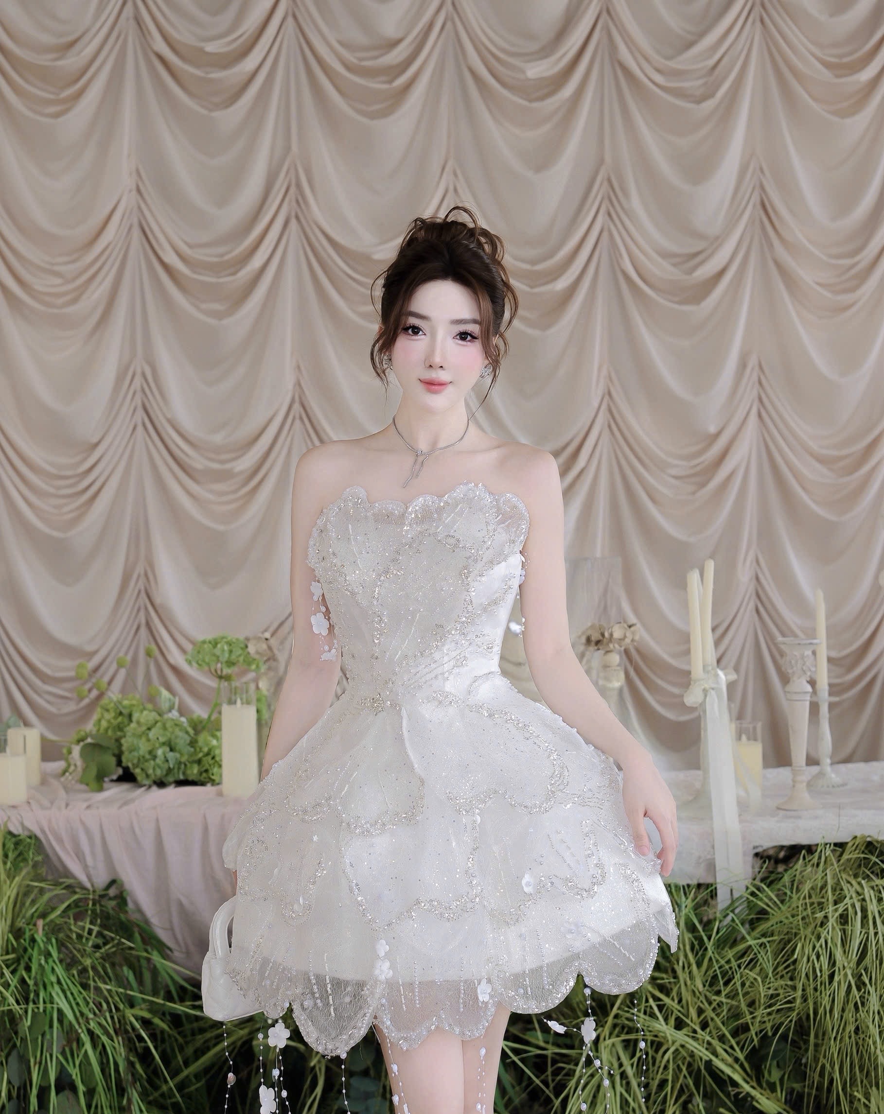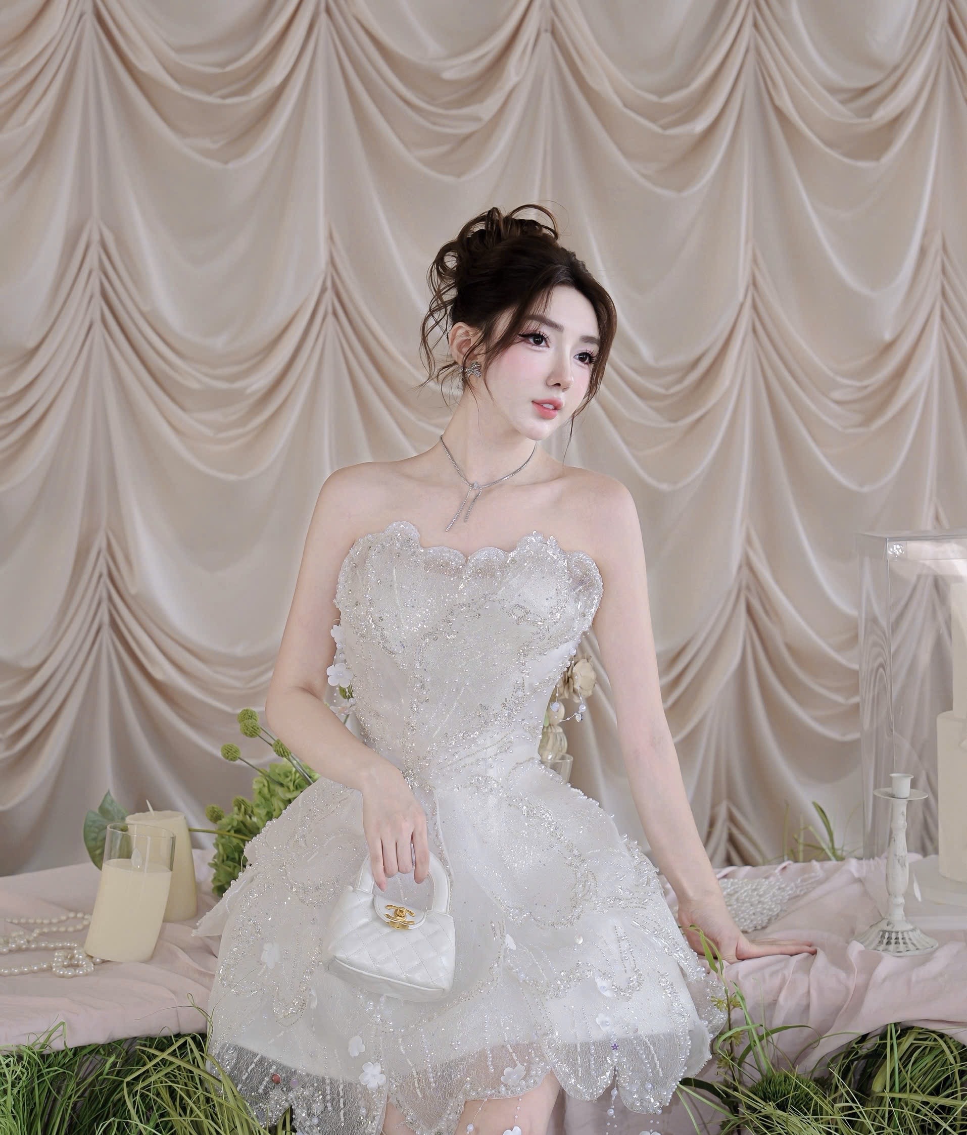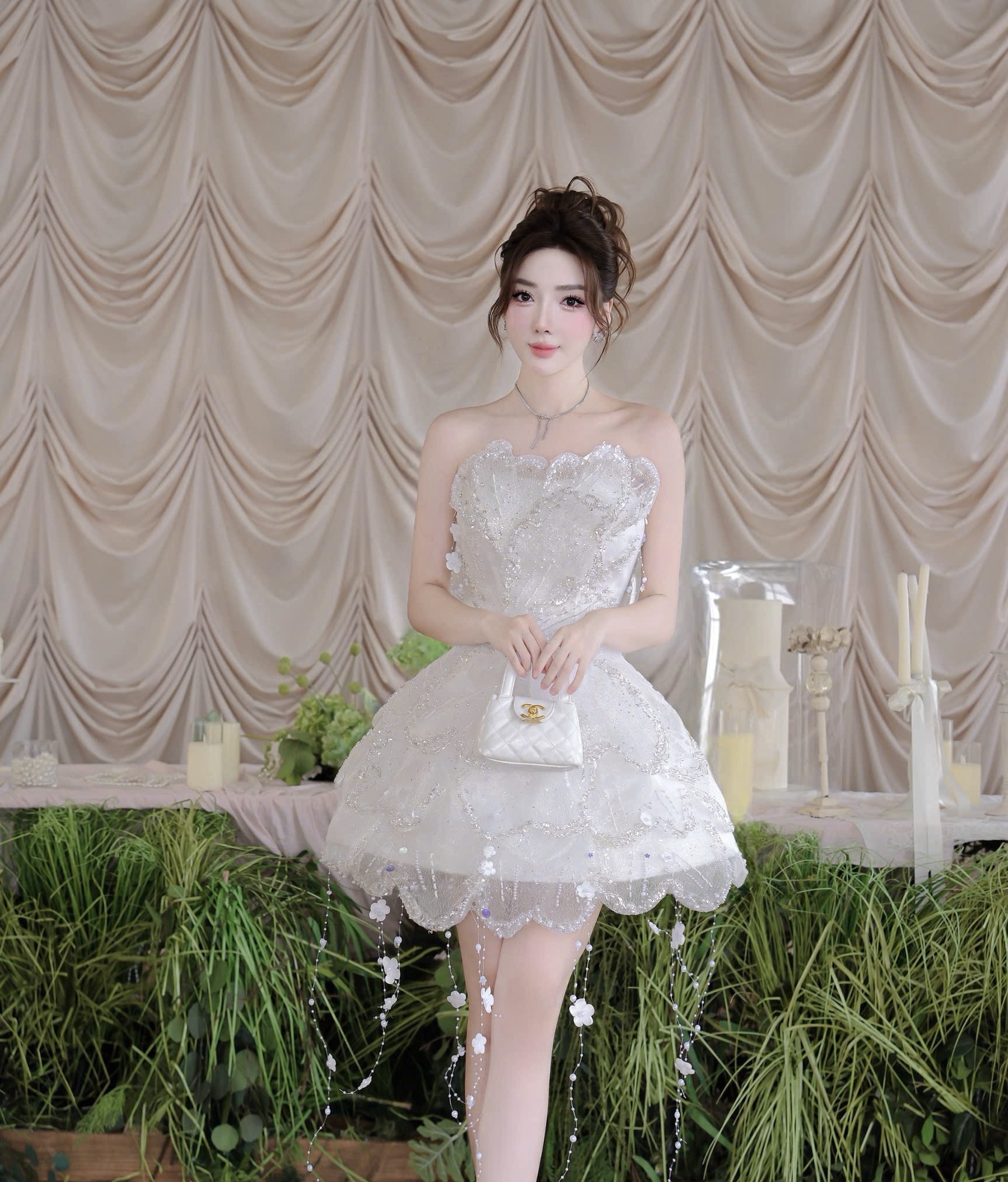 ชุดเดรส เกาะอก แต่งมุก+กลิตเตอร์ สีขาว 2039 Size M