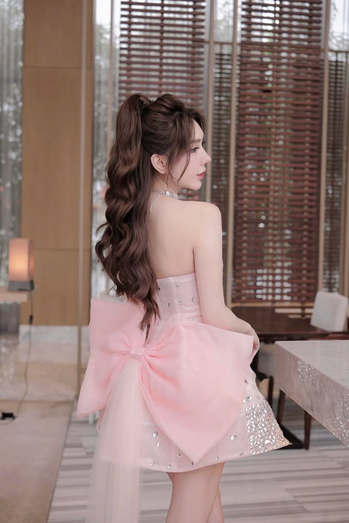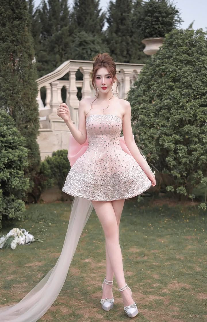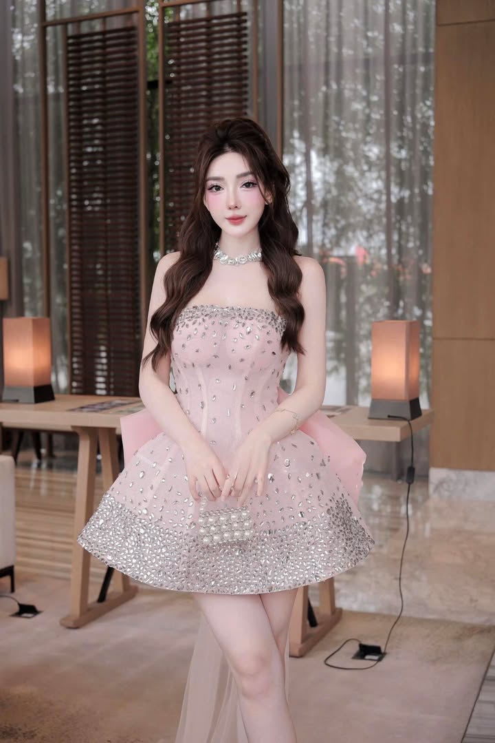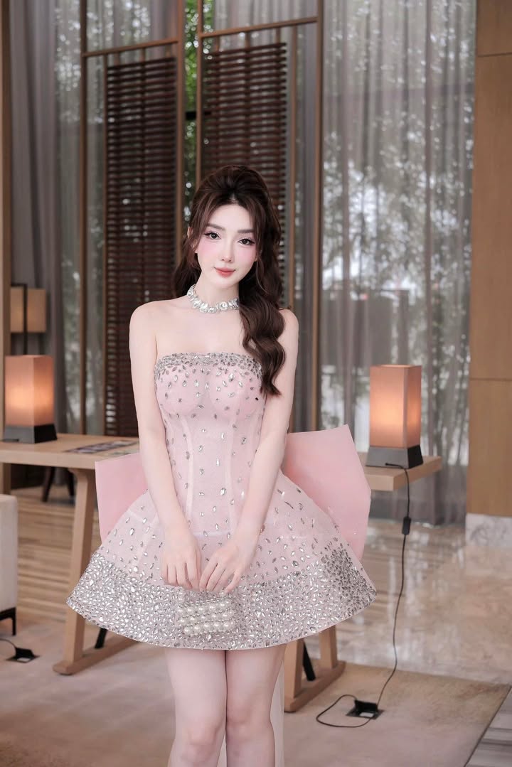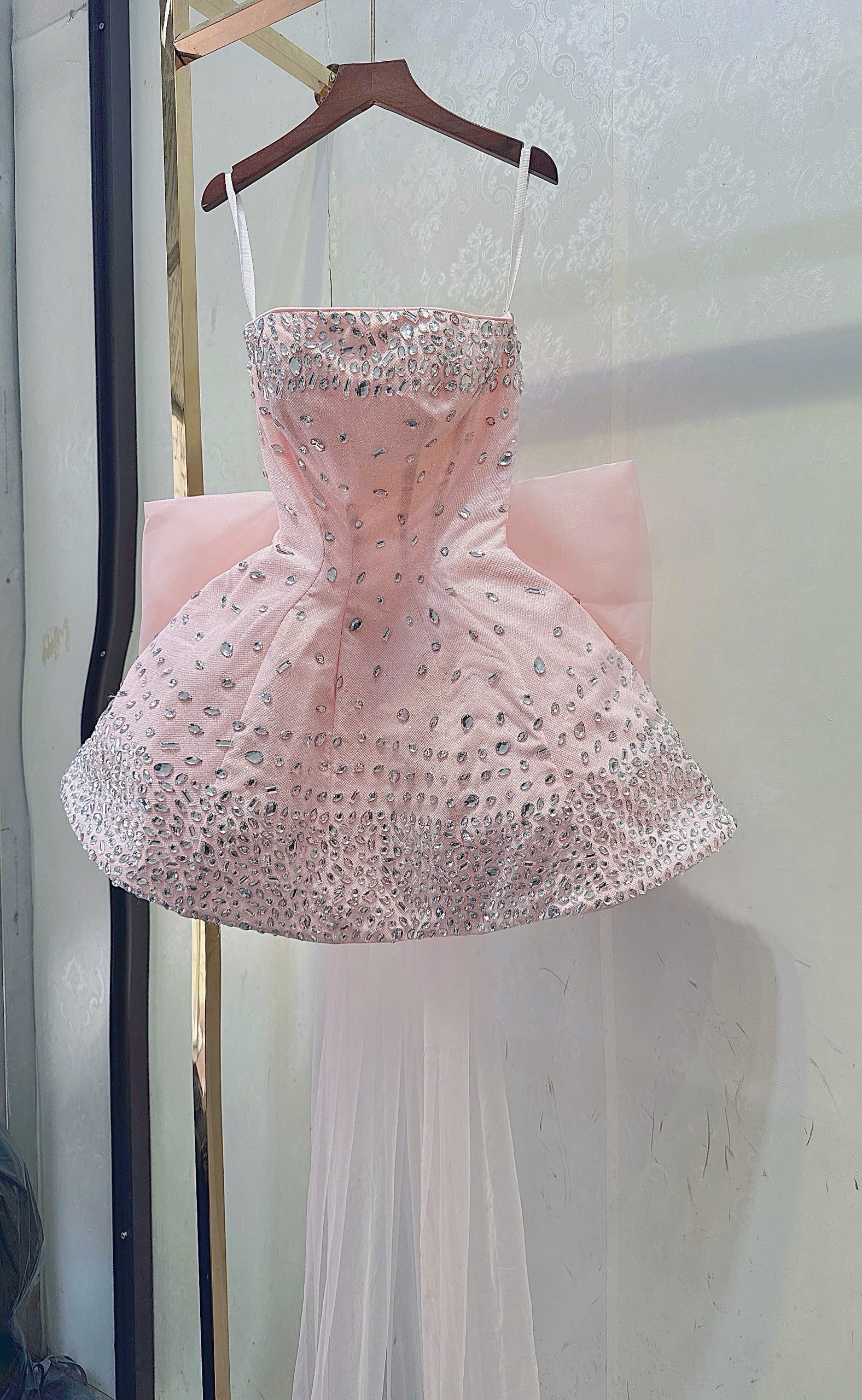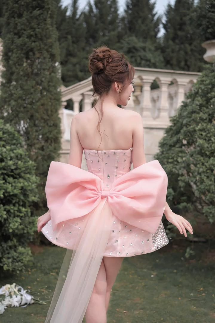 ชุดเดรส เกาะอก แต่งเพชรกลิตเตอร์+โบว์ สีชมพู 2034 Size S