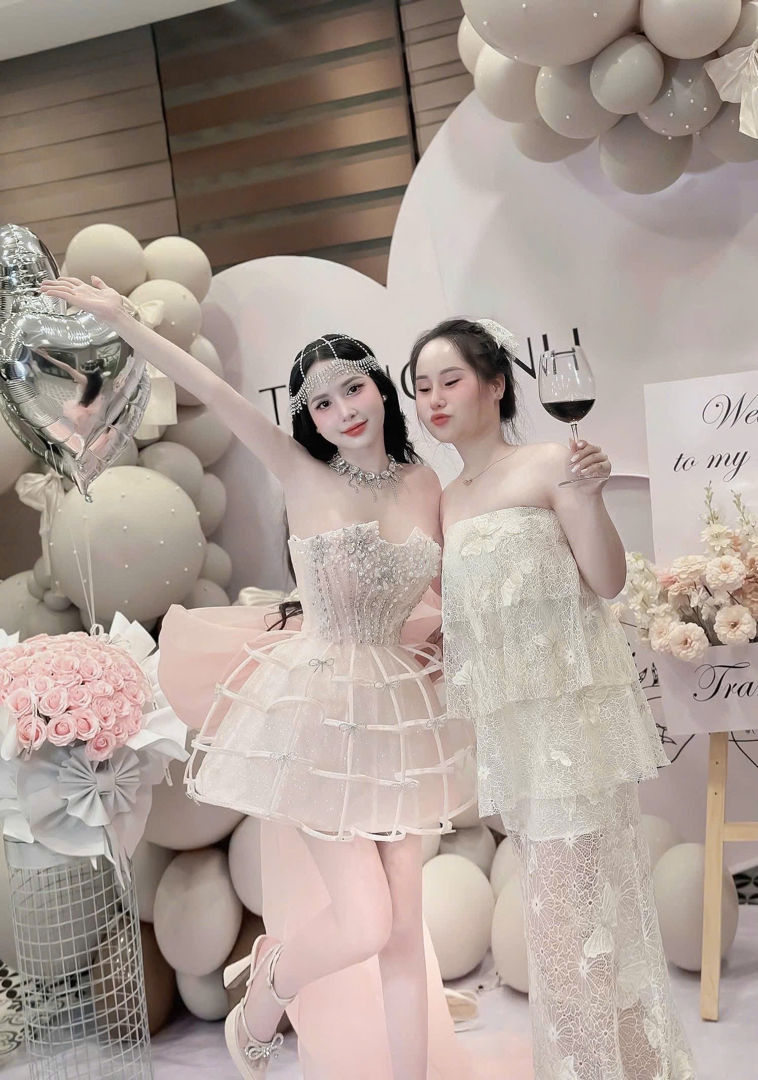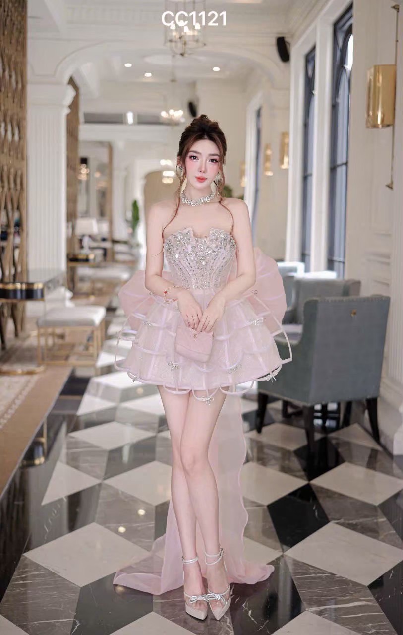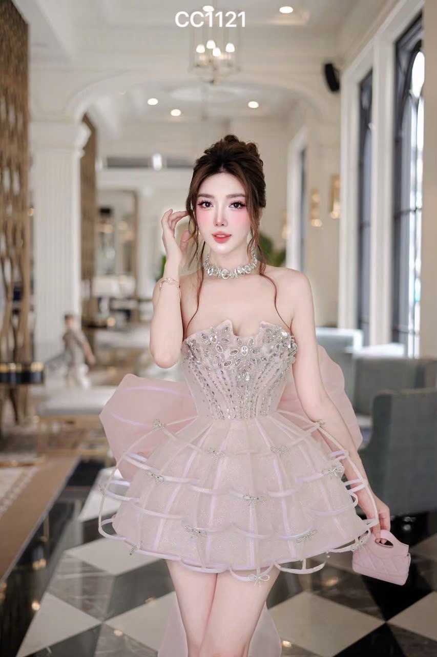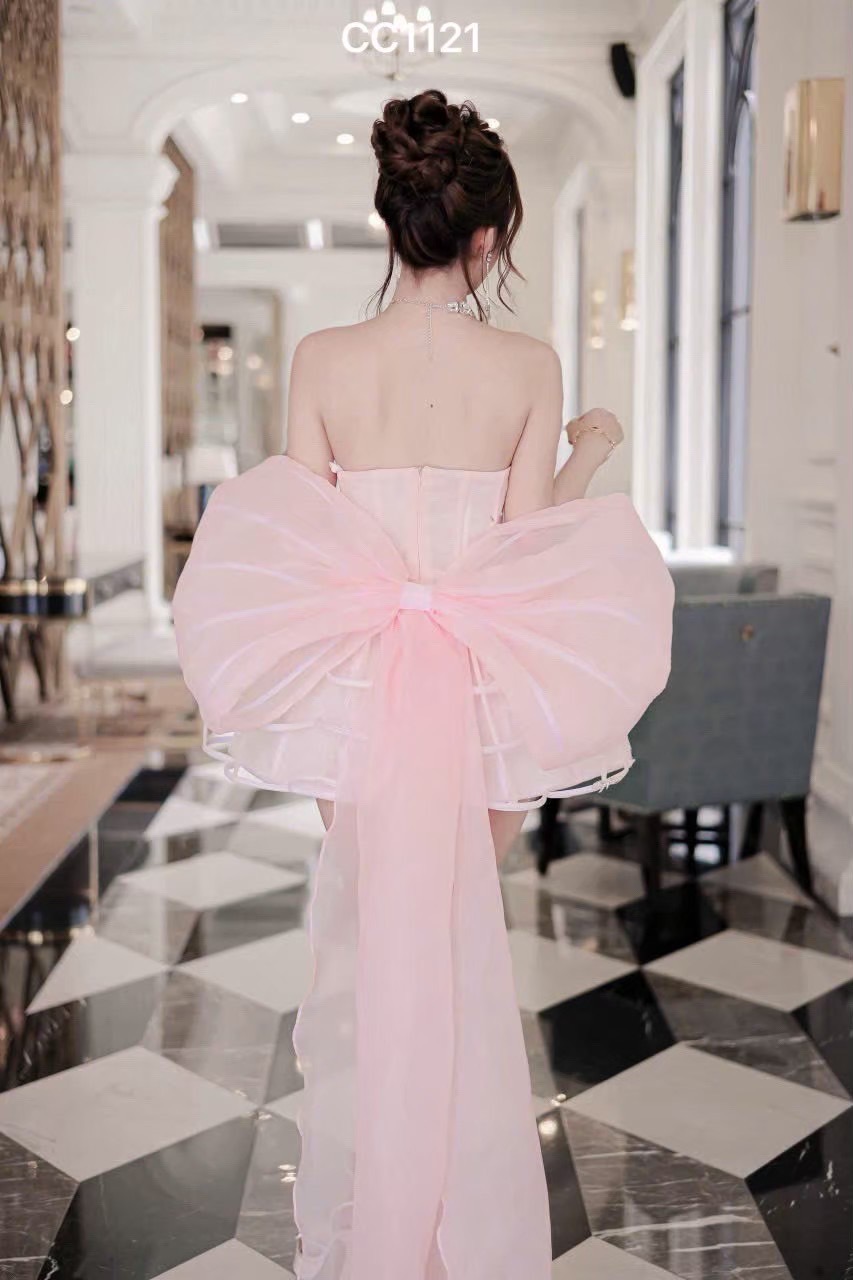 ชุดเดรส เกาะอก แต่งเพชร+โบว์ สีชมพู 2050 Size S