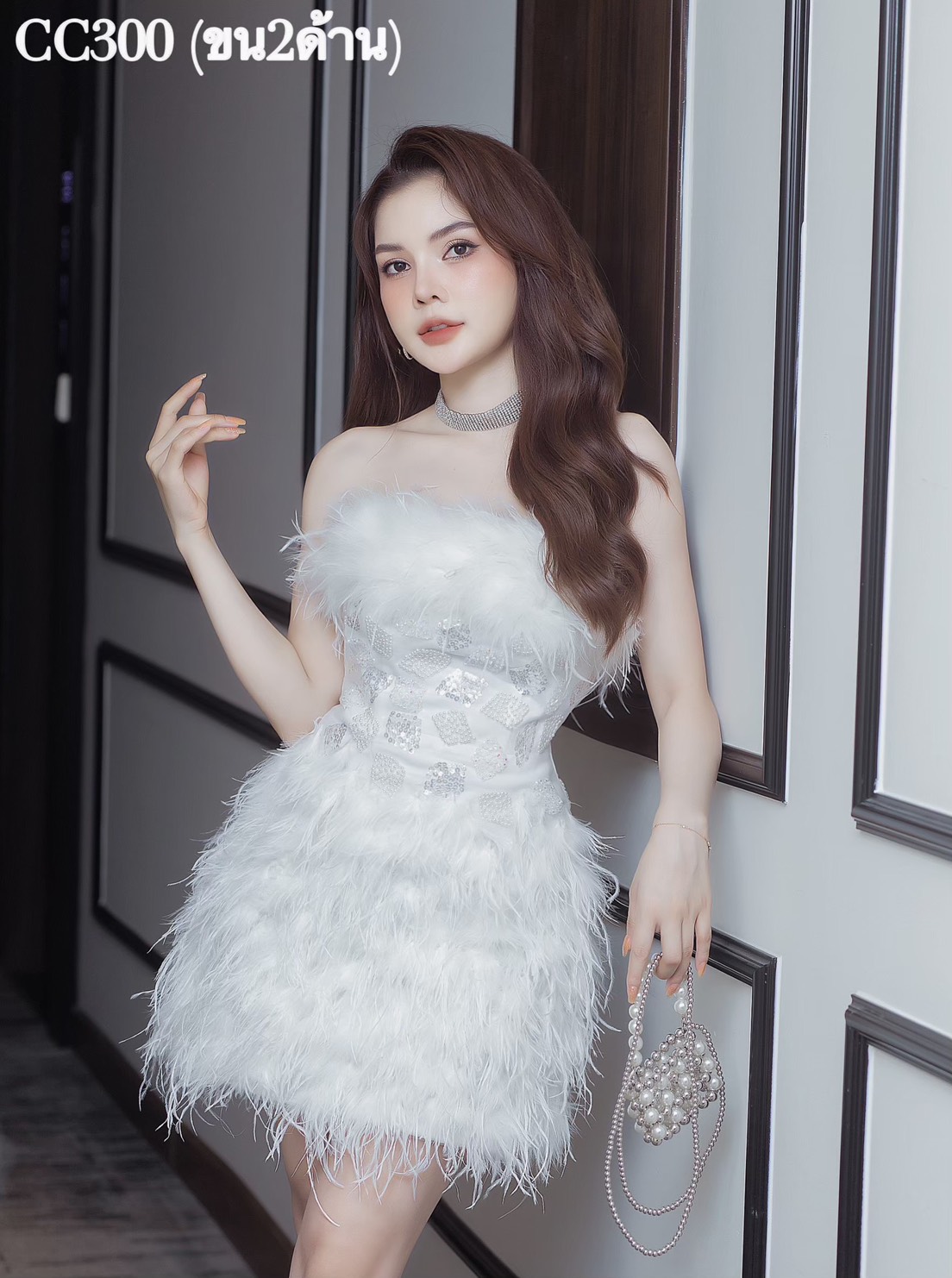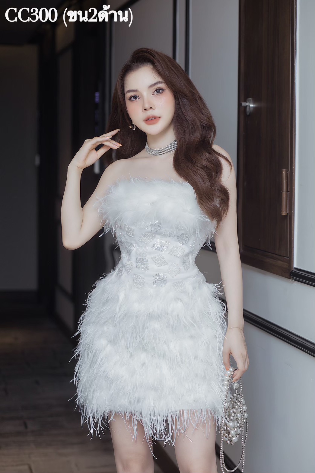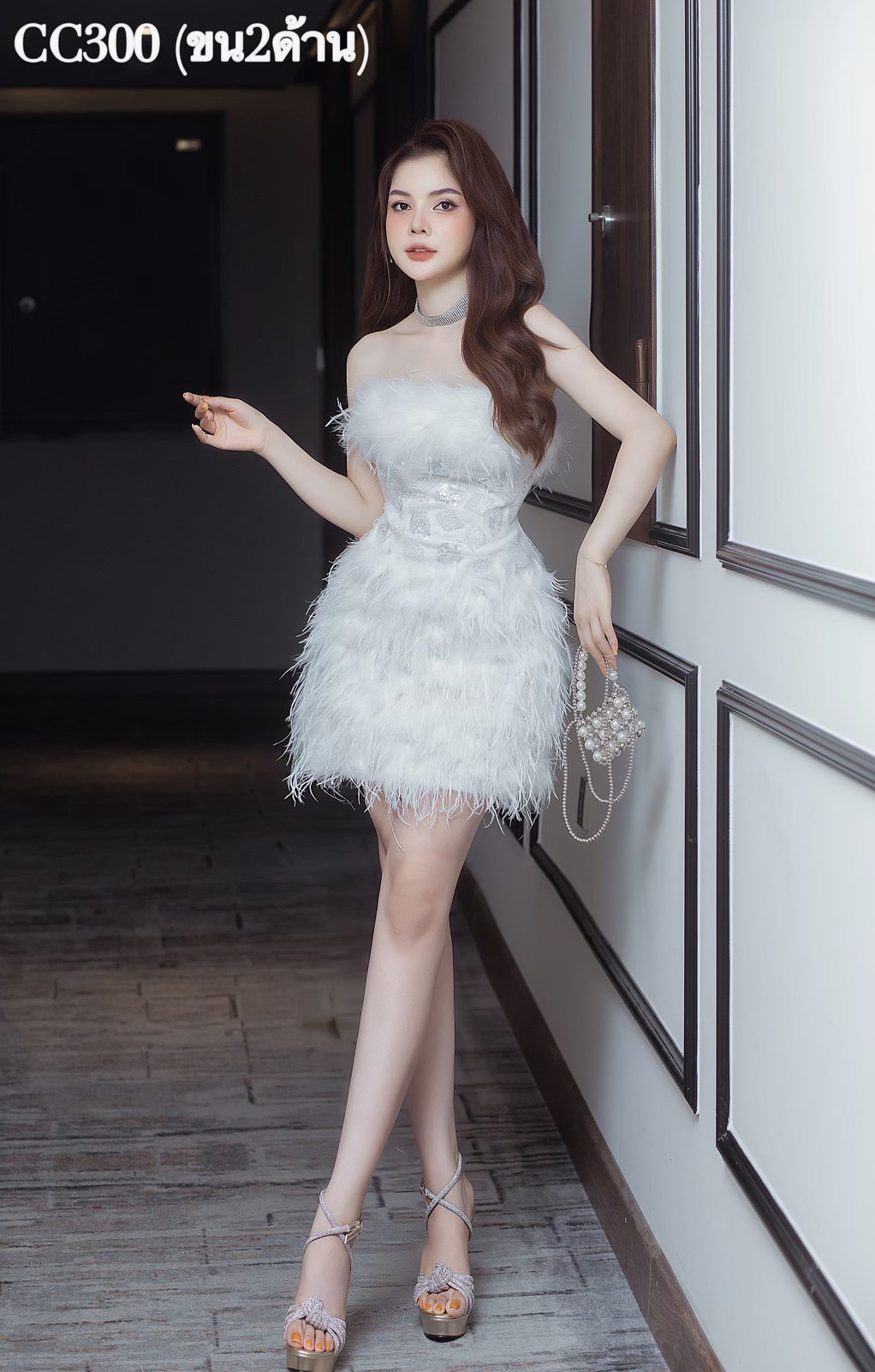 ชุดเดรส เกาะอก แต่งเพชร+ขน สีขาว 2075 Size M