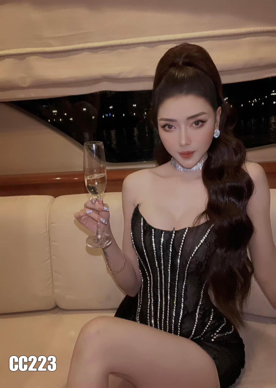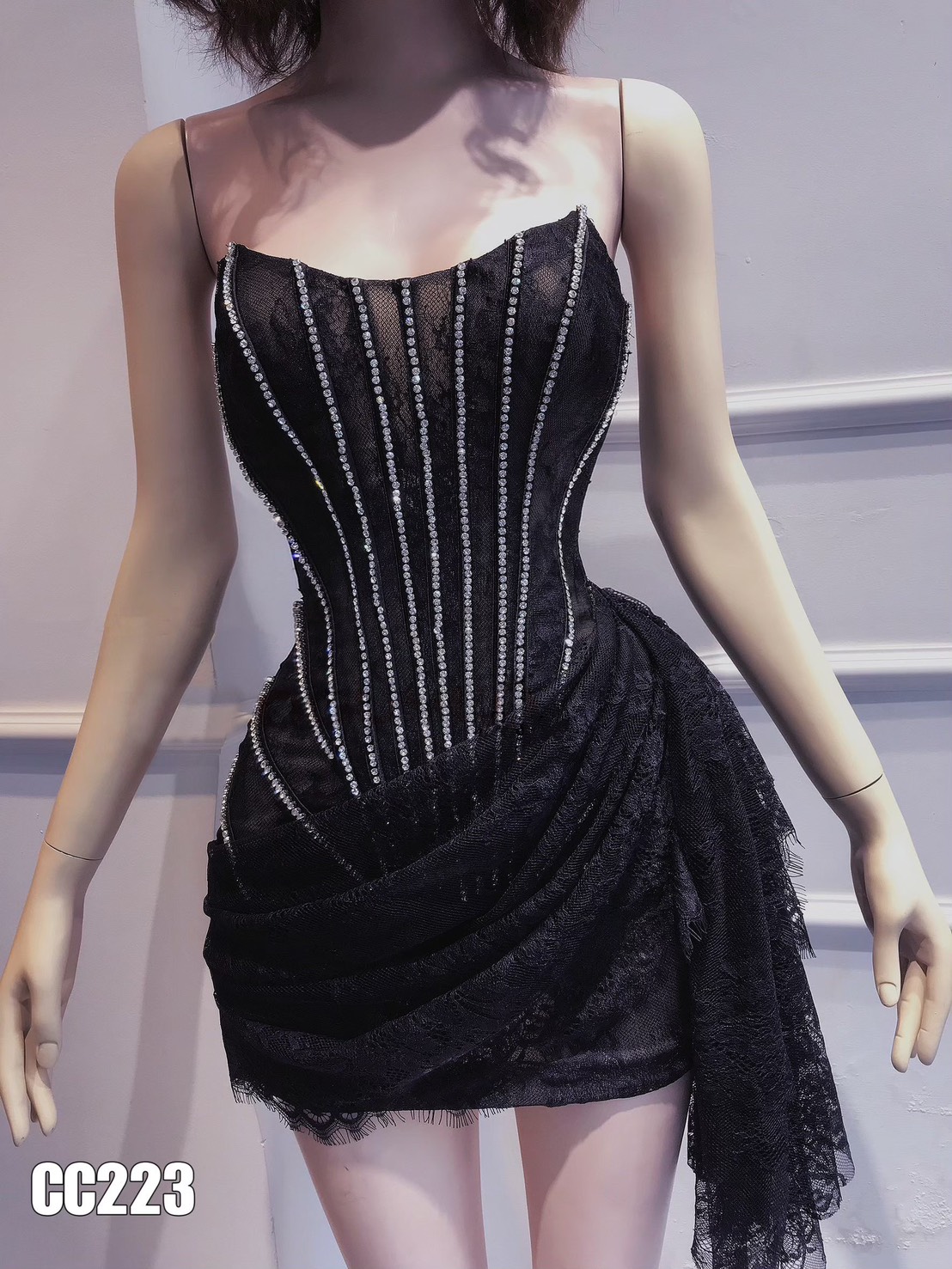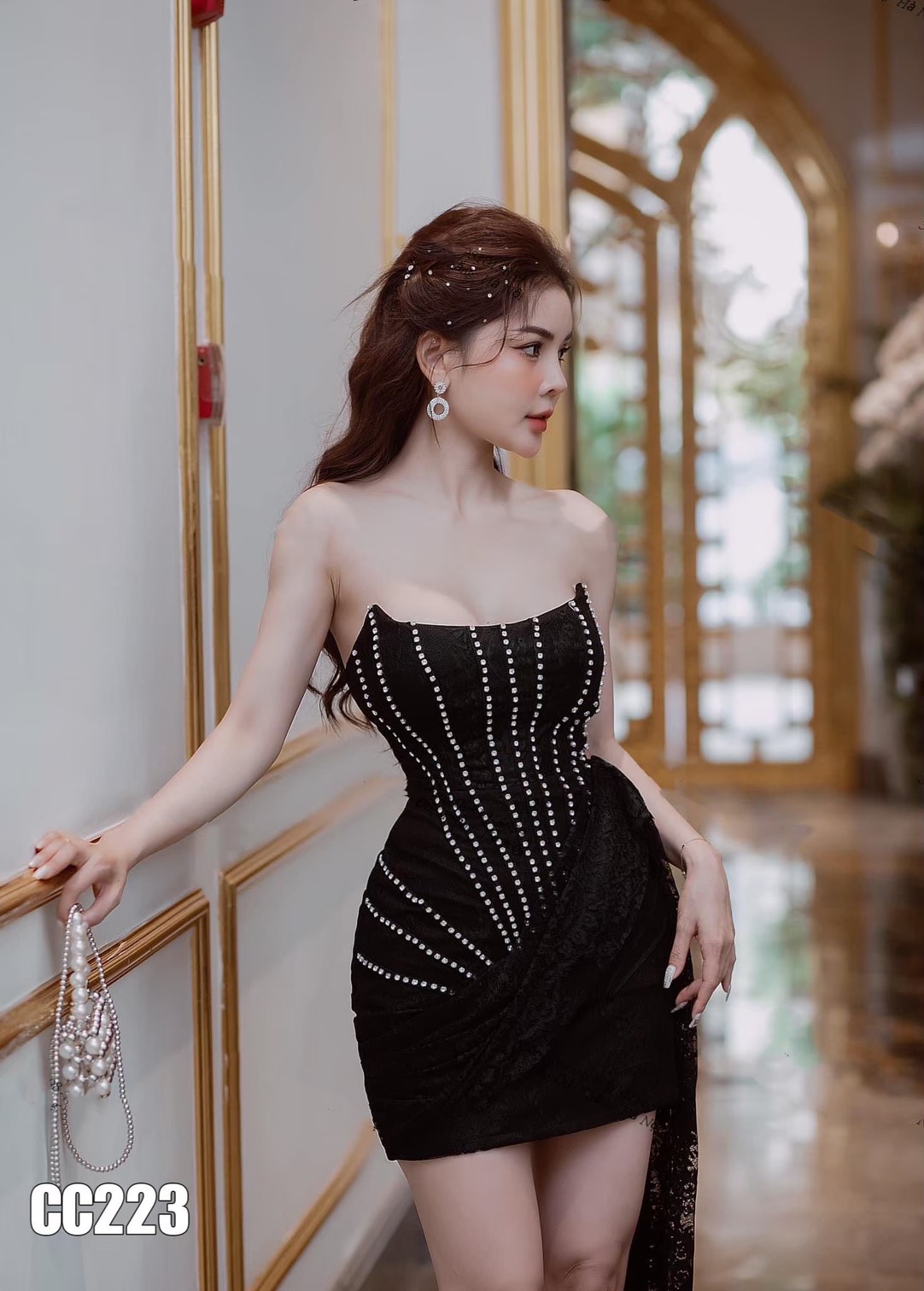 ชุดเดรส เกาะอก แต่งเพชร สีดำ 2125 Size M