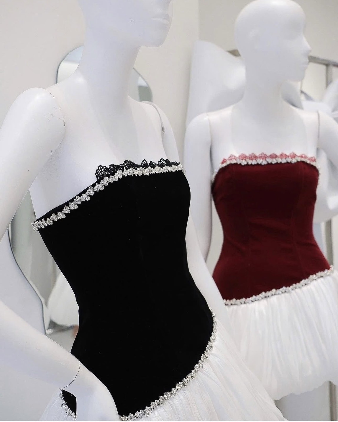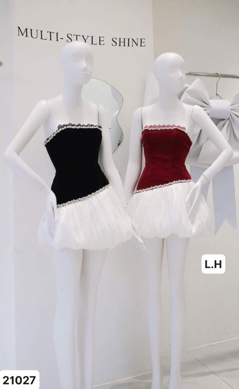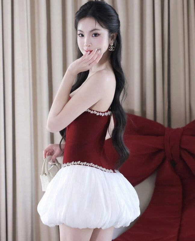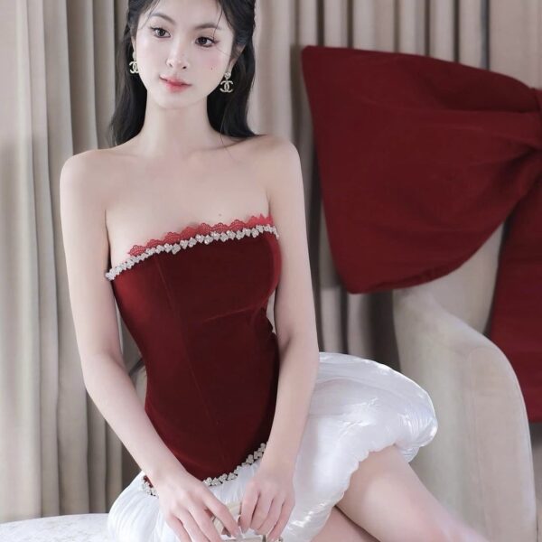 ชุดเดรส เกาะอก แต่งเพชร สีแดง Brand เวียดนามแท้ 2147 Size S-M